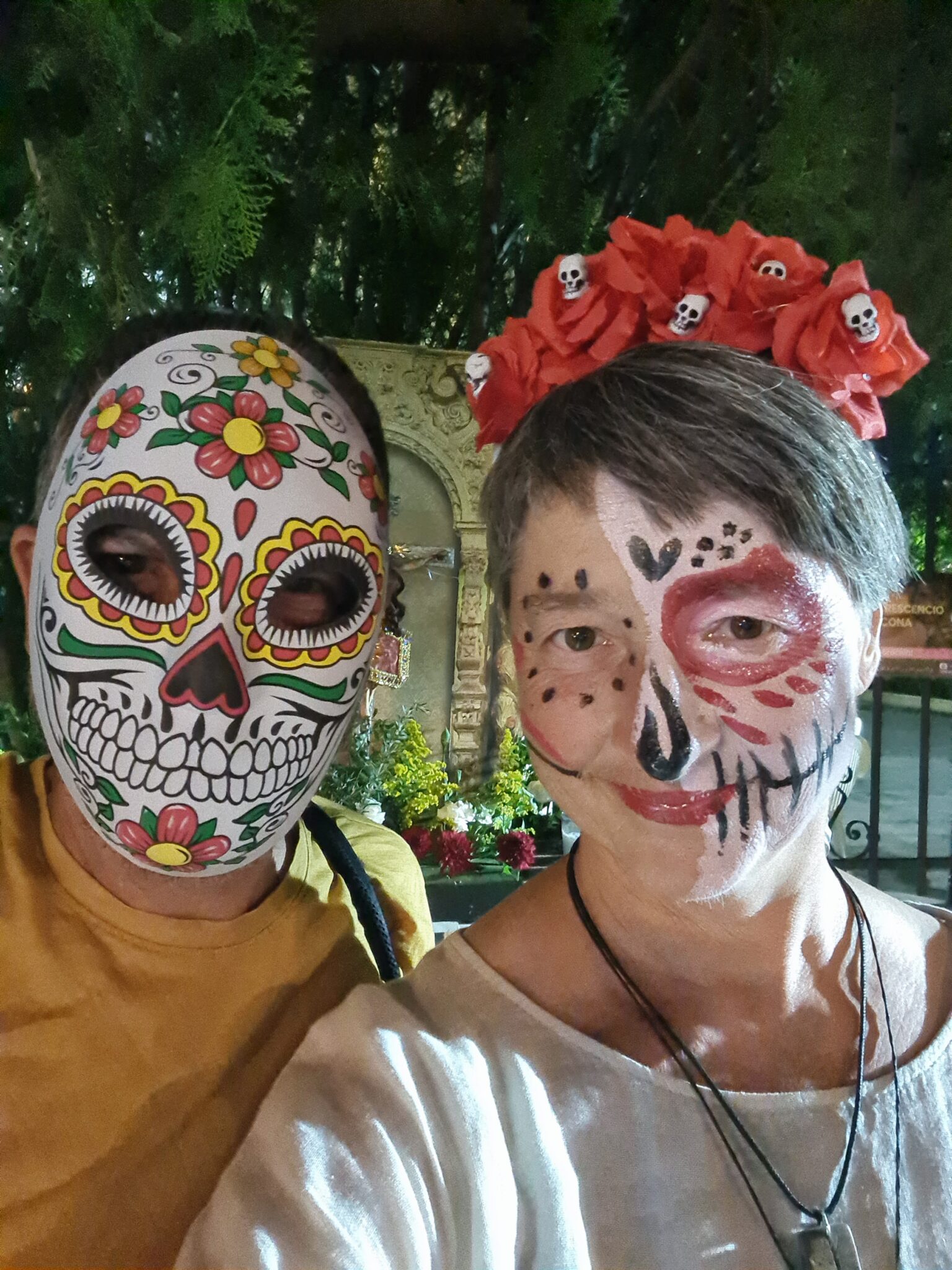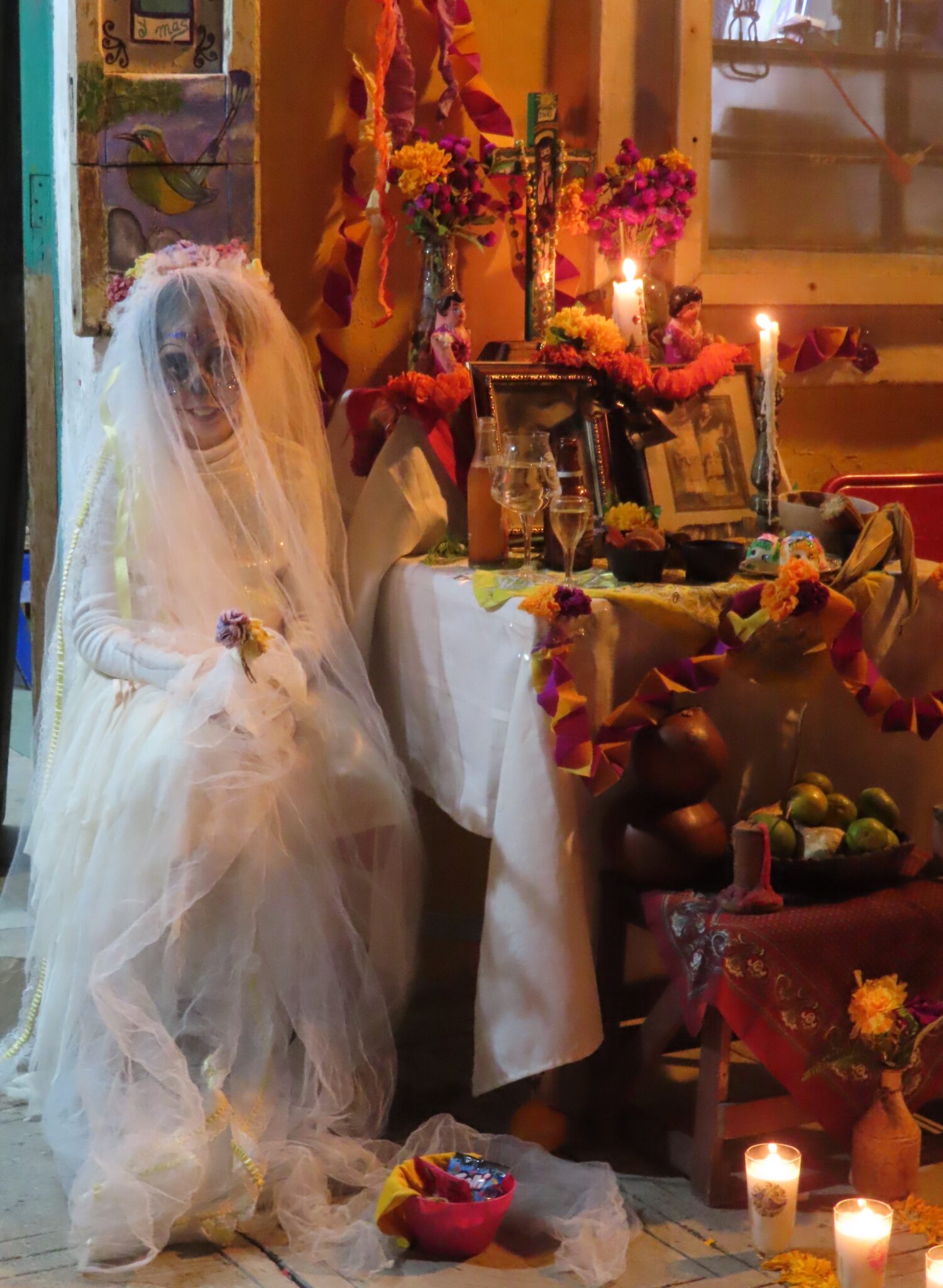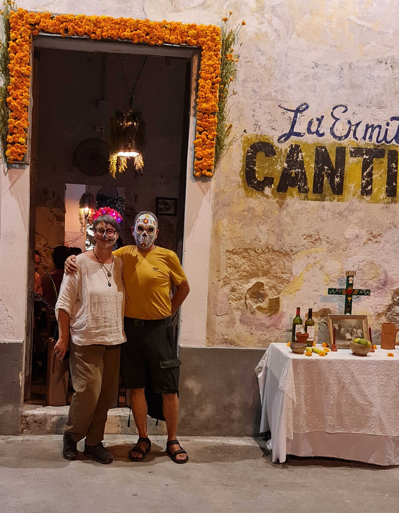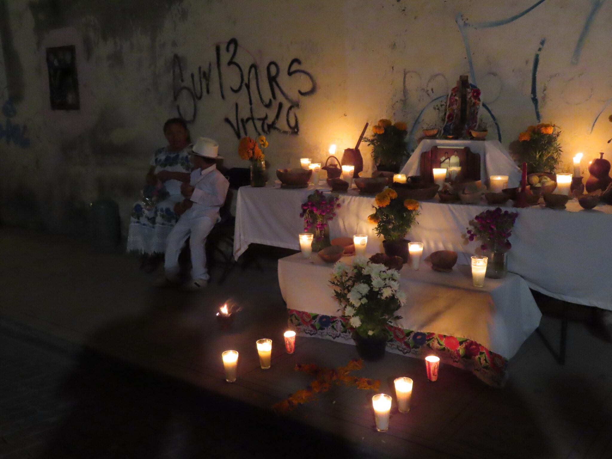 Die geschminkten Gesichter stehen für die Seelen der Verstorbenen. Die Menschen gehen den symbolischen Weg der Ahnen – vom Friedhof zu ihren Familien, zu den liebevoll geschmückten Ofrendas. Auf den Tischen stehen Lieblingsessen der Verstorbenen, Pan de Muerto, Schokolade, Tequila oder Coca-Cola. Man erzählt uns Geschichten, bietet uns zu essen und zu trinken an und erklärt geduldig jede Gabe.