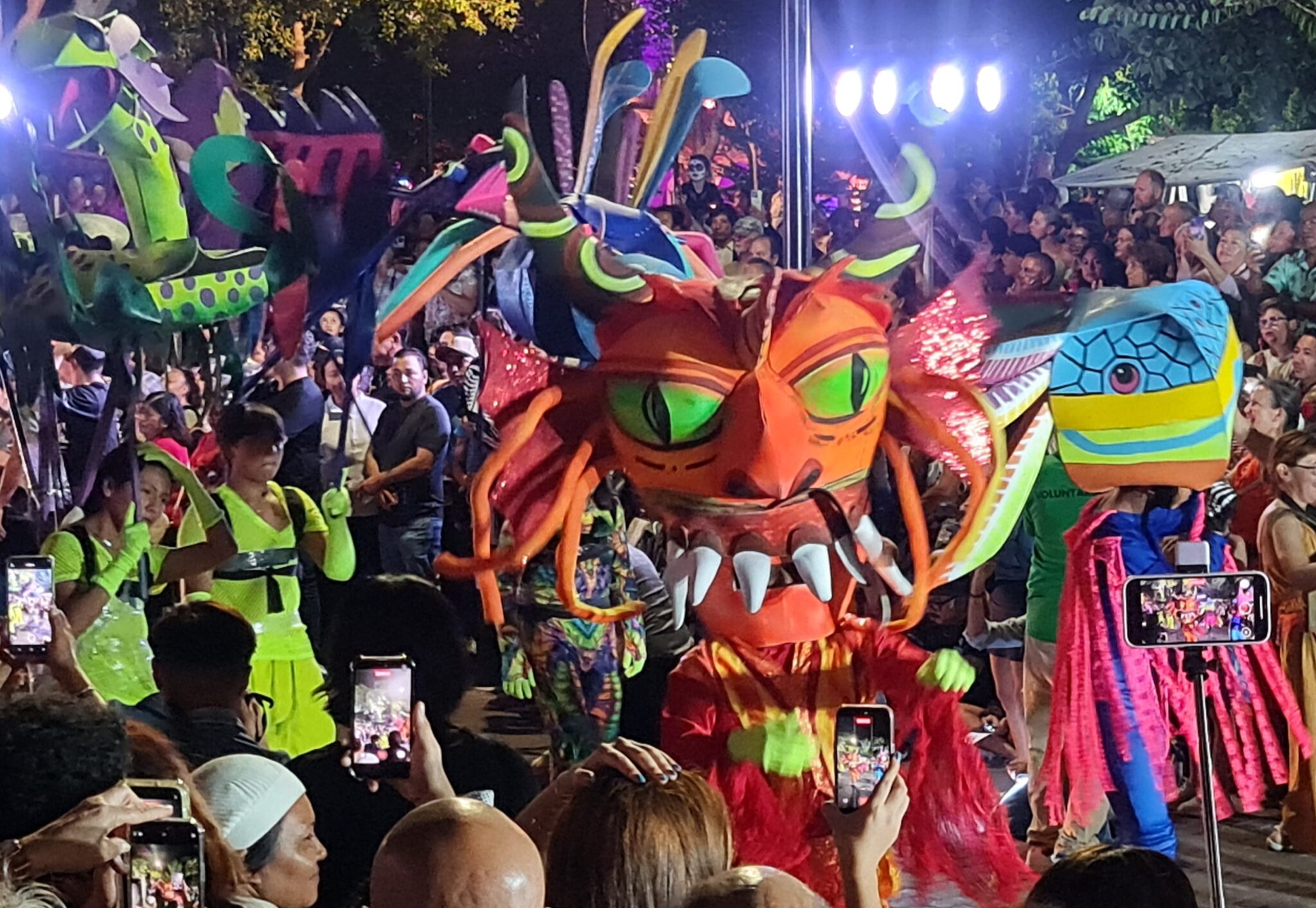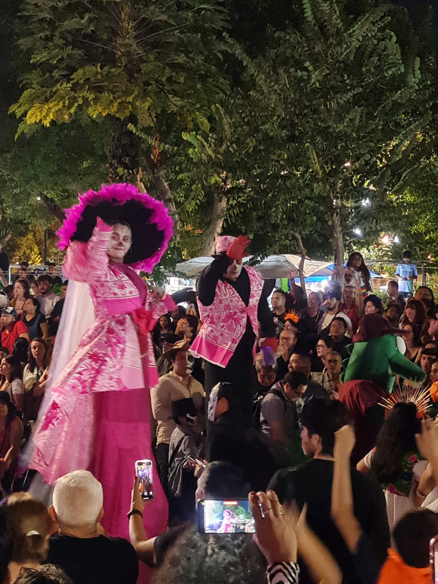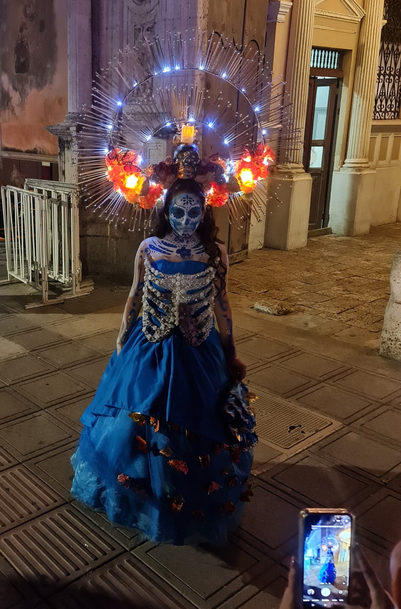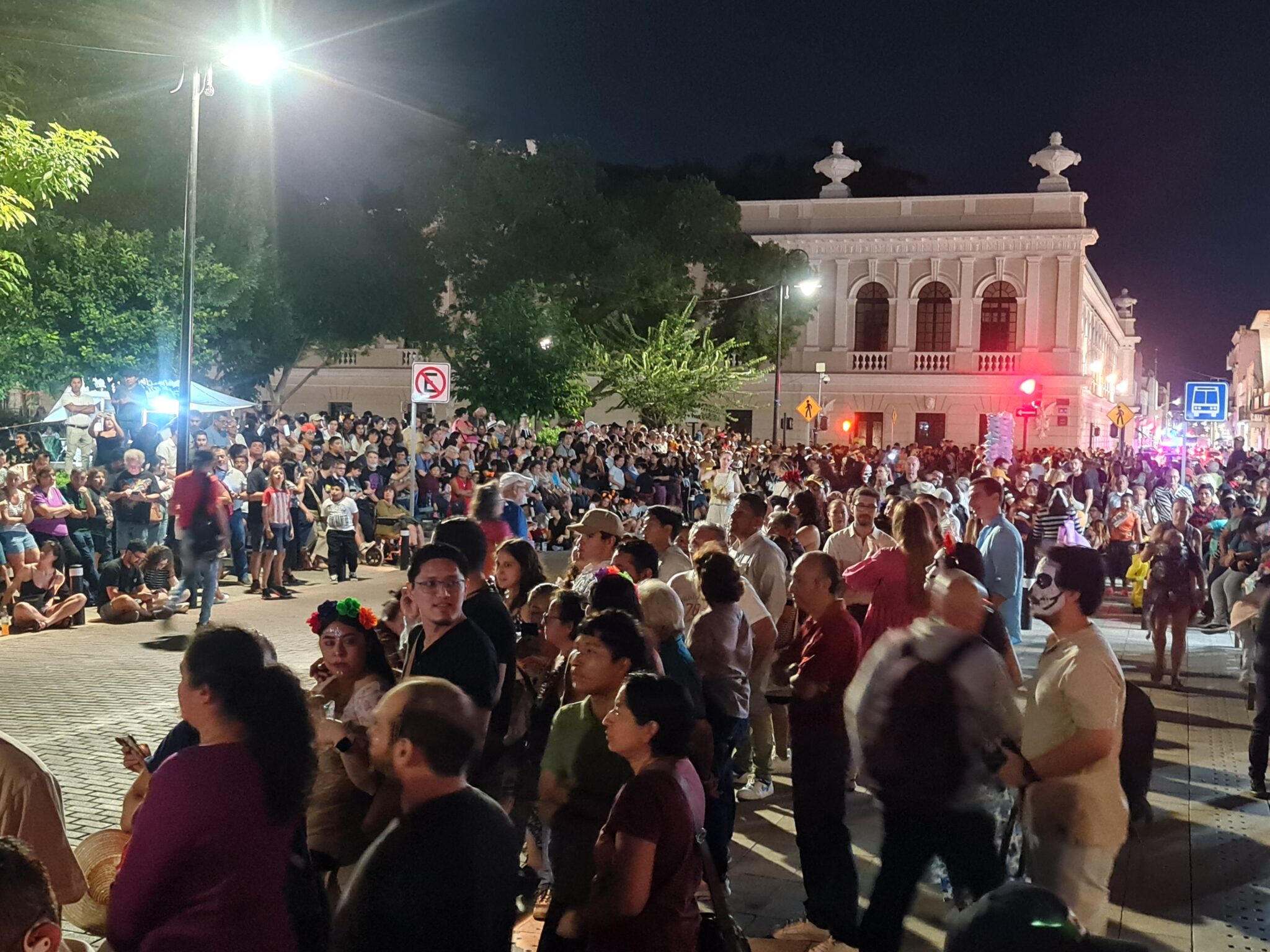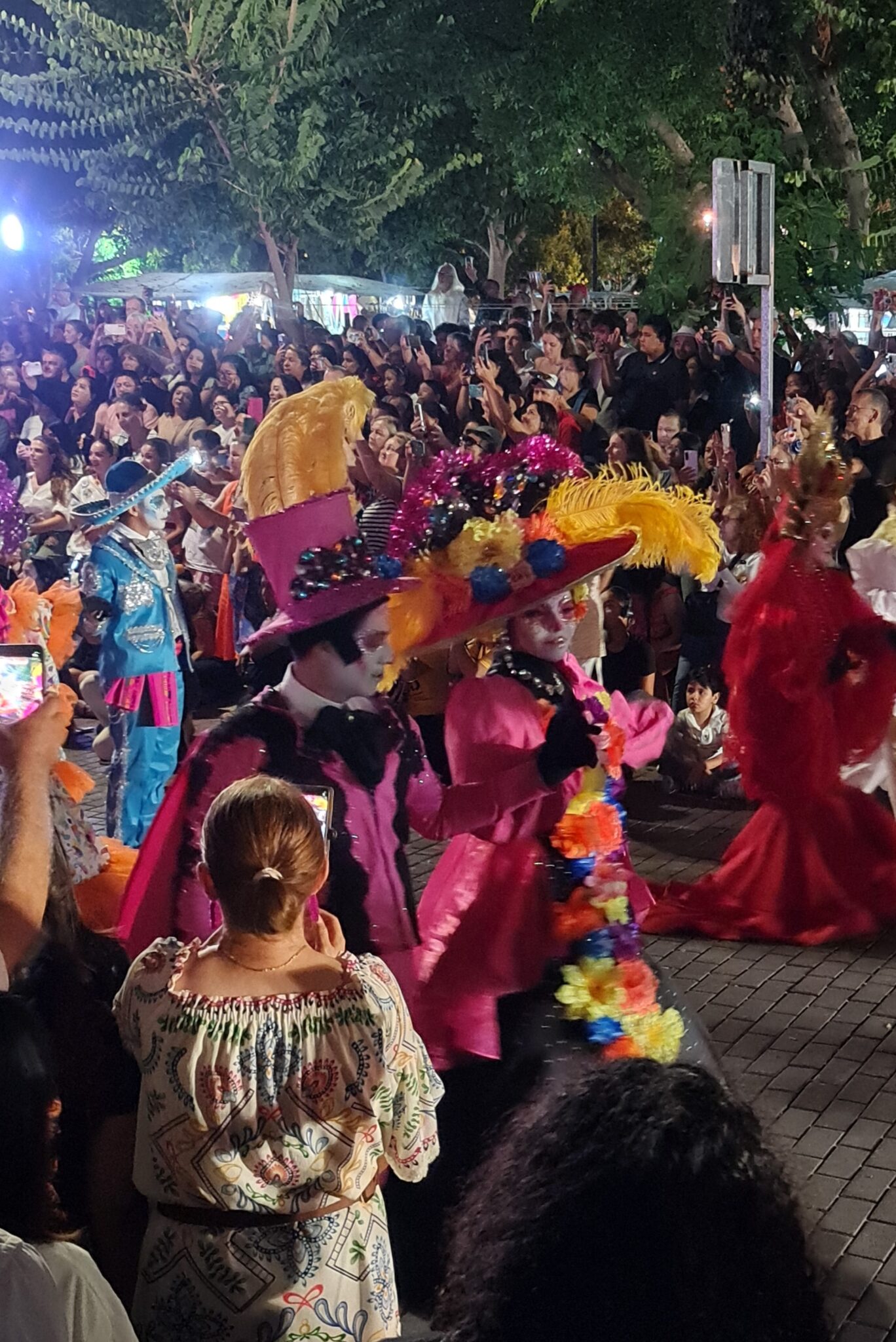 Gestern Abend ergattern wir gegen 18 Uhr zwei heiß begehrte Plätze auf einer der kostenlosen Tribünen direkt neben der Hauptbühne. Um uns herum sitzen und stehen Hunderte Menschen – Familien, Einheimische, Touristen –, alle gespannt auf den Desfile de Catrinas.
