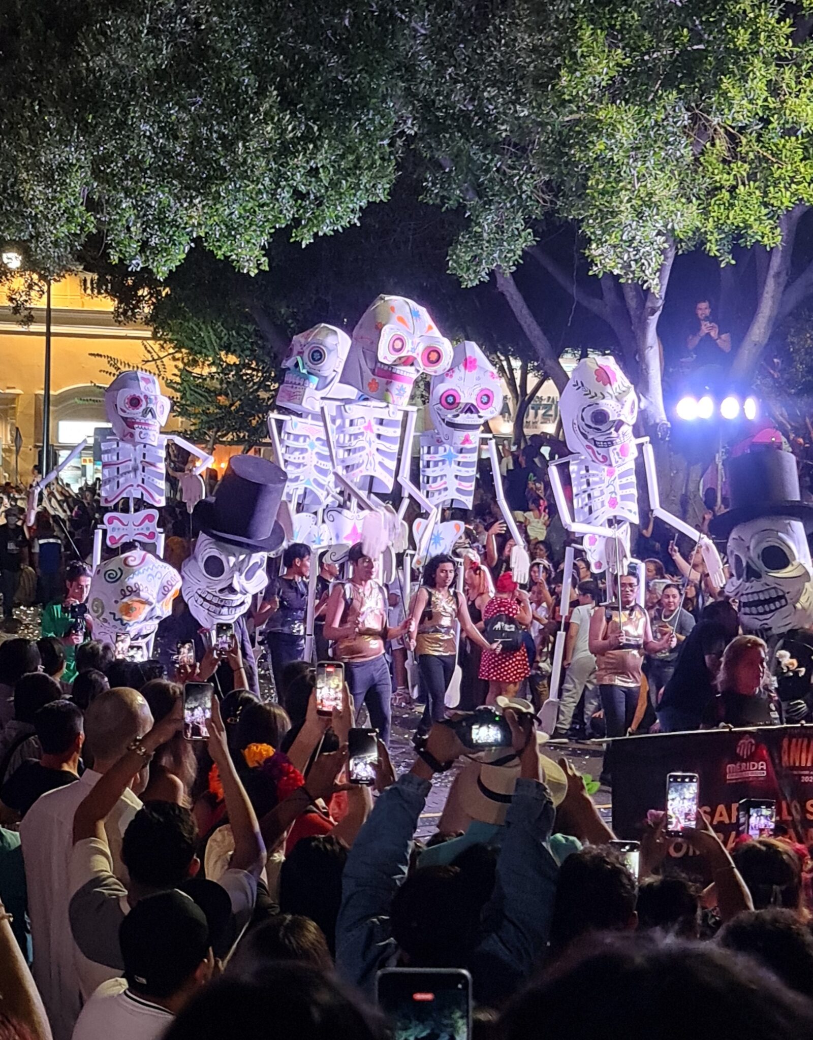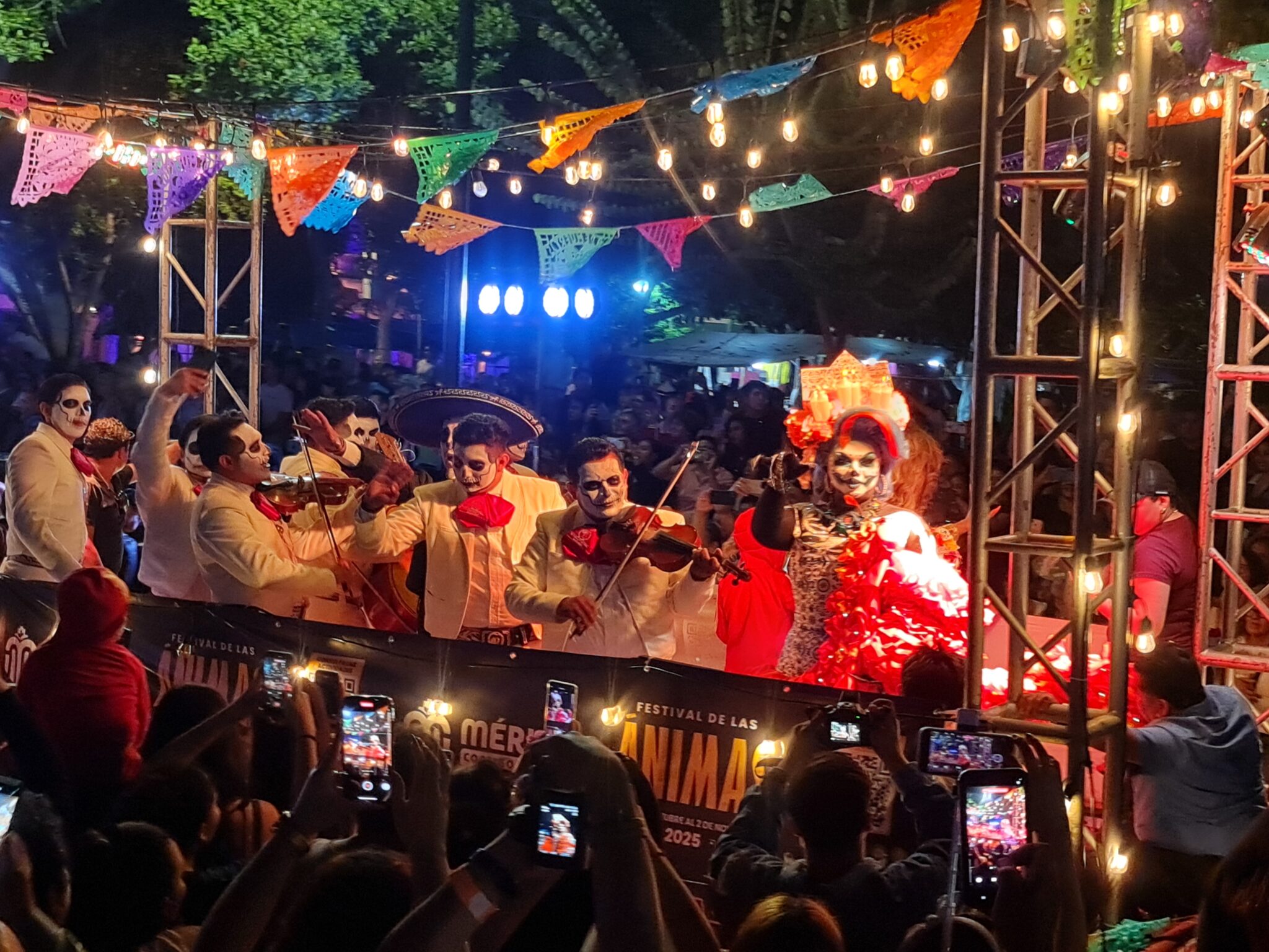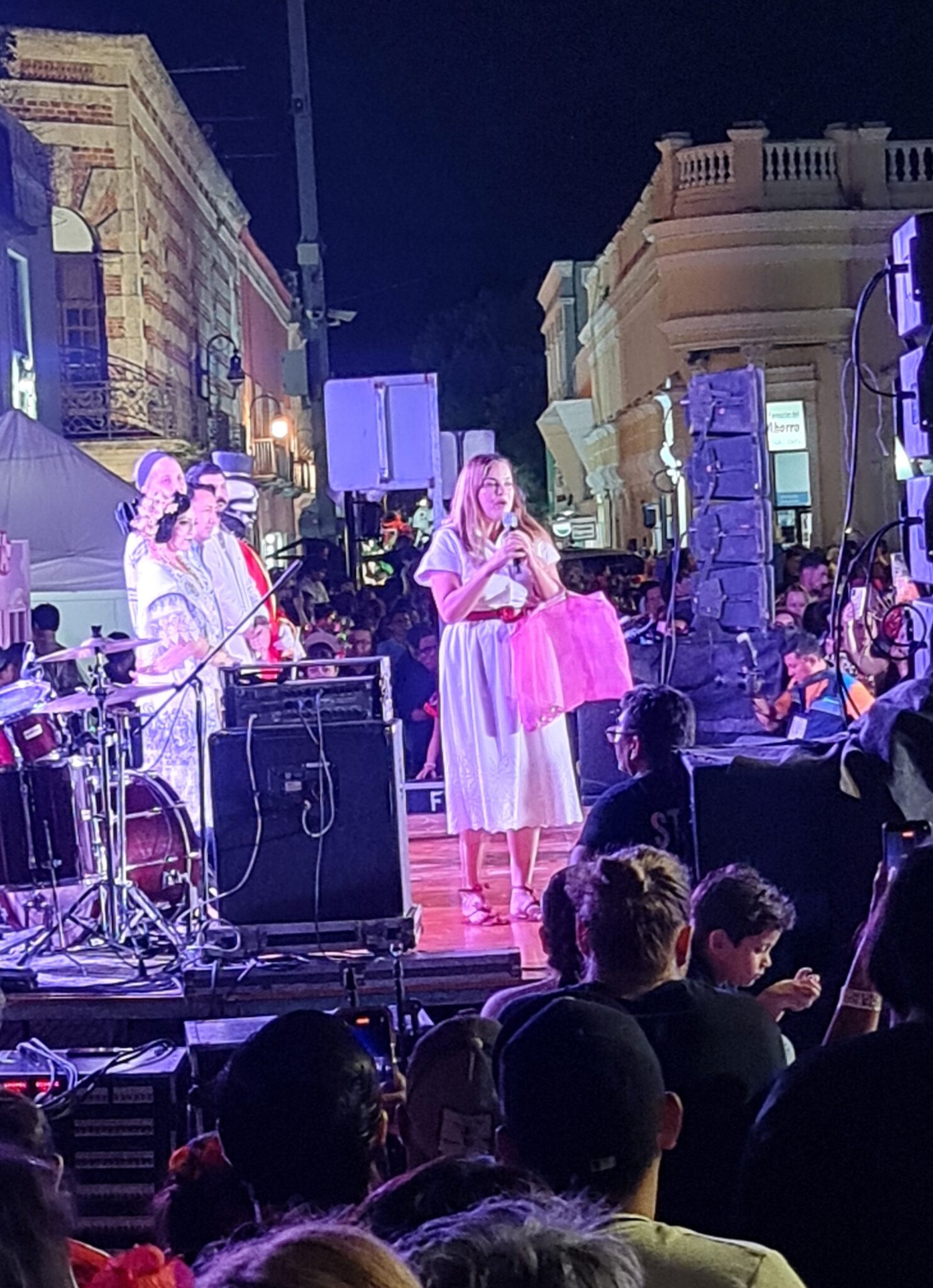 Bevor der Umzug beginnt, tritt die Bürgermeisterin auf die Bühne. In einem einfachen weißen Kleid, Einkaufstasche am Arm, keine Bühne-Pose – und doch schafft sie es, mit nur wenigen Sätzen ein ganzes Publikum zu berühren. Ihre Worte sind positiv, emotional und voller Stolz. Als sie ruft: „¡Viva Mérida! ¡Viva México!“, jubeln die Menschen – und mir steigen Tränen in die Augen.