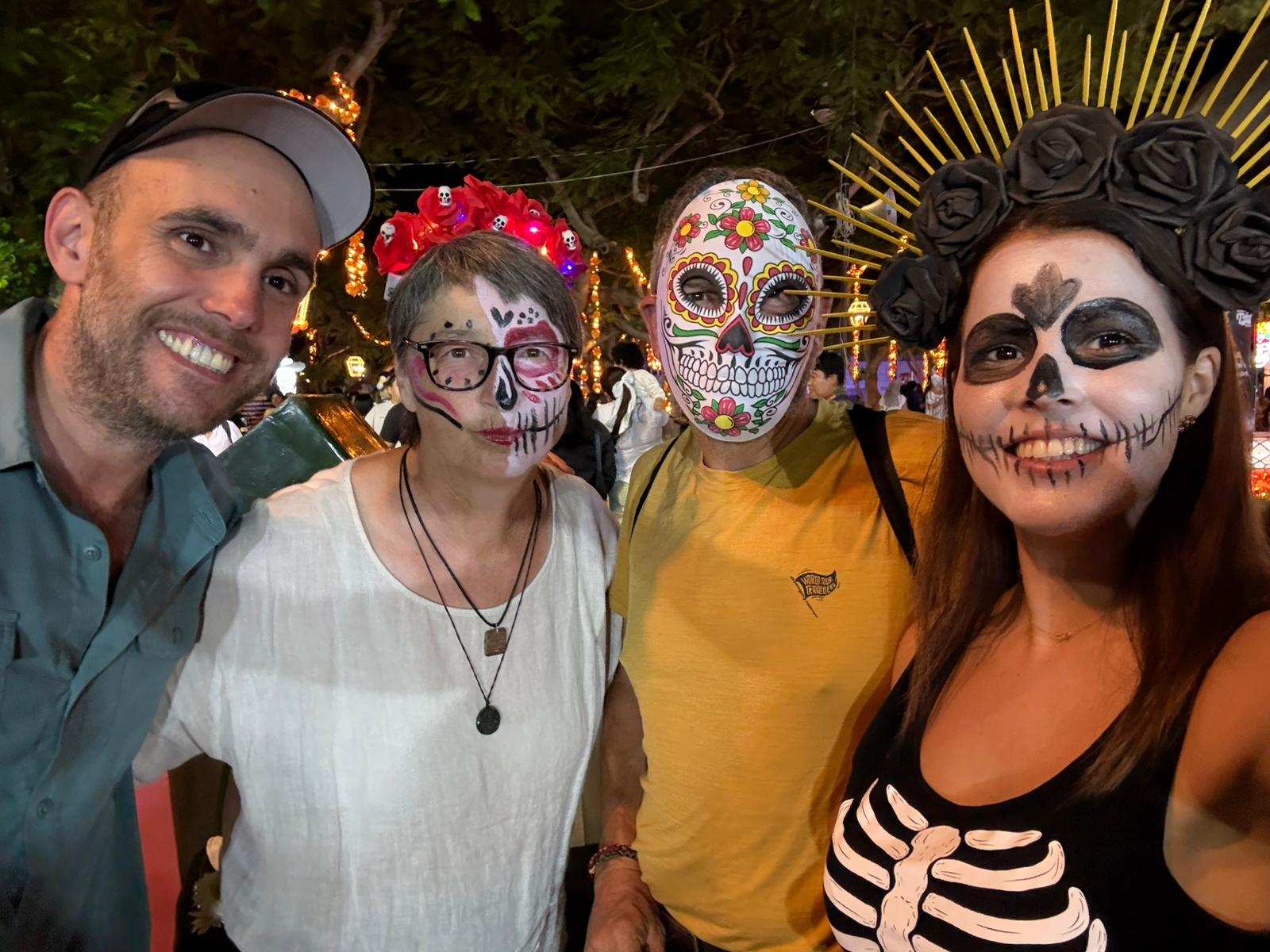 Wir treffen uns mit Wendolyn und Baldy, zwei kubanischstämmigen US-Amerikanern, die nur für dieses Wochenende nach Mexiko geflogen sind. Die Studentinnen der Universität schminken uns kostenlos – klassisch als Catrinas. Dann starten wir am Parque de San Juan und laufen in Richtung Friedhof.