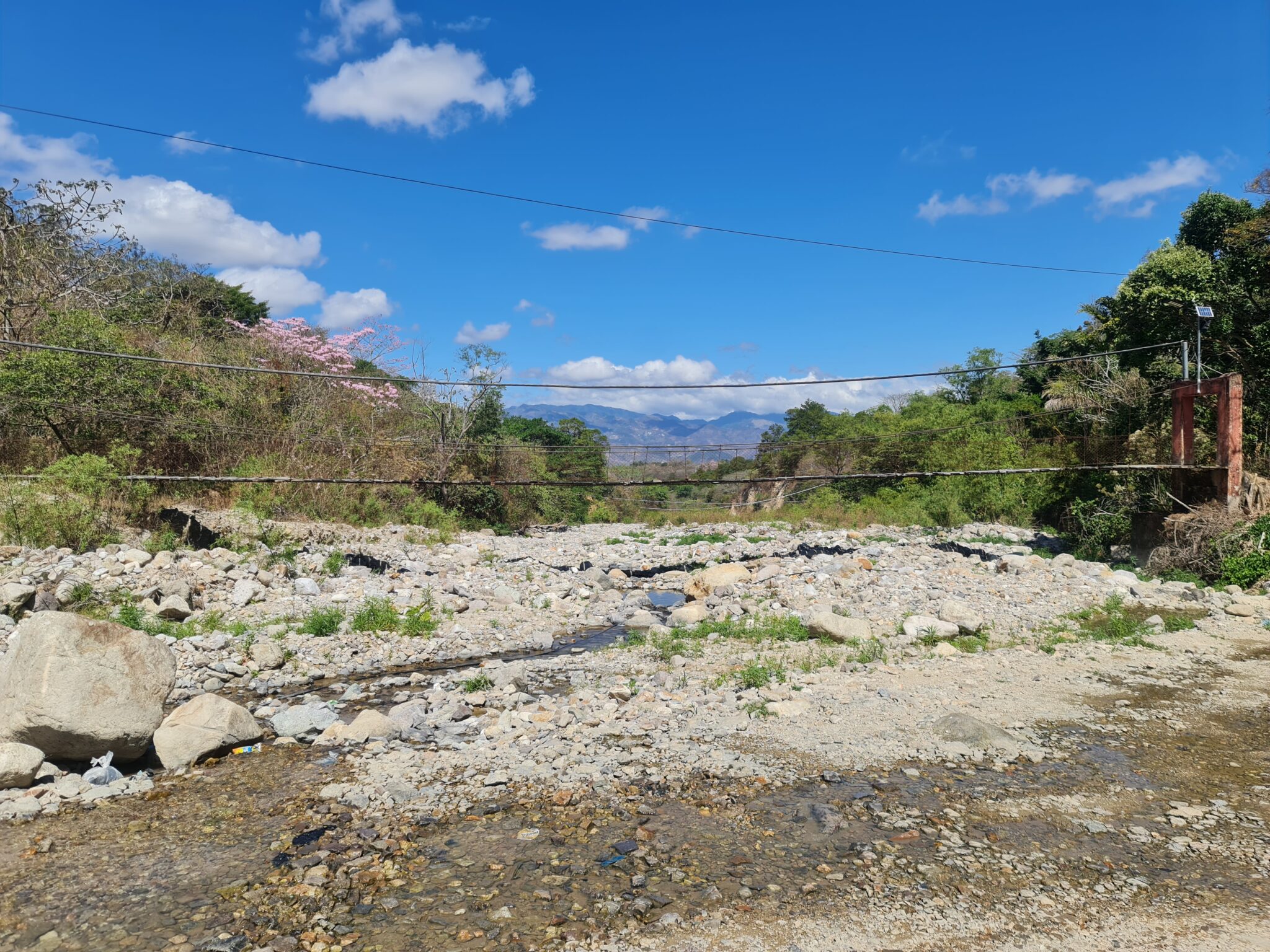Aus dem Dorf hinaus fahren wir jedes Mal durch ein zurzeit trockenes Flussbett. Die Hängebrücke darüber ist ziemlich wackelig, und wir sind froh über die Trockenzeit. Tatsächlich kann das Viertel hinter dem Fluss während der Regenzeit nicht mit dem Auto erreicht werden, weil die Wassermassen dann unpassierbar sind. Dann muss alles mit Mopeds oder zu Fuß über die Hängebrücke transportiert werden. Für uns kaum vorstellbar.