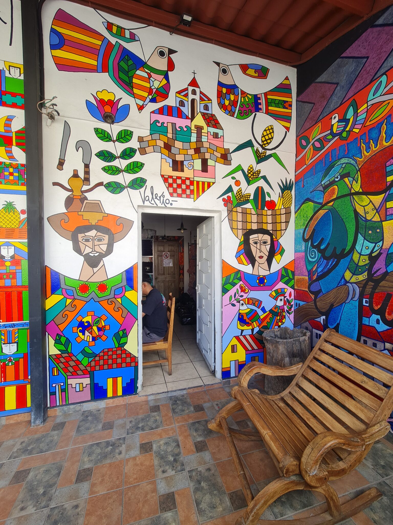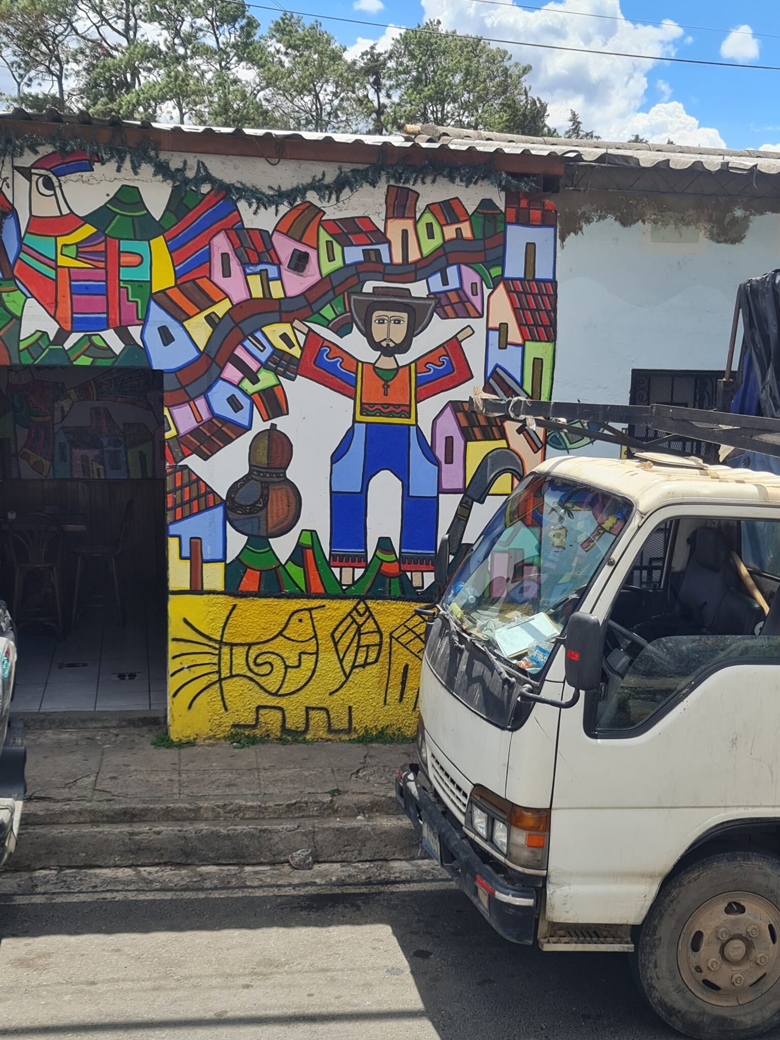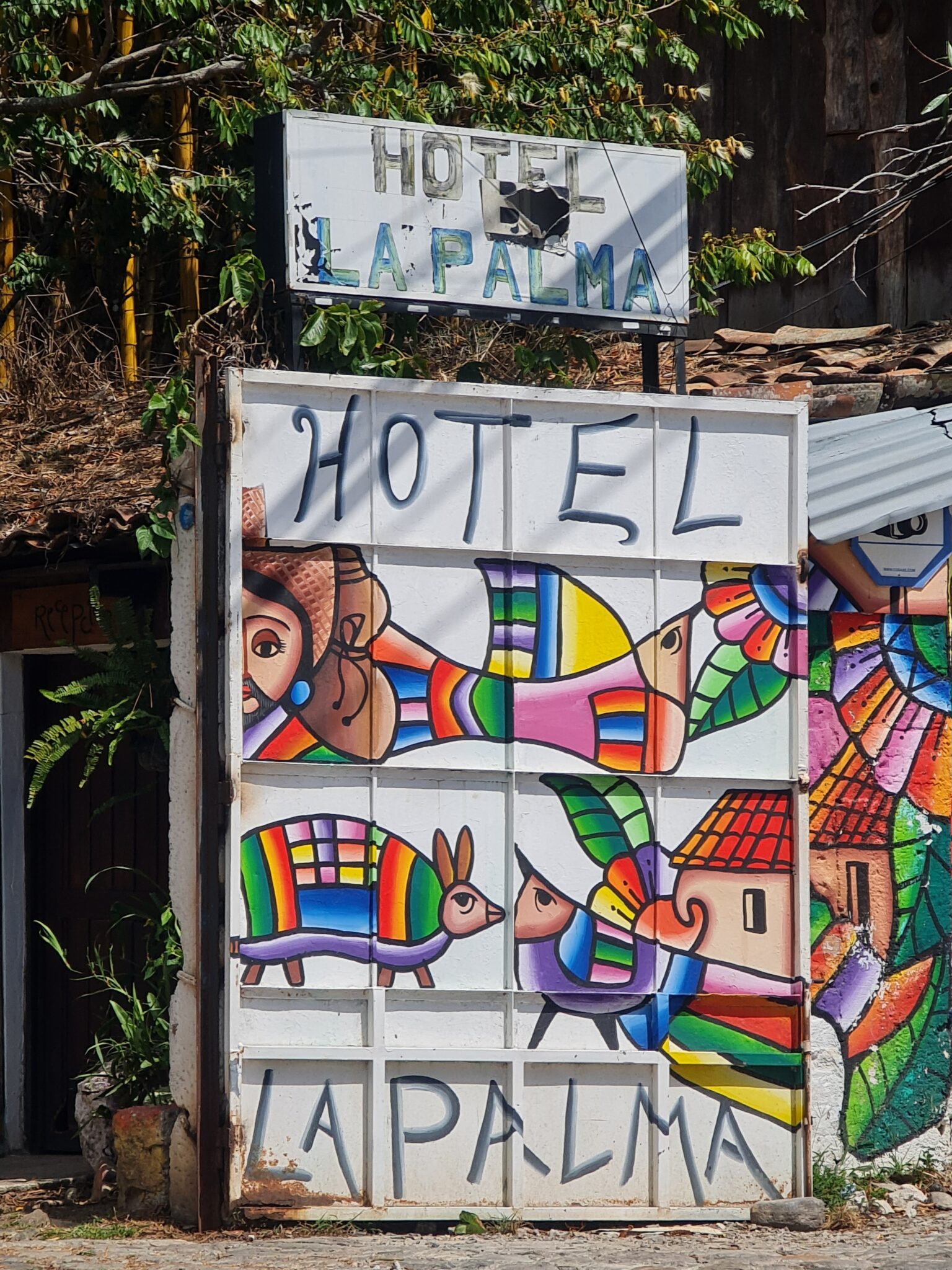 Mein Kunstherz schlägt höher. Wir fahren in die Berge und kommen nach La Palma, einem kleinen Ort auf über 1.000 Metern Höhe. Bekannt wurde es durch Fernando Llort. Er kam in den 1970er Jahren in das Dorf und gilt als Begründer des naiven Volkskunststils von La Palma. Seine Kunst verbindet Spiritualität, indigene Traditionen, einfache Formen und kräftige Farben. Seine Werke zeigen die Harmonie zwischen Mensch und Natur – Bilder einer friedlichen Gesellschaft. Und das in einem Land, dessen Vergangenheit von Bürgerkrieg und Gewalt geprägt ist.