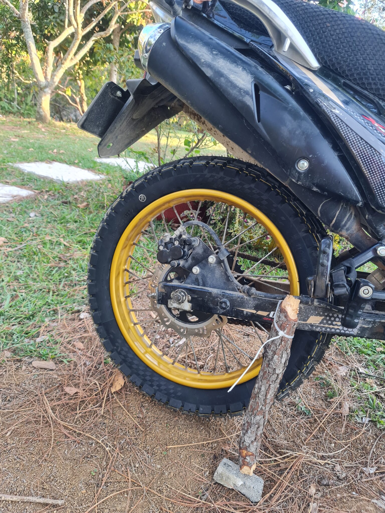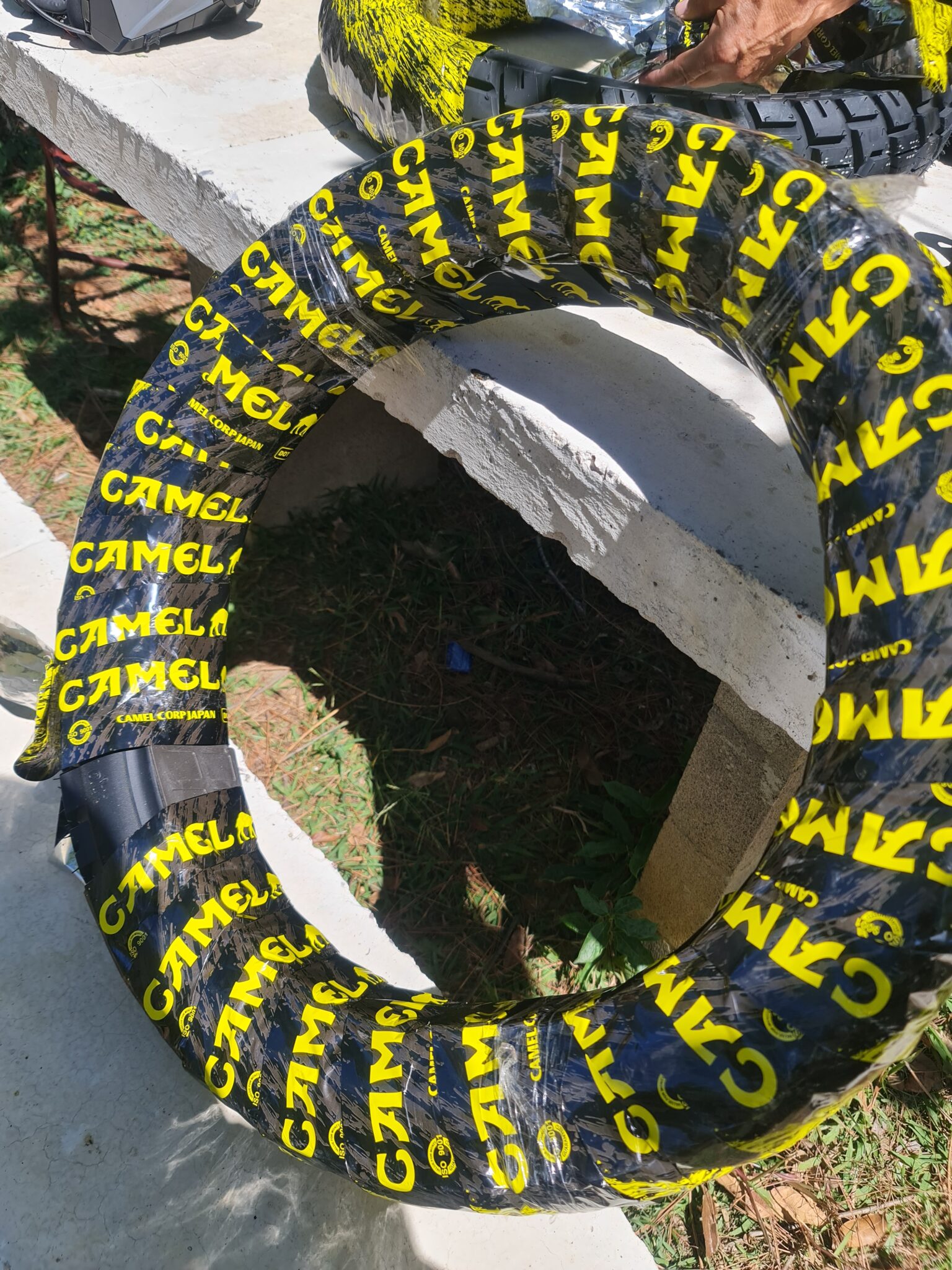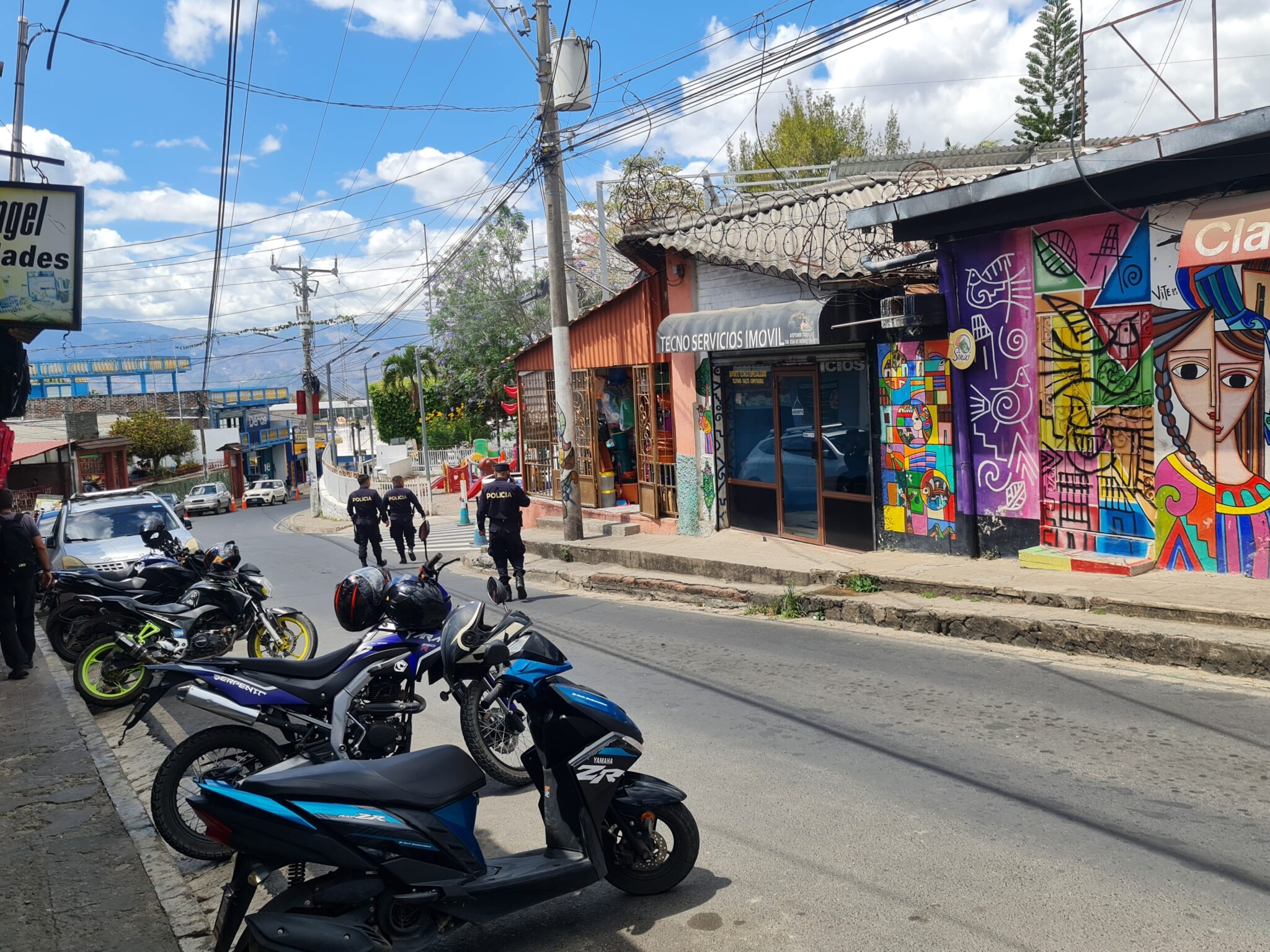 Wir wollen neue Reifen aufziehen und kaufen im Mopedzubehörladen zwei neue Camel-Hinterreifen. Elegant über die Hüfte gelegt behindern sie uns tatsächlich auch während der Rückfahrt zum Campingplatz kaum. Und das ist gut so, denn wir erleben mal wieder eine typisch salvadorianische Straßenszene.