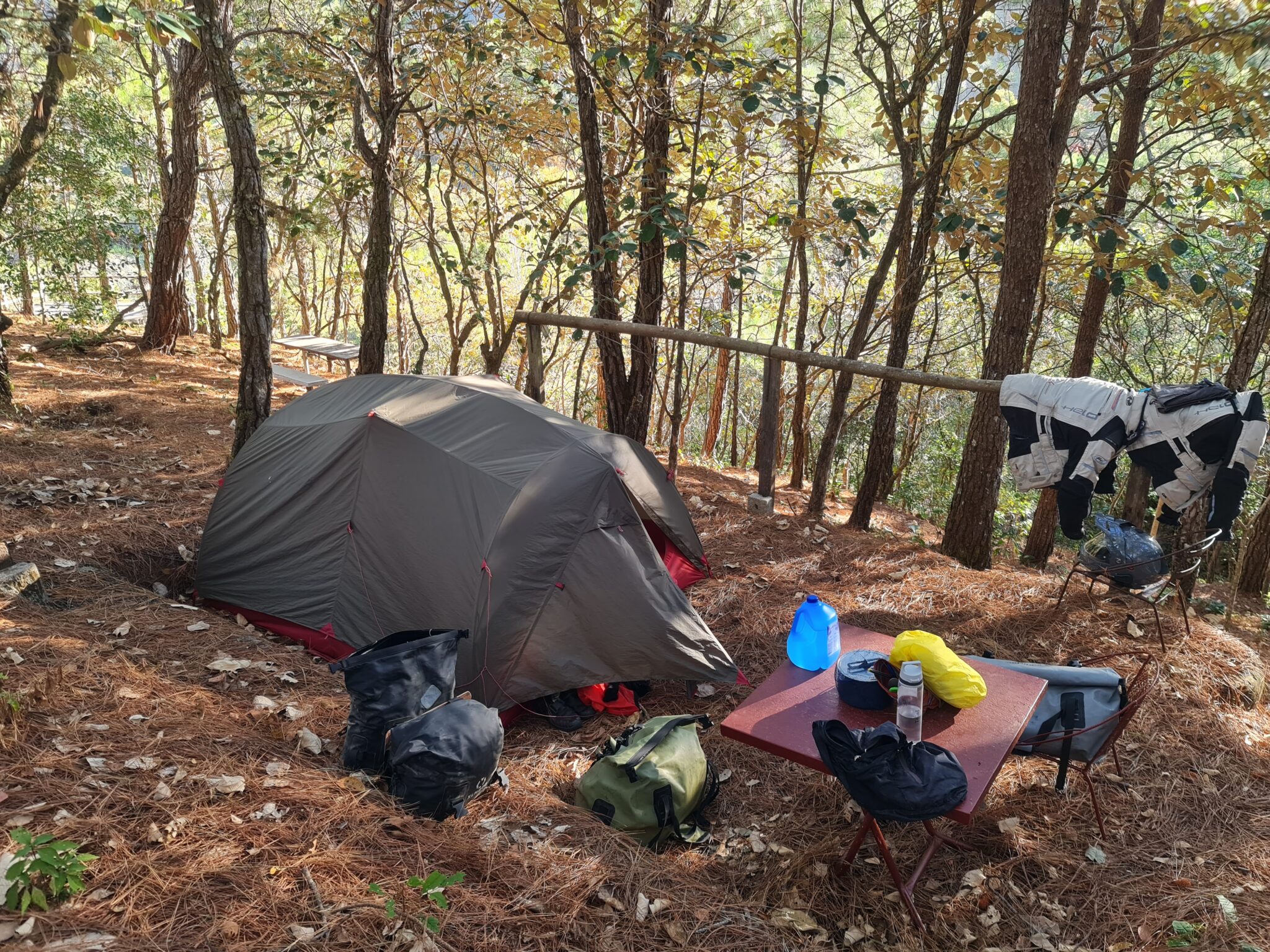 Genau dort liegt auch unser schöner Campingplatz: schattig, kühl und mit einem herrlichen Blick auf die Berge.