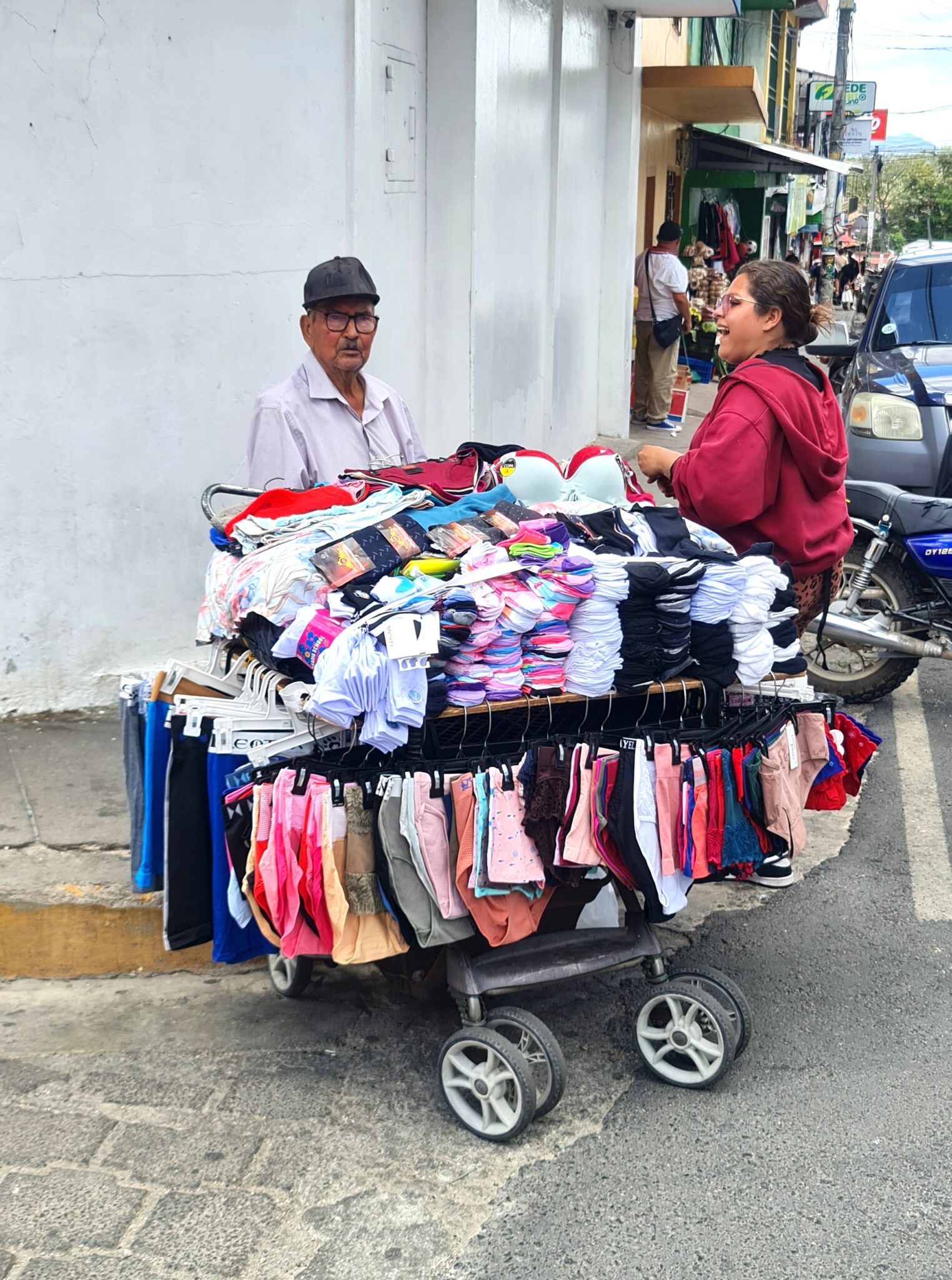 Wir stehen hinter dem Pickup – und es ist wirklich kein Zentimeter Platz, um an ihm vorbeizufahren. Aber auch das entgegenkommende Taxi kann wegen dieser spontanen Einkaufssituation nicht weiterfahren. Also wartet man eben. So geht das in Lateinamerika: kein Hupen, keine Hektik, keine schimpfenden Worte. Entspannte Gelassenheit…