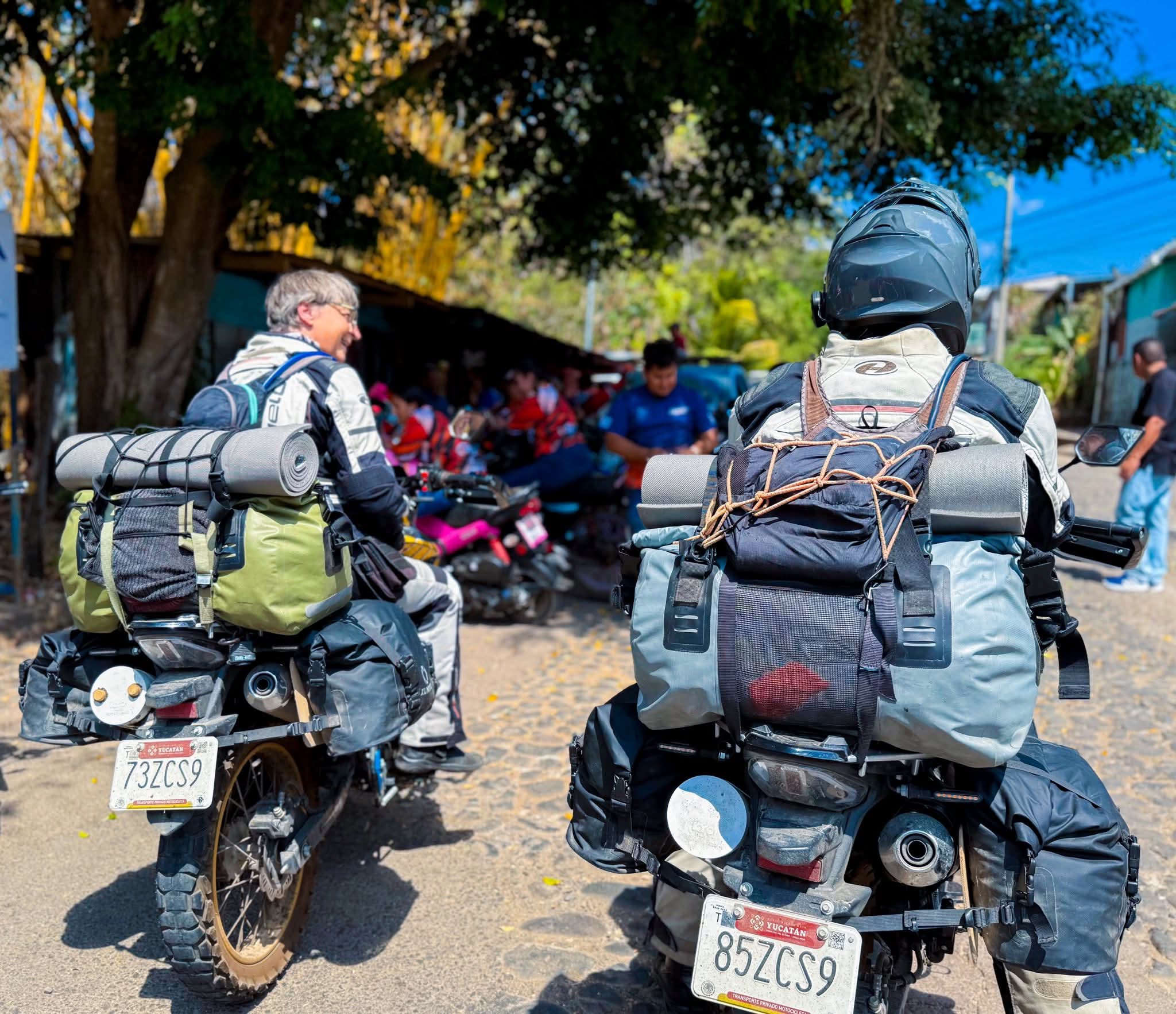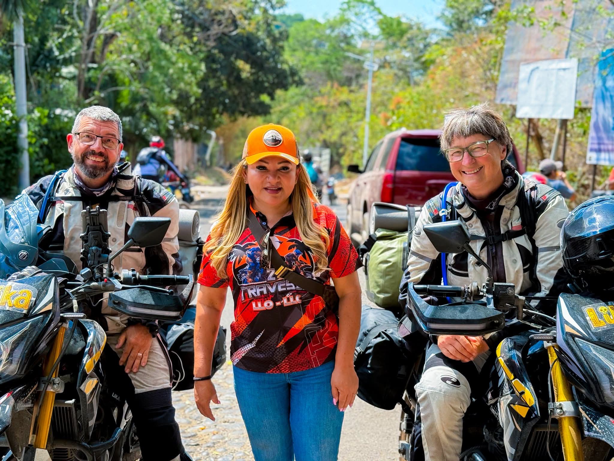 Und natürlich entspricht es mehr unserem Reisestil anzuhalten, die Helme abzunehmen und ins Gespräch zu kommen. Wir stehen keine zwei Minuten, da kommt eine blonde, temperamentvolle Frau im Veranstaltungstrikot auf uns zu, schüttelt uns herzlich die Hände und heißt uns willkommen beim „Paseo de Moto“. Janet ist Bürgermeisterin der Region und Organisatorin dieser jährlichen Ausfahrt. Sie fragt uns über unsere Reise aus, will wissen, wie wir uns in El Salvador fühlen – und posiert mit uns für unzählige Pressefotos. Auch viele der Fahrer möchten Bilder mit uns machen. Für einen kurzen Moment fühlen wir uns wie ungeplante Stars der Veranstaltung.