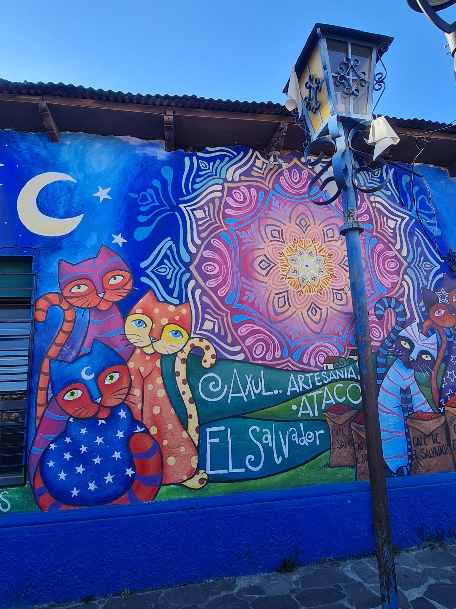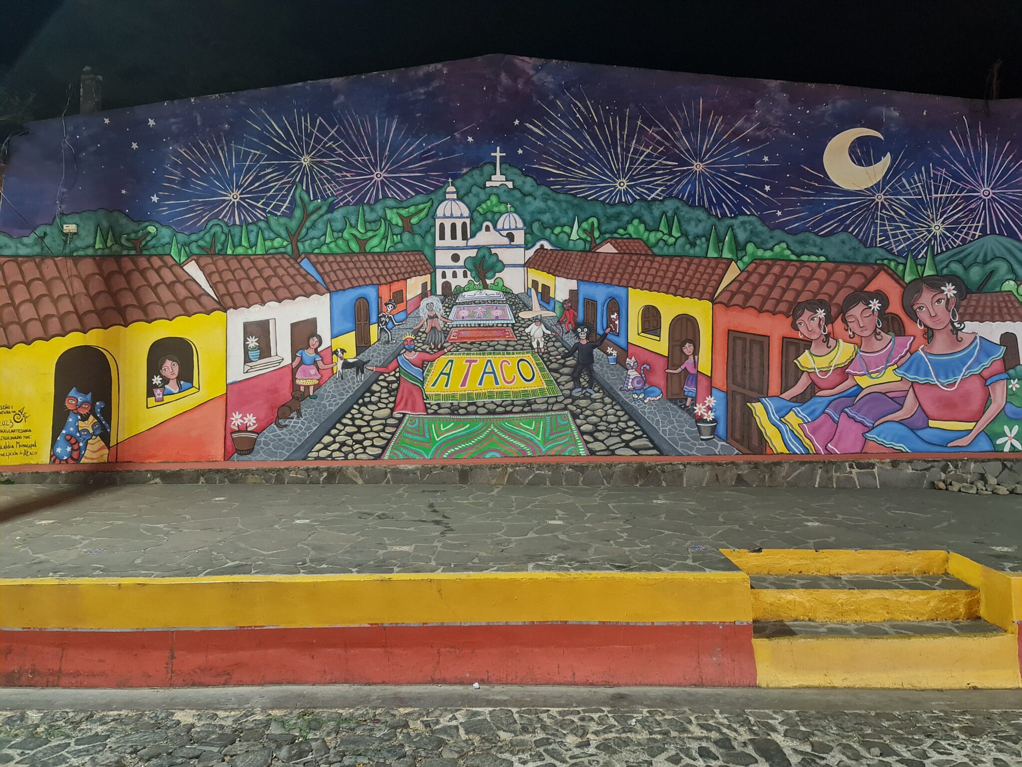 So ein Wochenendvergnügen kann dann zum Beispiel so aussehen: Wir fahren nach Ataco, lauschen einer Sängerin im knallengen Hosenanzug, die lateinamerikanische Schlager singt, machen Fotos mit zwei Figuren auf Stelzen, kaufen Eis für die Kinder, Pupusas (gefüllte Tortillas) für alle und dann noch ein paar Tüten Chips, die aufgerissen und großzügig mit Sauce überschüttet werden. Und dann sitzt man einfach da, quatscht, lacht – stundenlang. Der kurze Spaziergang durchs Städtchen endet meist noch in einem Souvenirshop, wo man sich ein Andenken an diesen schönen Tag mitnimmt. Am Abend wird die ganze Familie wieder in den Pickup geladen (manche brauchen wegen erhöhtem Alkoholkonsum auch Hilfe) – und dann geht’s zurück nach Hause.