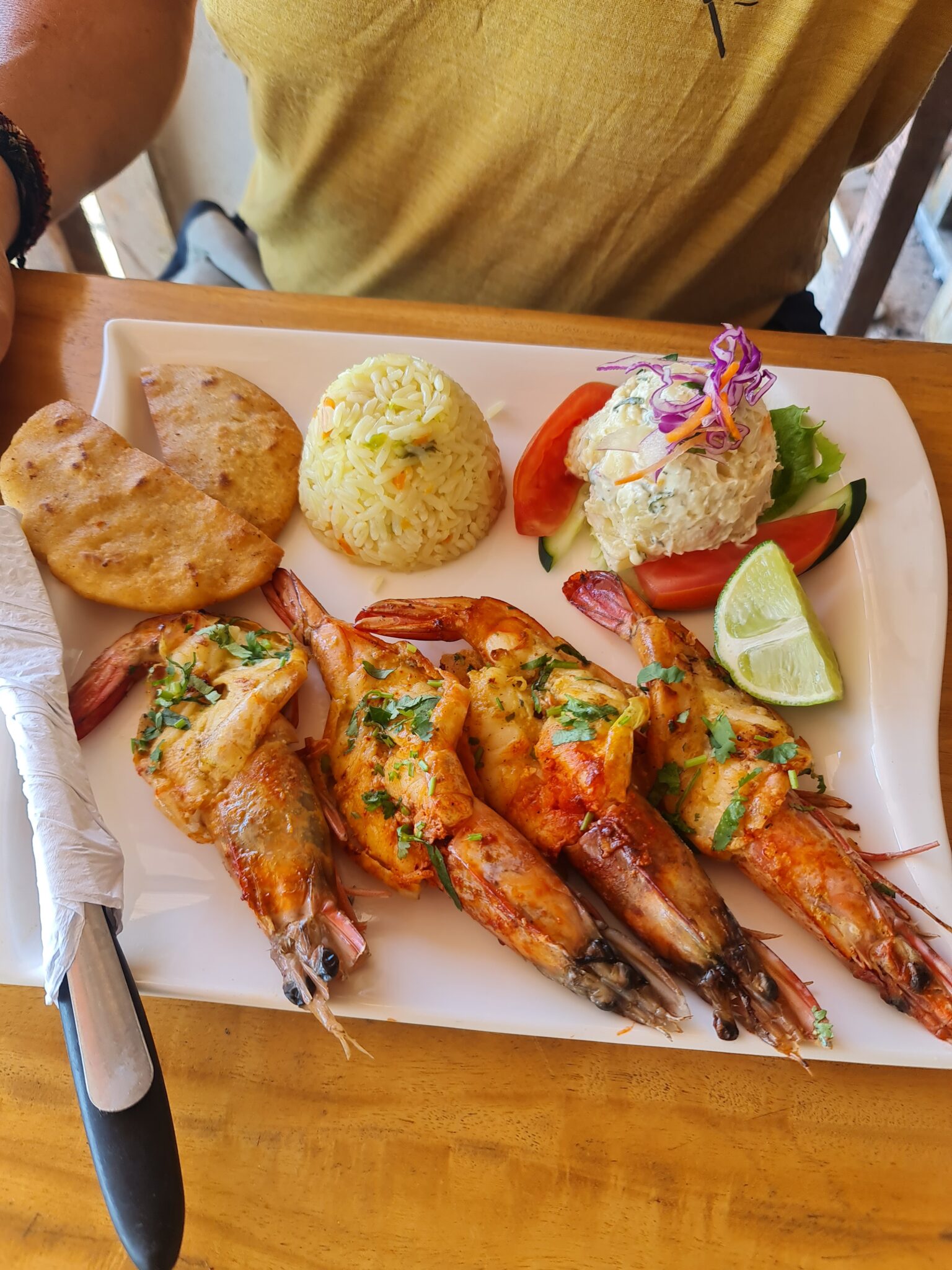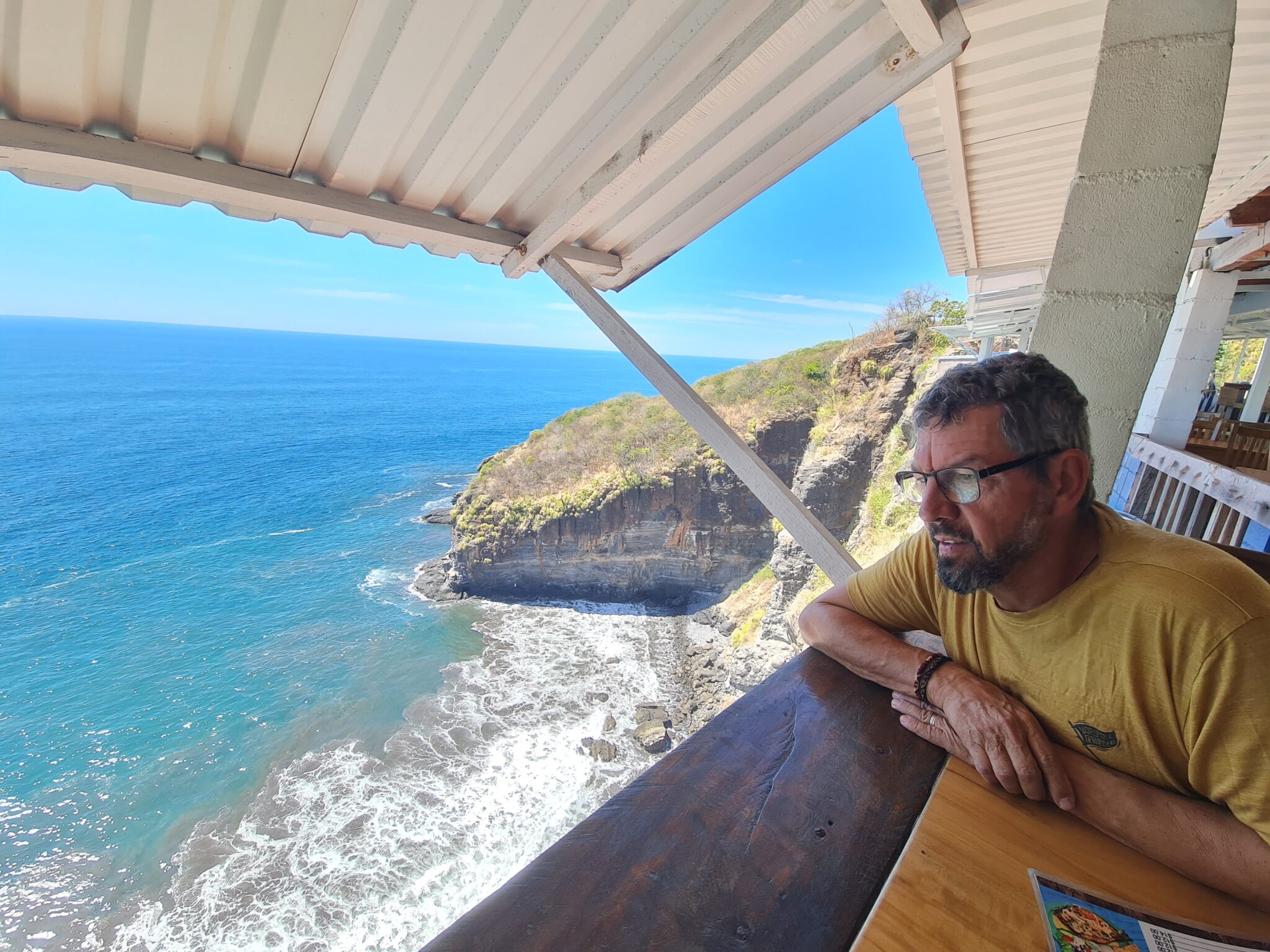Genau so ein Ort, wie wir ihn lieben: ein Restaurant mit Freizeitmöglichkeiten, direkt am Strand. Und wer steht vor der Tür? Monika und Michael, die wir auf der Kaffeefarm kennengelernt hatten – und die zufällig immer Gin Tonic in ihrem Camper haben 😊