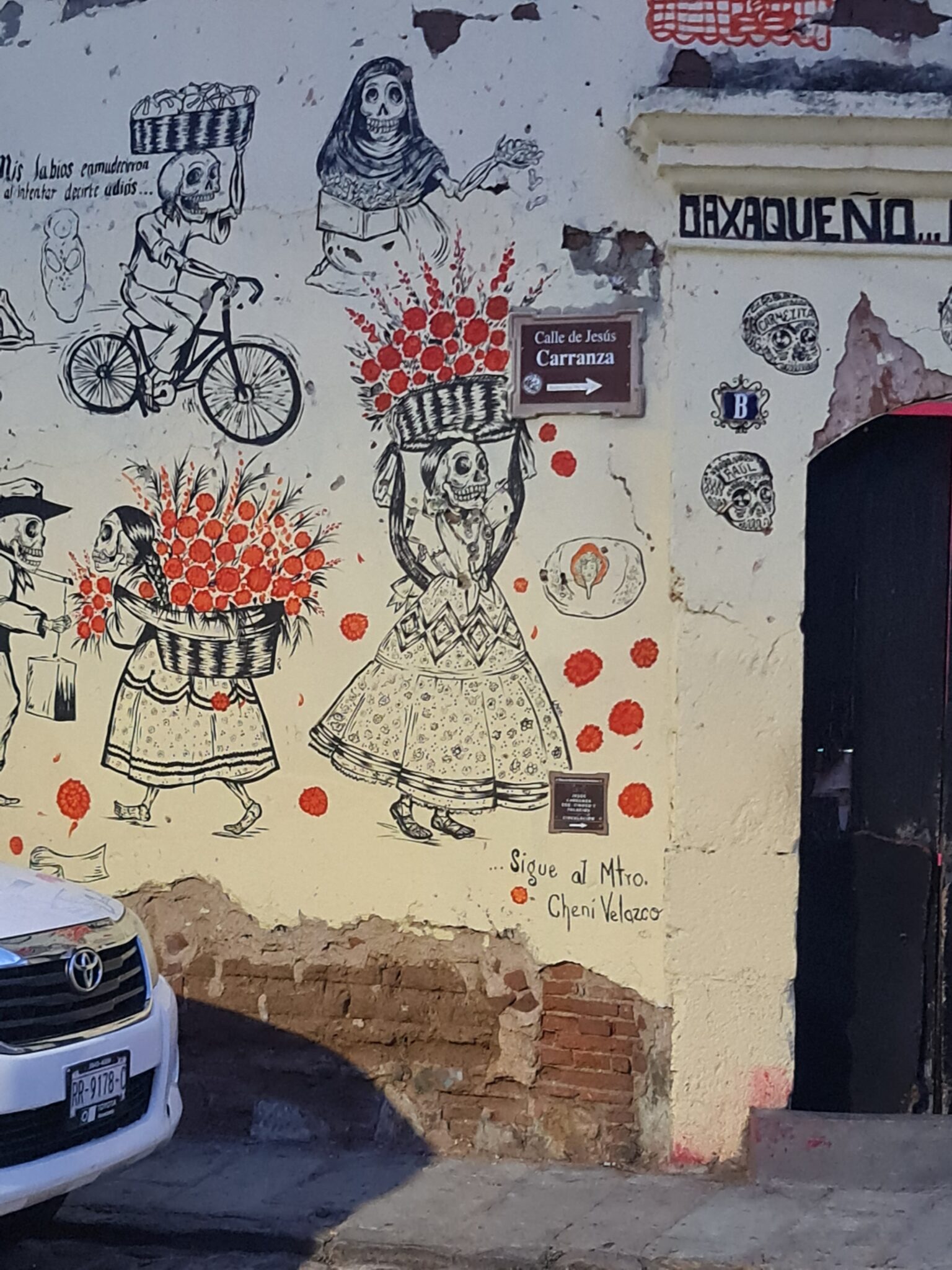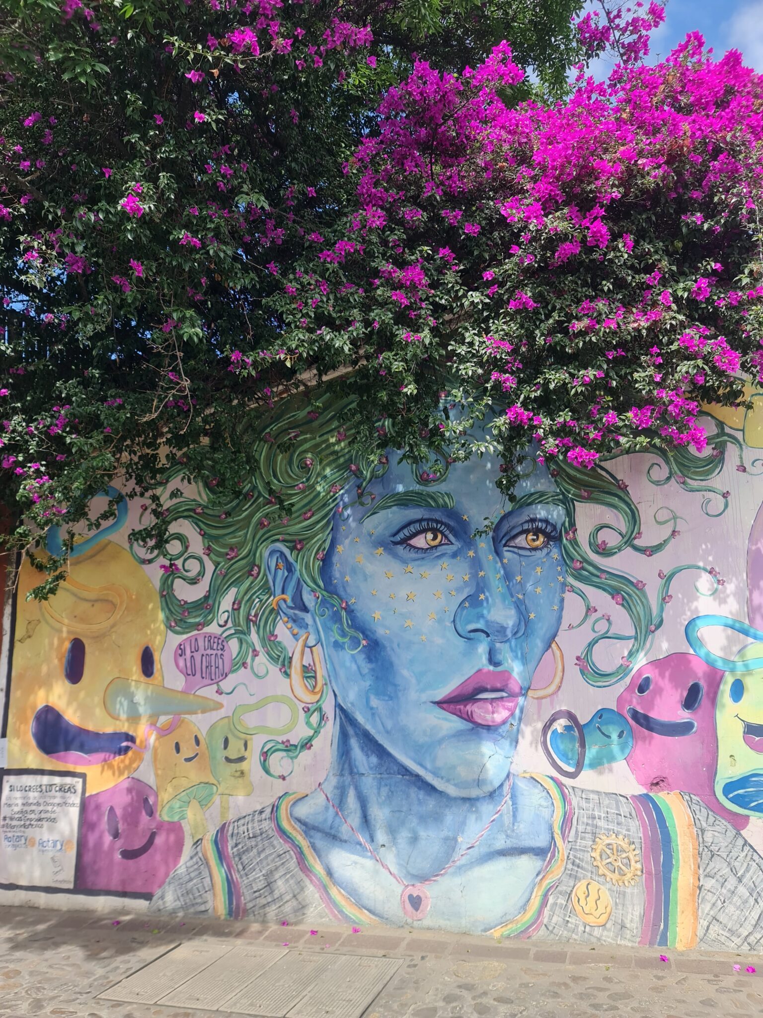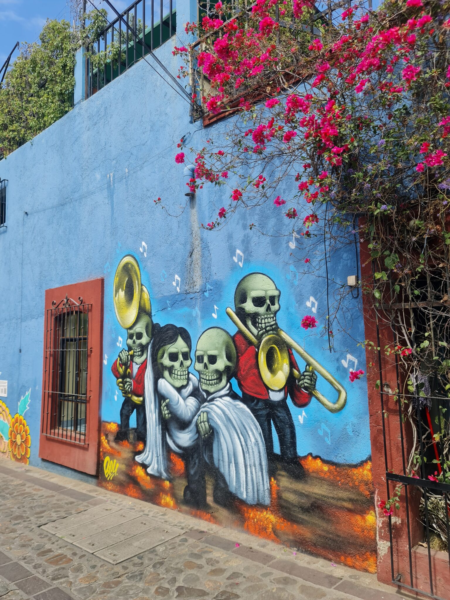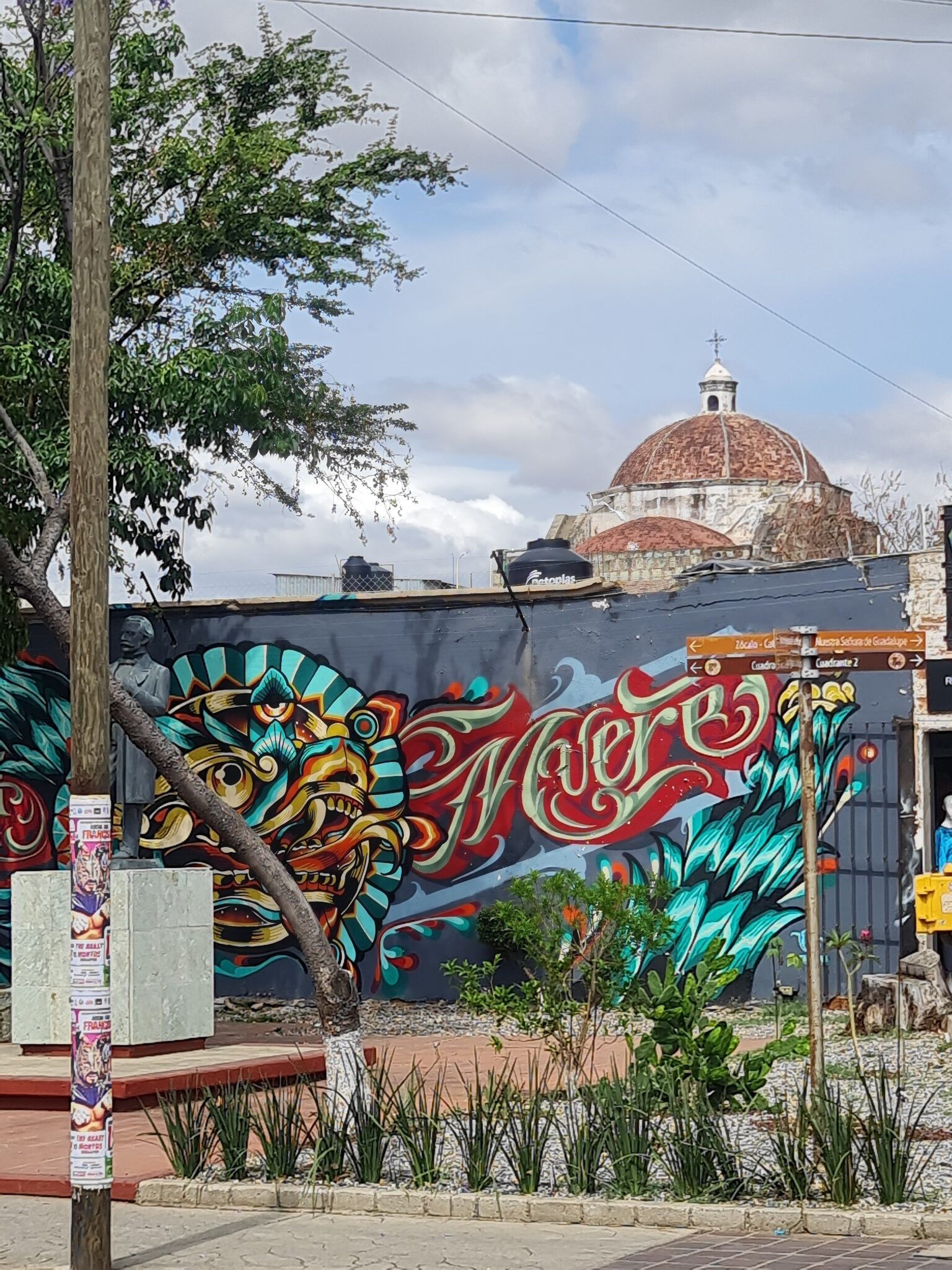 In Oaxaca ist die Künstlerszene sehr aktiv, und so entdecken wir überall in der Stadt spannende „Protestkunst“ in Form von Plakaten an den Hauswänden und natürlich die für Lateinamerika bekannten Murales (Wandmalerei). Da geht mir jedesmal das Herz auf…..