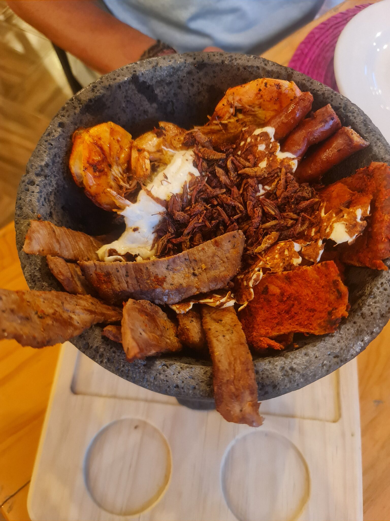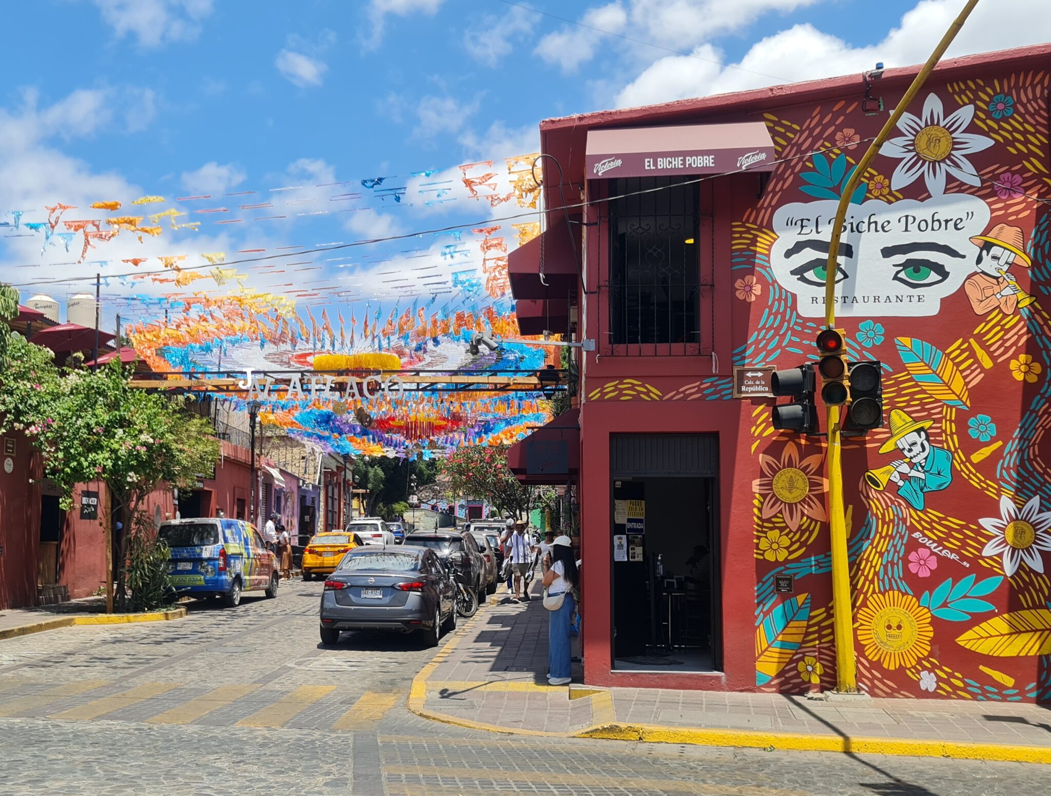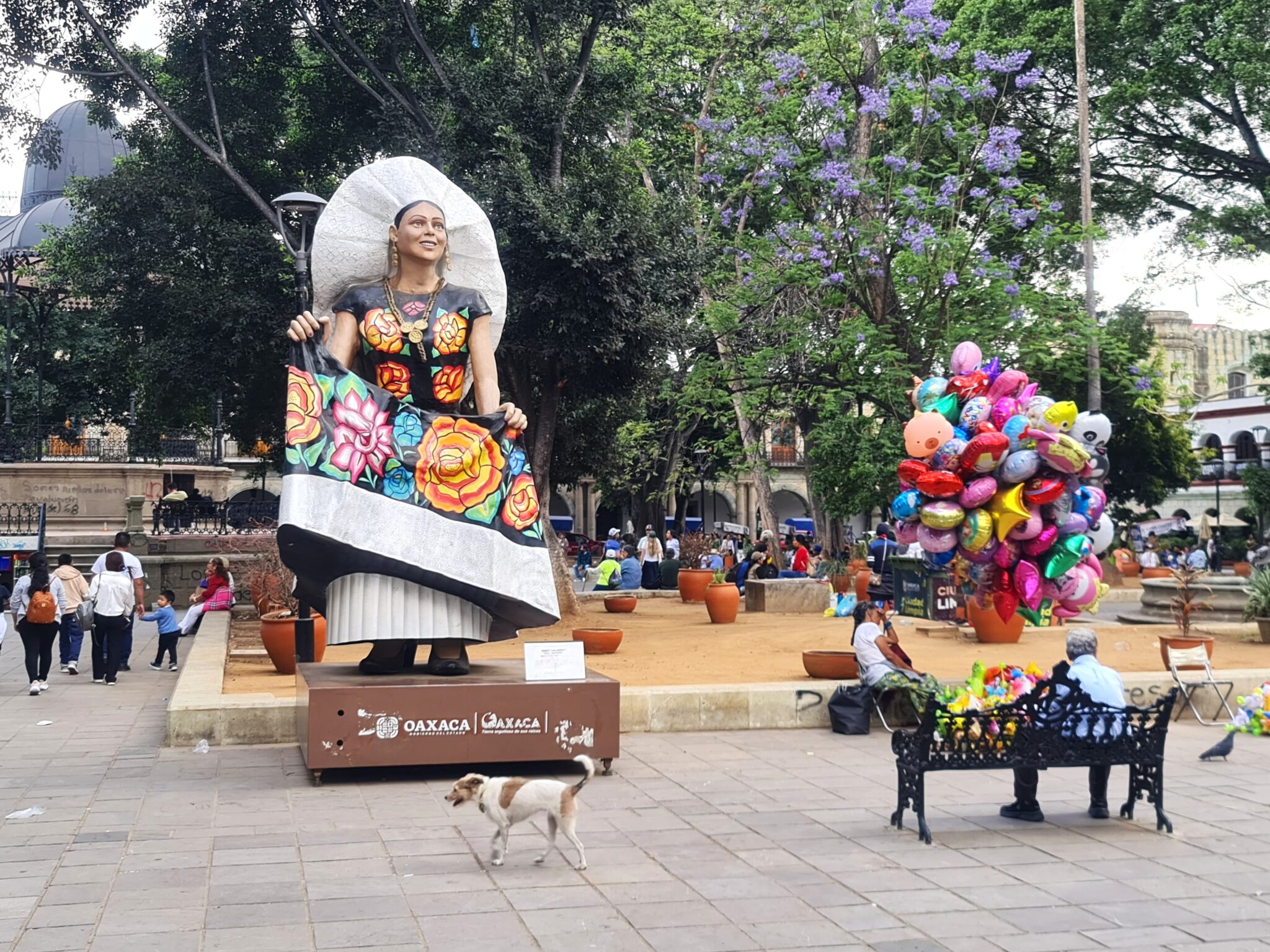 Die letzten Tage verbrachten wir in Oaxaca und in Tule, ganz in der Nähe der Stadt. Oaxaca ist bekannt für seine hervorragende Küche, seine Kultur und seinen Mezcal – und genau das genießen wir ausgiebig. Wir probieren lokale Spezialitäten wie Kaktusblätter (Nopales), Heuschrecken (Chapulines) und natürlich mehrfach die berühmte Mole – eine Schokoladensauce mit Chili, Gewürzen und Nüssen, die typischerweise mit Hühnchen oder Eiern serviert wird. Bei einer Free Walking Tour mit Jenny erfahren wir viel über die Geschichte der Stadt und die Azteken, die hier einst herrschten.