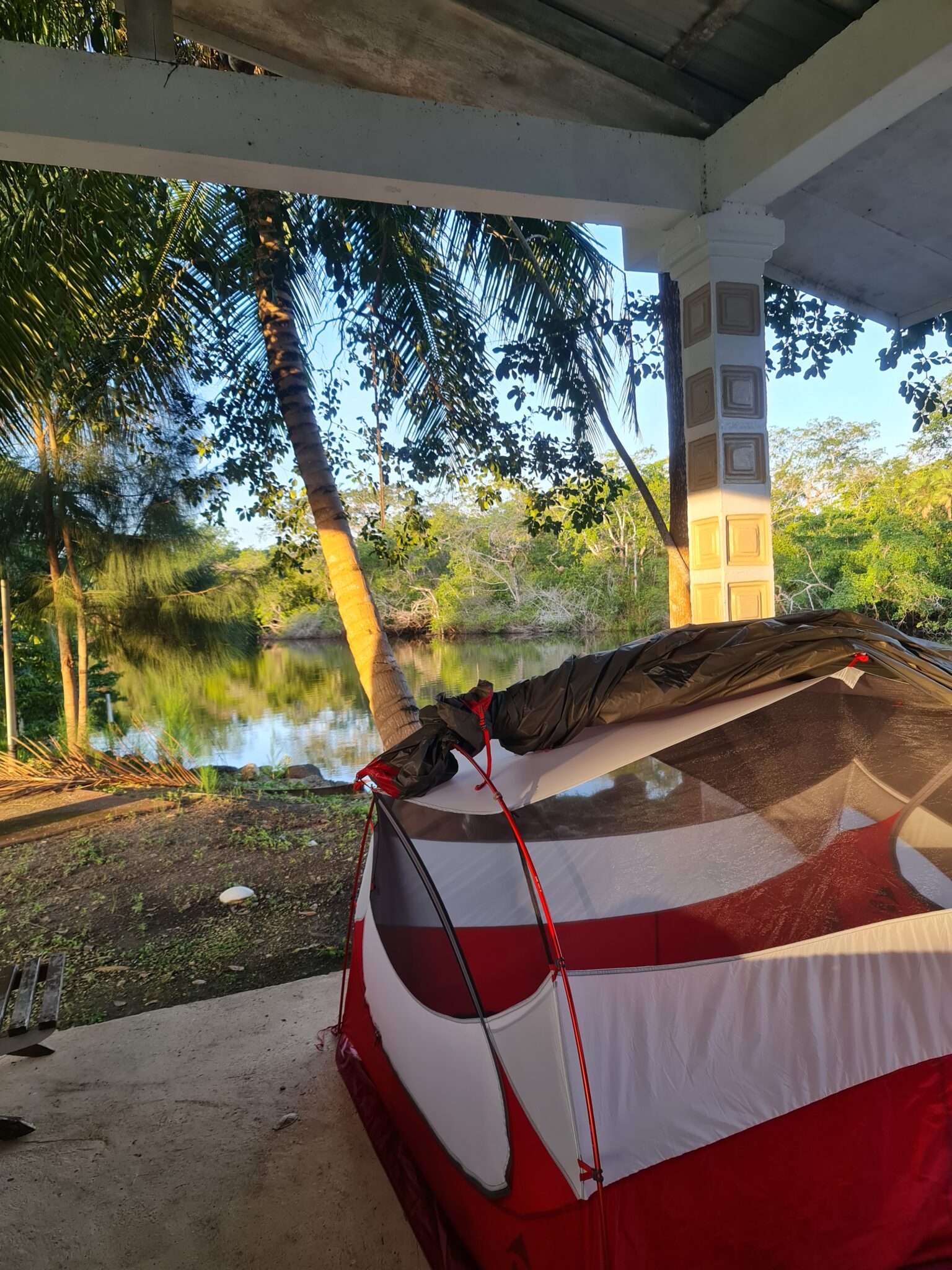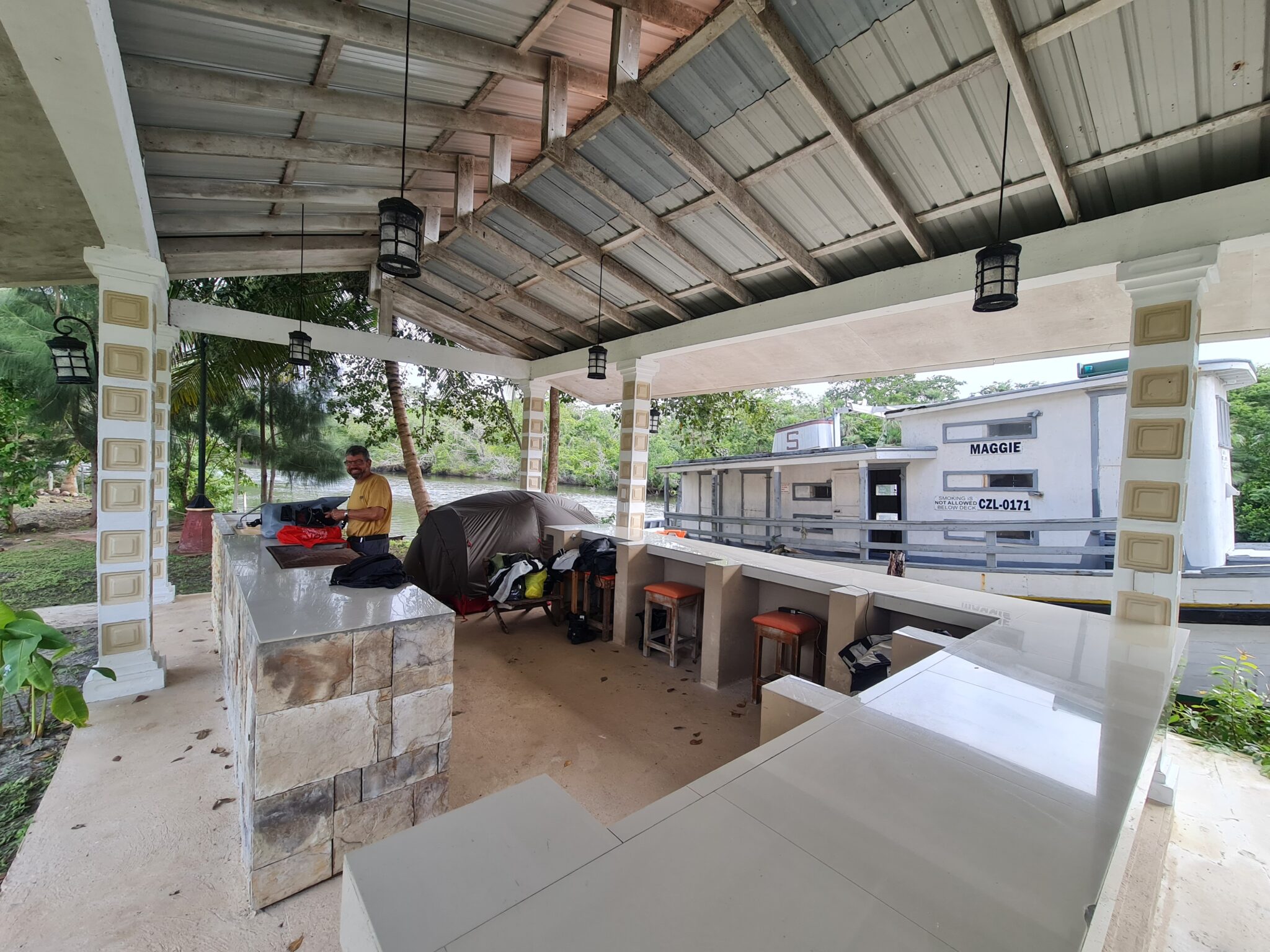 Für unsere „Villa“ (sie hat immer noch keinen Namen) finden wir einen wunderbaren Platz auf einer Hotelanlage: direkt am Fluss, unter einem großen Dach. Eigentlich ist es eine riesige Outdoor-Küche – mit Waschbecken und Ablageflächen, die wir dankbar nutzen. Dusche und Toilette liegen beim schönen Pool nebenan. Vor unserem Zelt ankert ein altes Frachtschiff, und so fühlen wir uns ein bisschen wie im Hafen. Geplant war eine Nacht. Es werden vier.