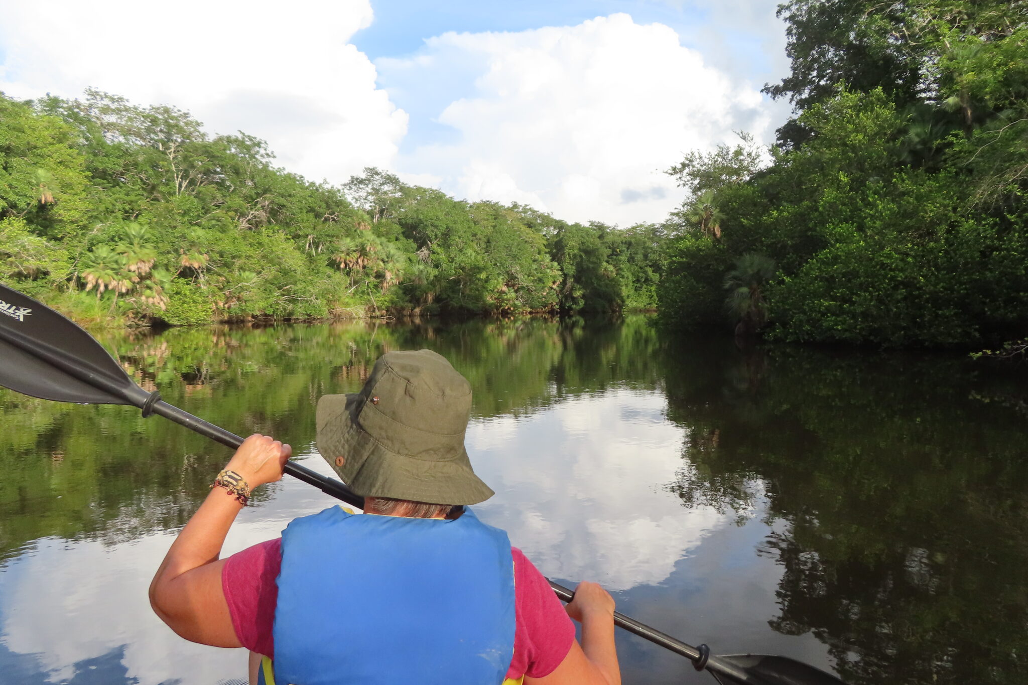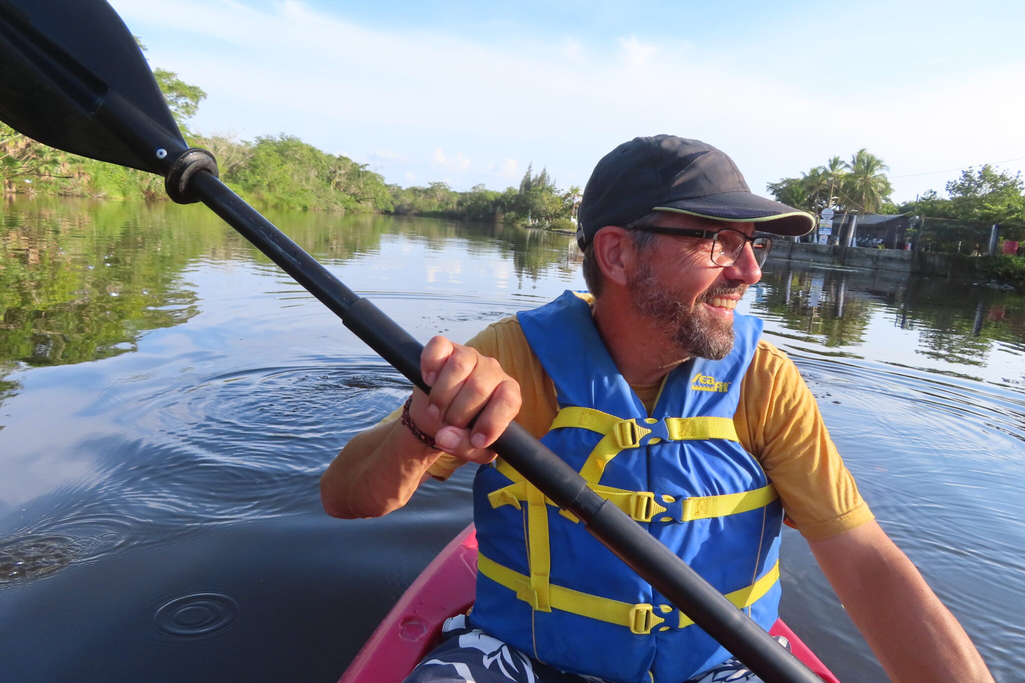 An der Rezeption dürfen wir uns kostenlos ein Kajak ausleihen – eine kleine Therapie nach unserer eher traumatischen Kenter-Erfahrung zuvor. Dieses Mal: mit Schwimmwesten, bei absoluter Windstille, auf einem Fluss ohne Strömung.