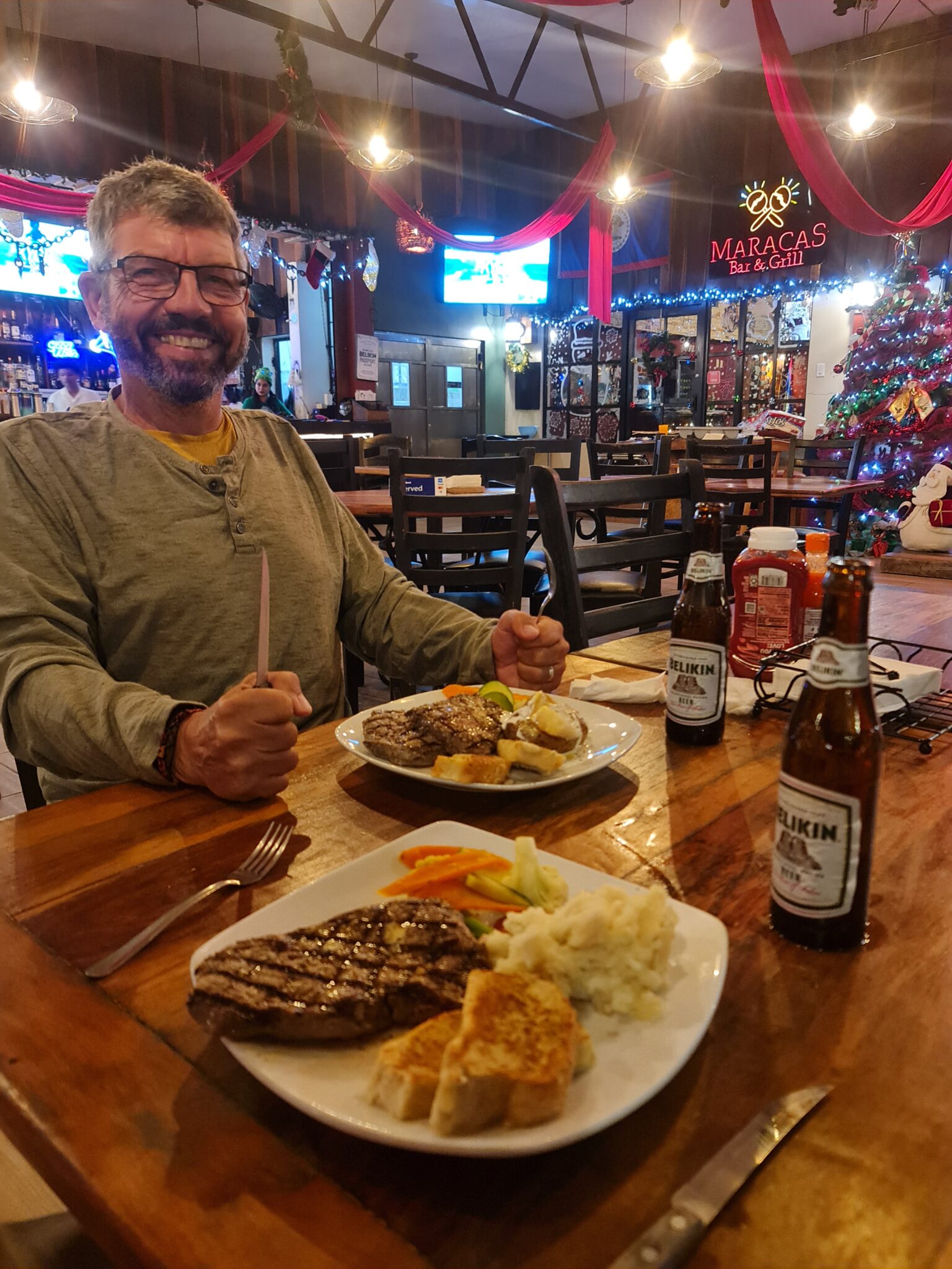 Das Restaurant ist hervorragend, an Heiligabend genießen wir ein richtig gutes Steak, und das Dach über unserem Zelt schützt uns zuverlässig vor den immer wieder einsetzenden Regenschauern.
