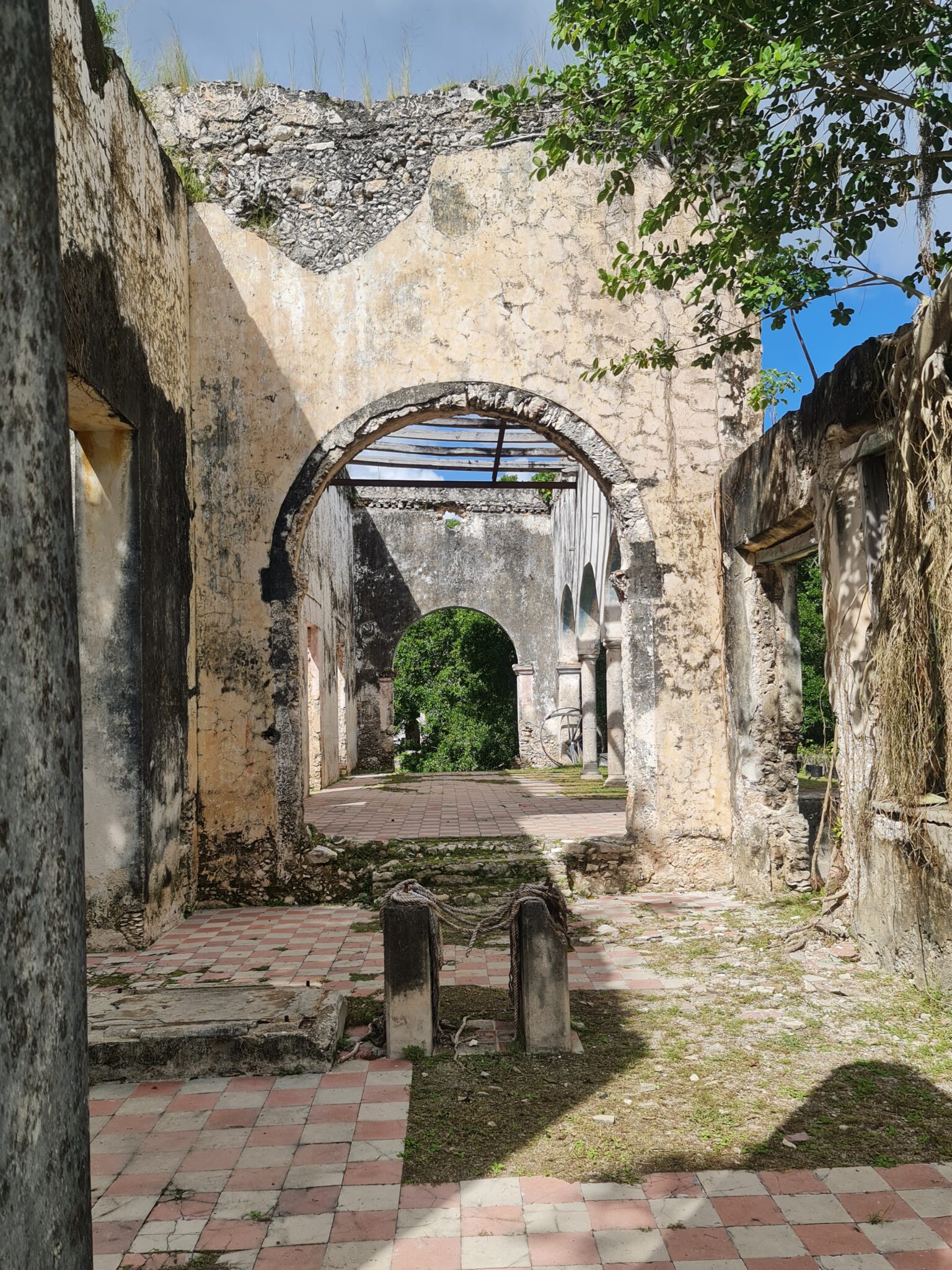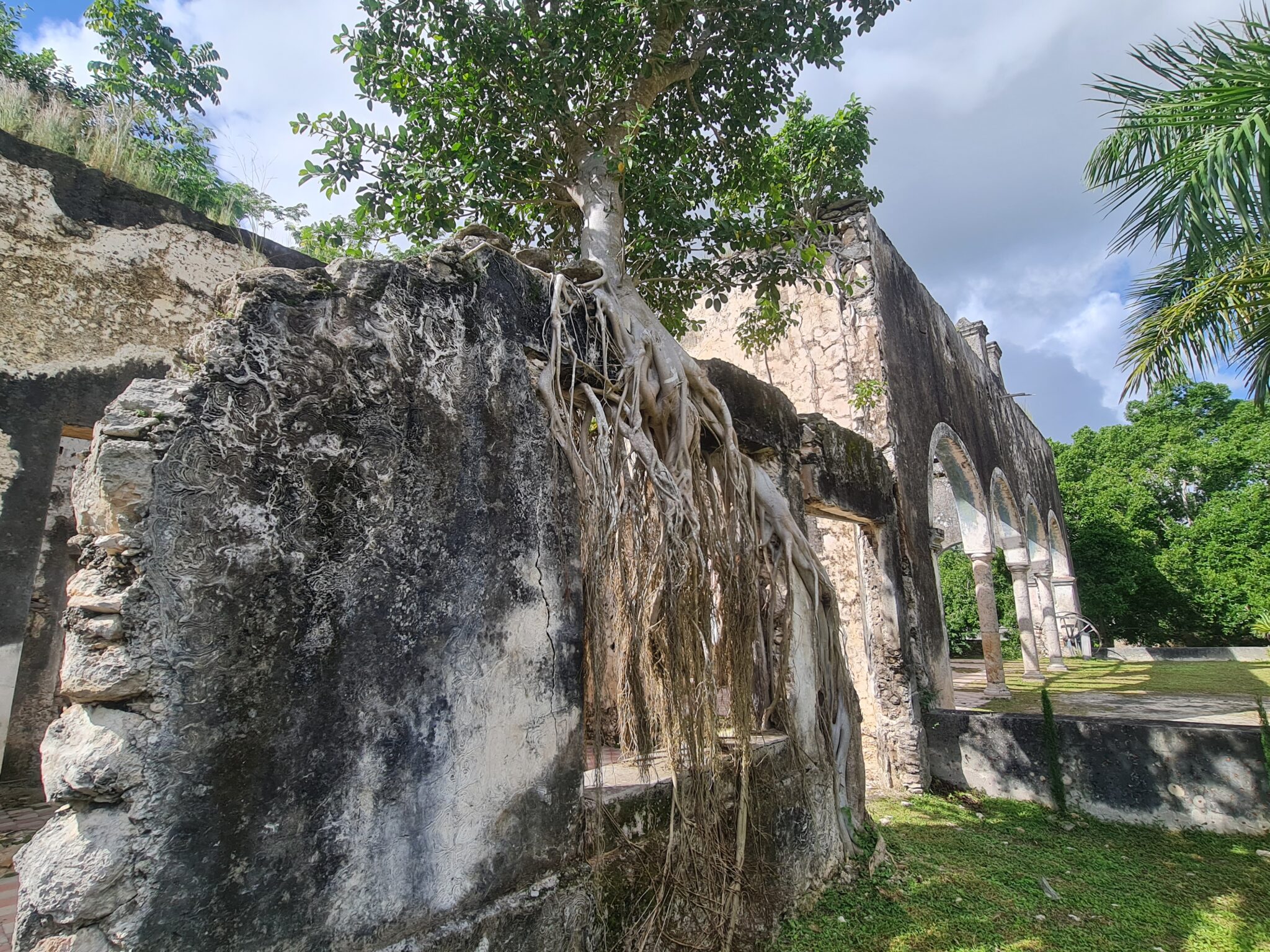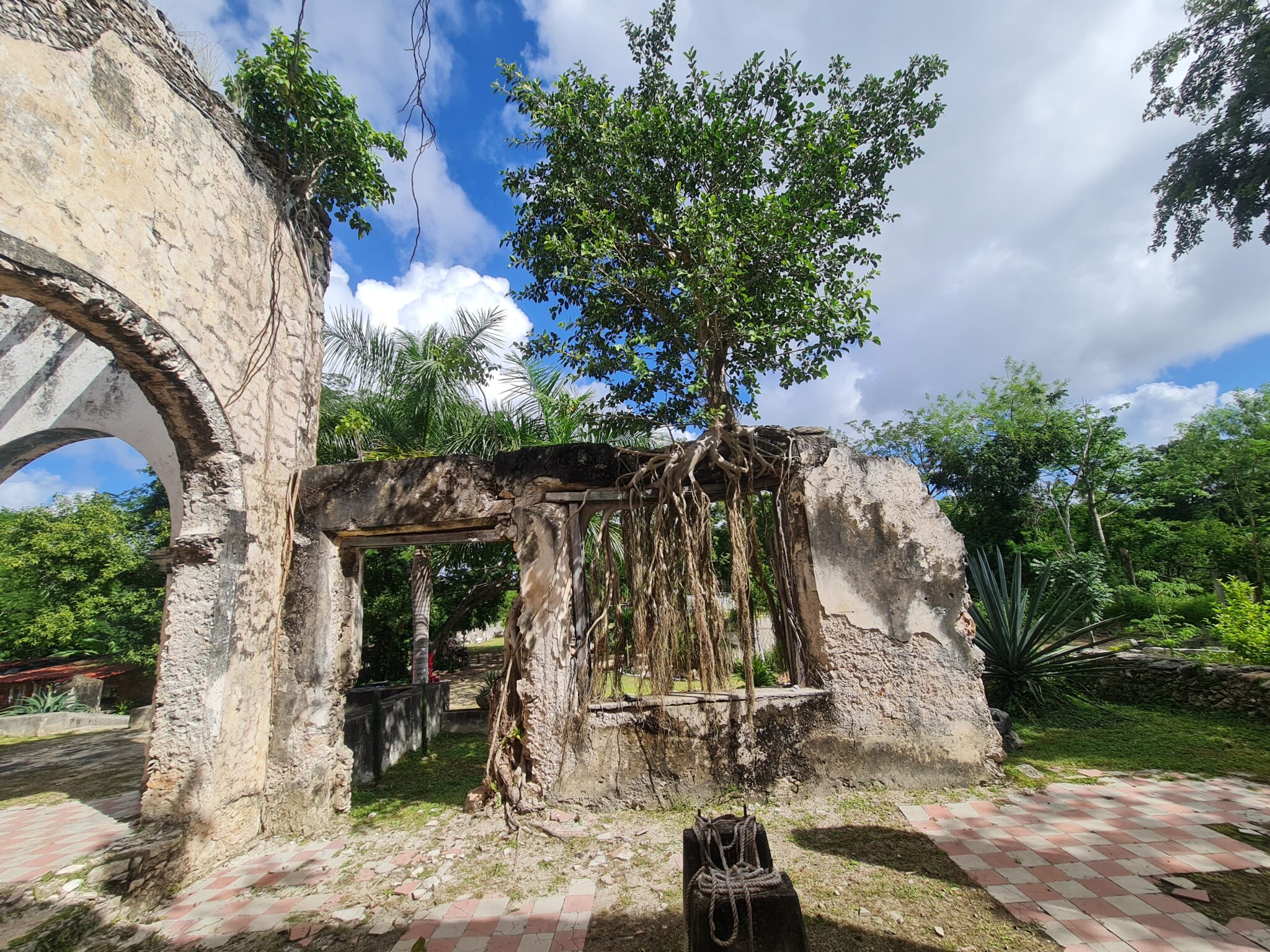Einst eine blühende Sisal-Hacienda – heute Ruinen, umgeben von zwei traumhaften Cenoten. Zwischen einsturzgefährdeten Mauern und einer alles überwuchernden Natur versuchen wir uns vorzustellen, wie hier früher das Summen der Entfaserungsmaschinen, das Klirren der Werkzeuge und die Stimmen der Arbeiter zu hören waren.