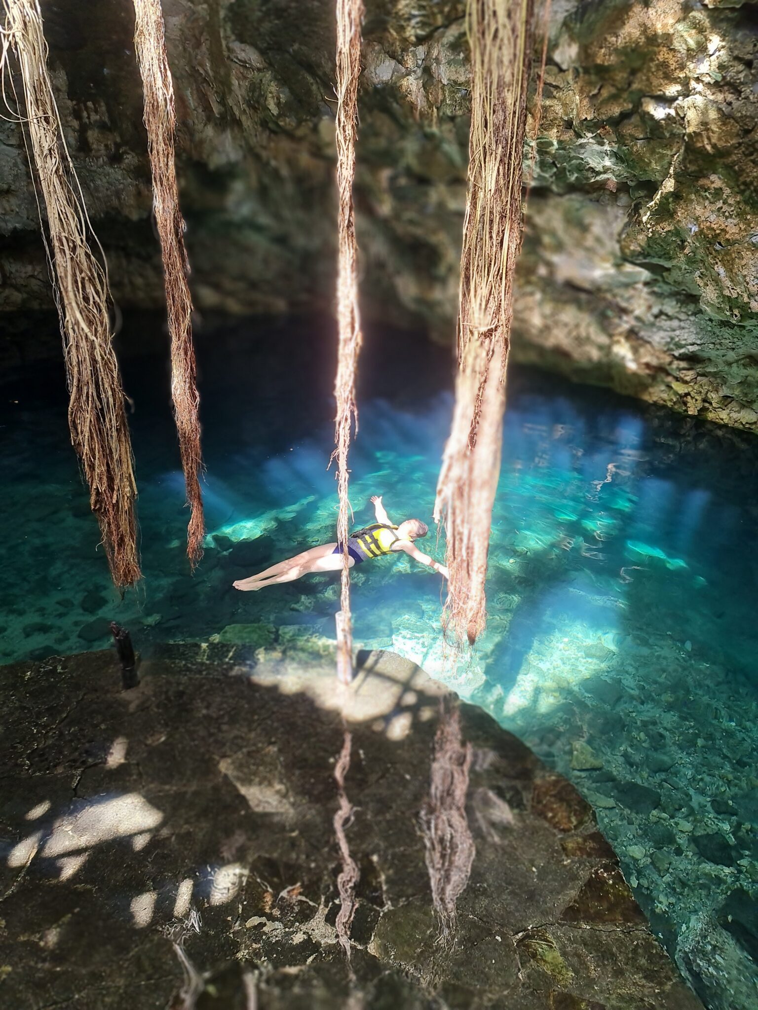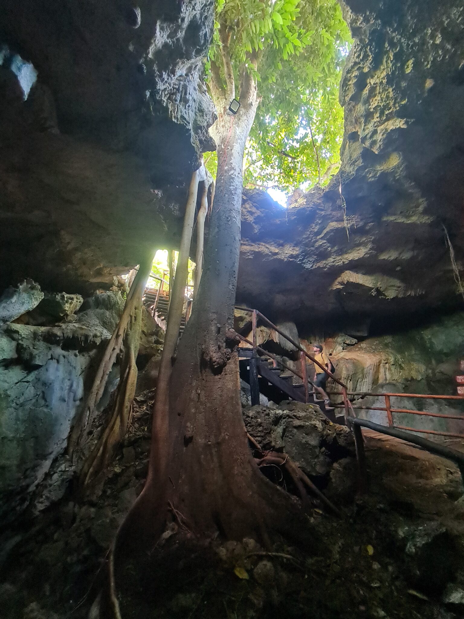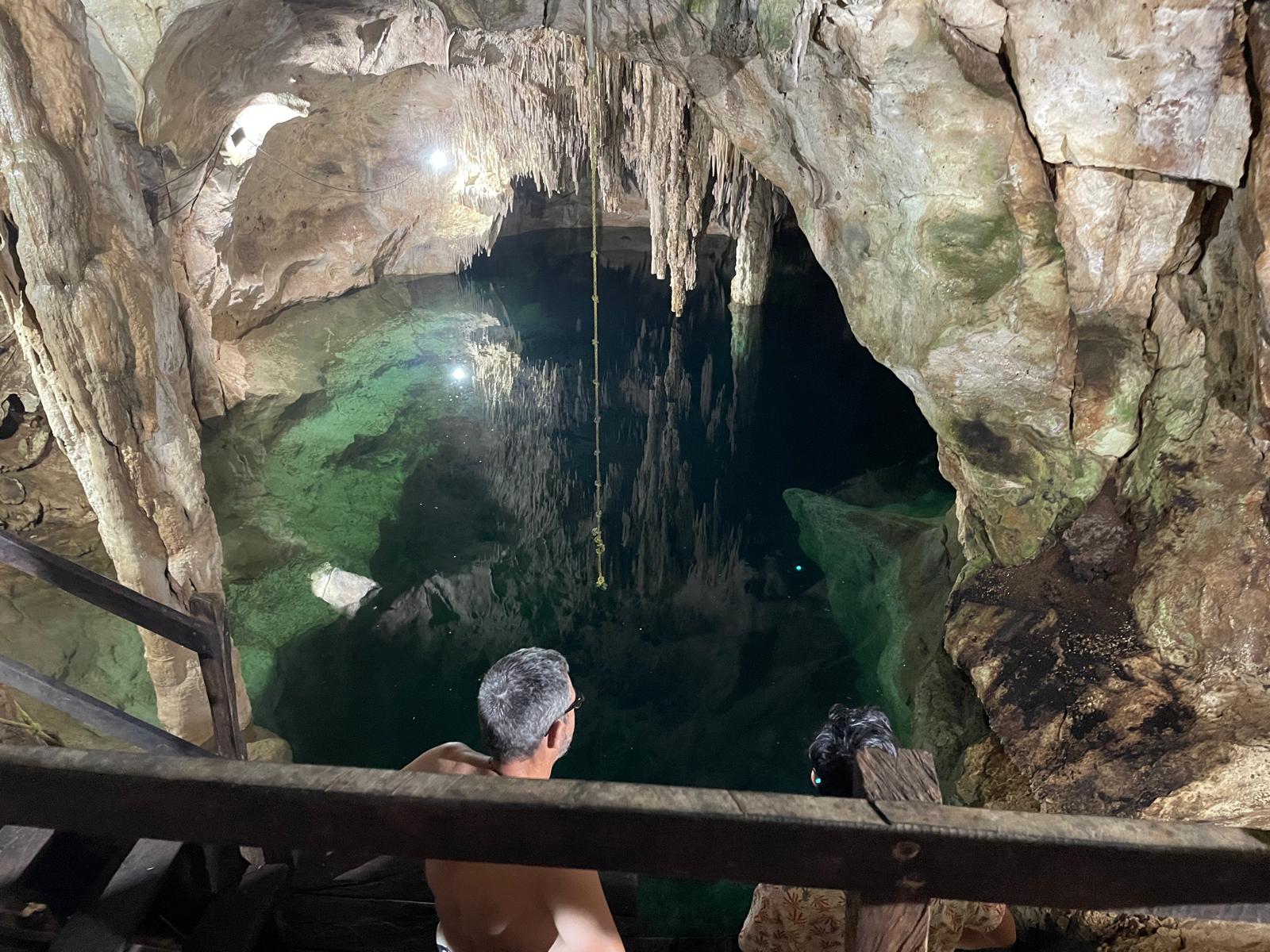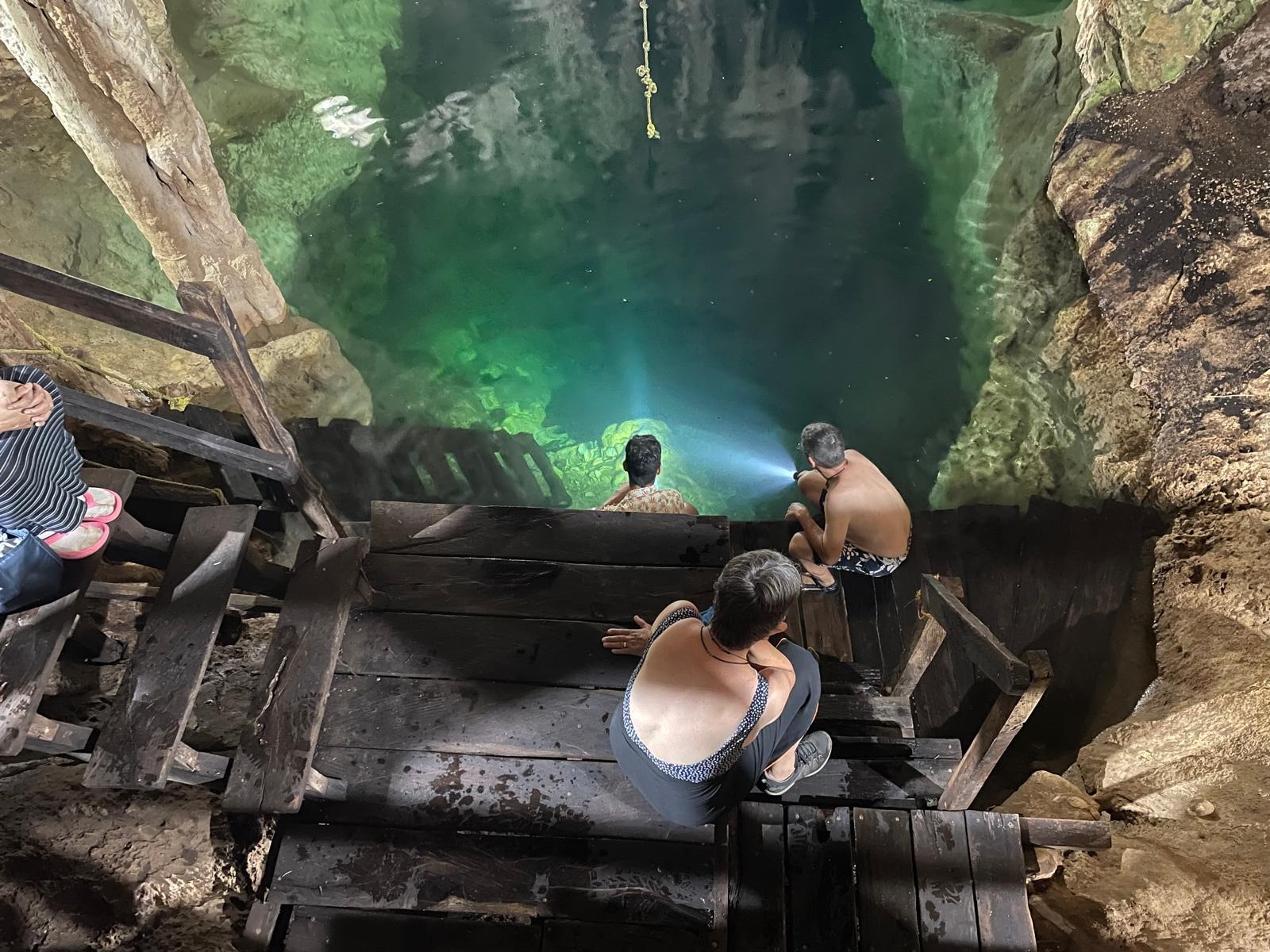 Nach einigen Minuten halten wir an der ersten Cenote. Bevor wir die Treppe hinabsteigen, bleibt Aleph stehen, legt eine Hand auf seine Brust und bittet – ganz leise – um Erlaubnis, diesen Ort betreten zu dürfen. Dann führt er uns Hand in Hand über eine schmale, steile Treppe hinunter in die Höhle. Unten ist es vollkommen dunkel.