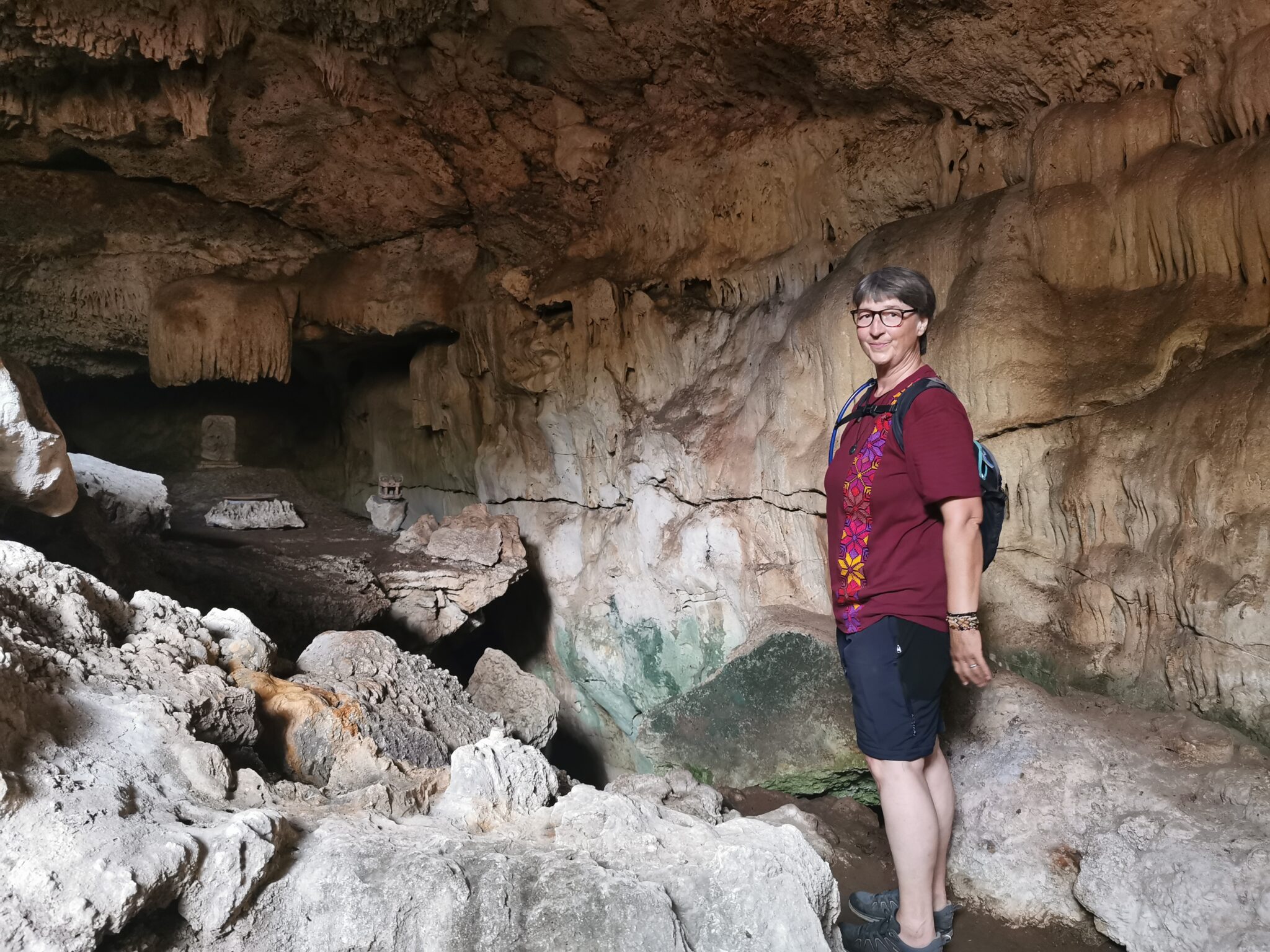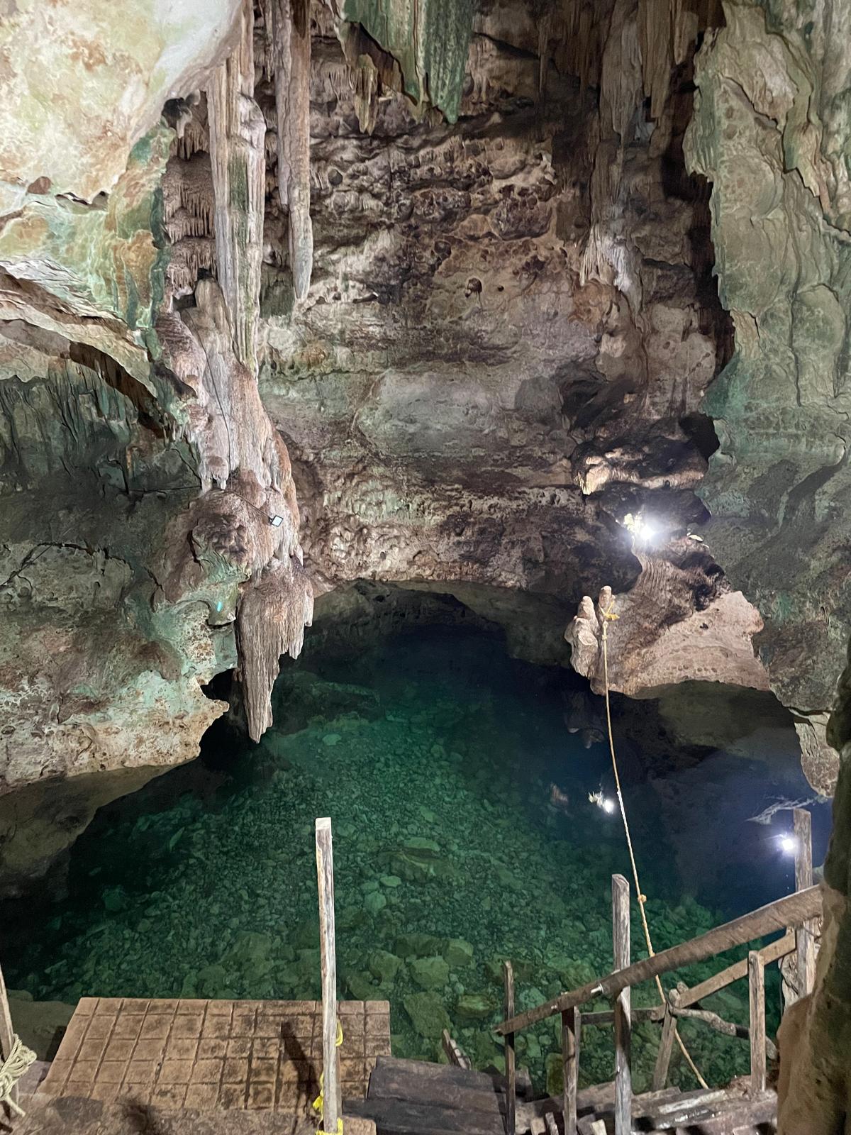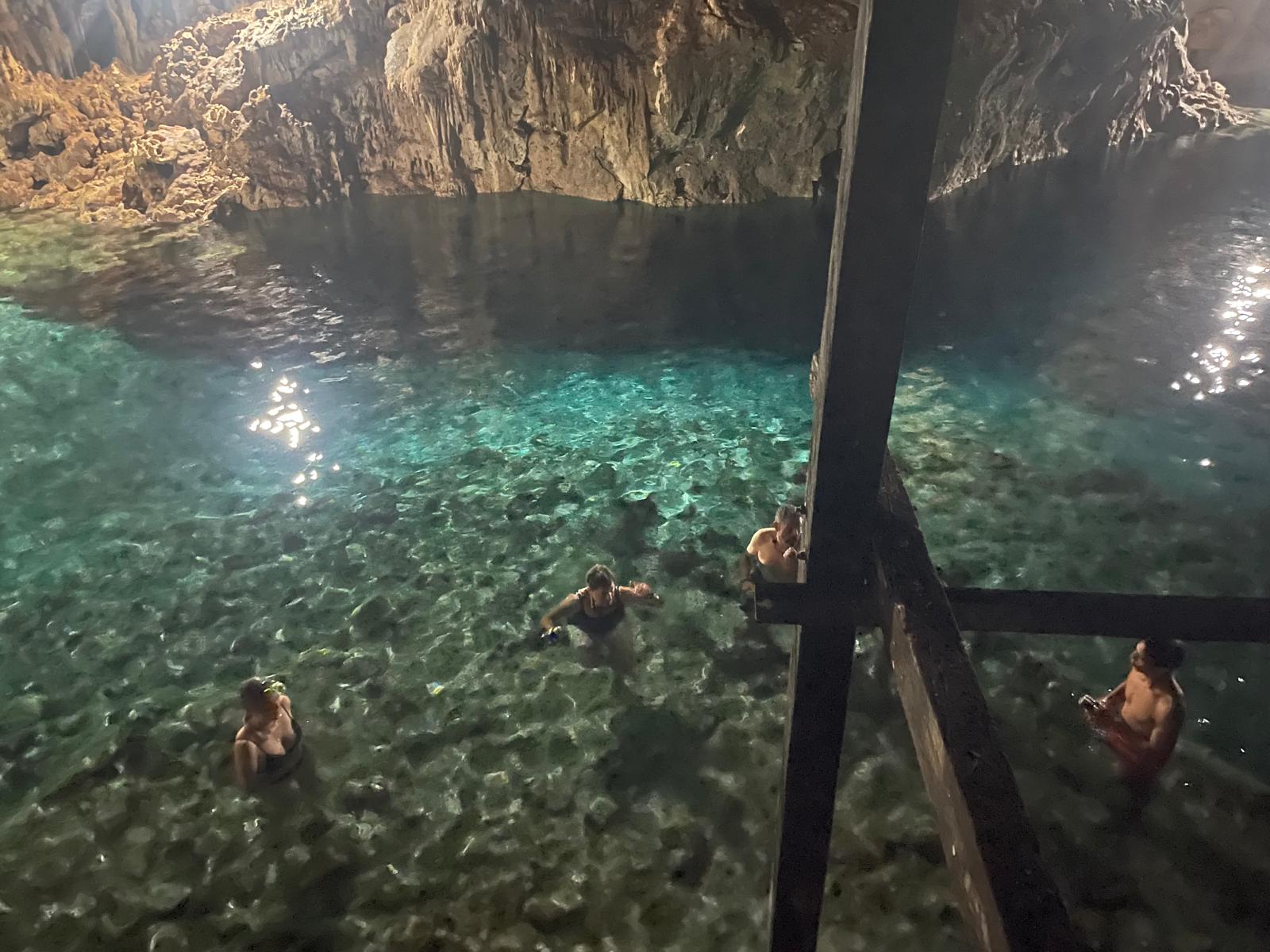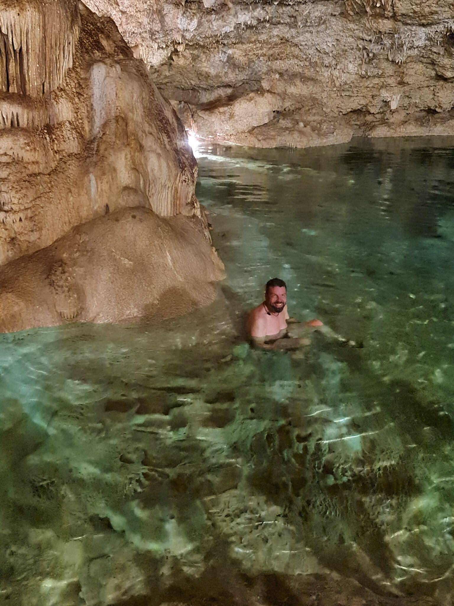 Vor uns liegt eine unterirdische Welt: kristallklares Wasser, in dem die Scheinwerfer bis auf den Grund scheinen. Tropfsteine hängen wie Vorhänge von der Decke, die Felsen glitzern feucht, und jeder Laut hallt in der Höhle wider. Niemand sagt ein Wort. Niemand wagt es, diese stille Schönheit zu stören. Nur langsam durchbrechen wir diesen Zauber, um voller Ehrfurcht in das erfrischende Nass einzutauchen. Herrlich!