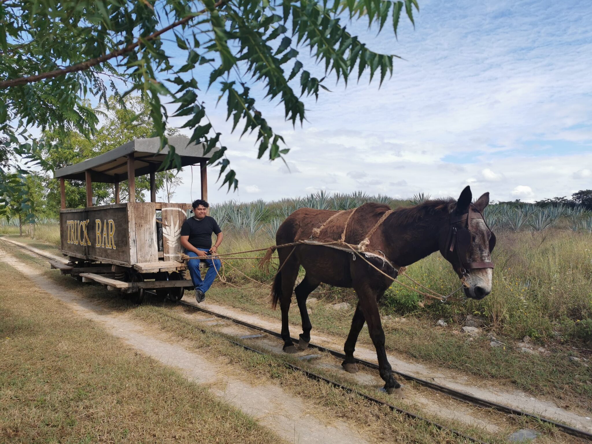 Am Abend fragt uns Aleph, ob wir Lust auf ein besonderes Erlebnis hätten: eine Fahrt mit einem originalen Schienenwagen, wie er früher zum Sisaltransport genutzt wurde – gezogen von einem Pferd – mitten durch den Wald zu mehreren Cenoten bei Nacht. Wir sagen natürlich sofort ja. Mit dabei: Linda und Max, zwei Reisende aus unserem Hostel.