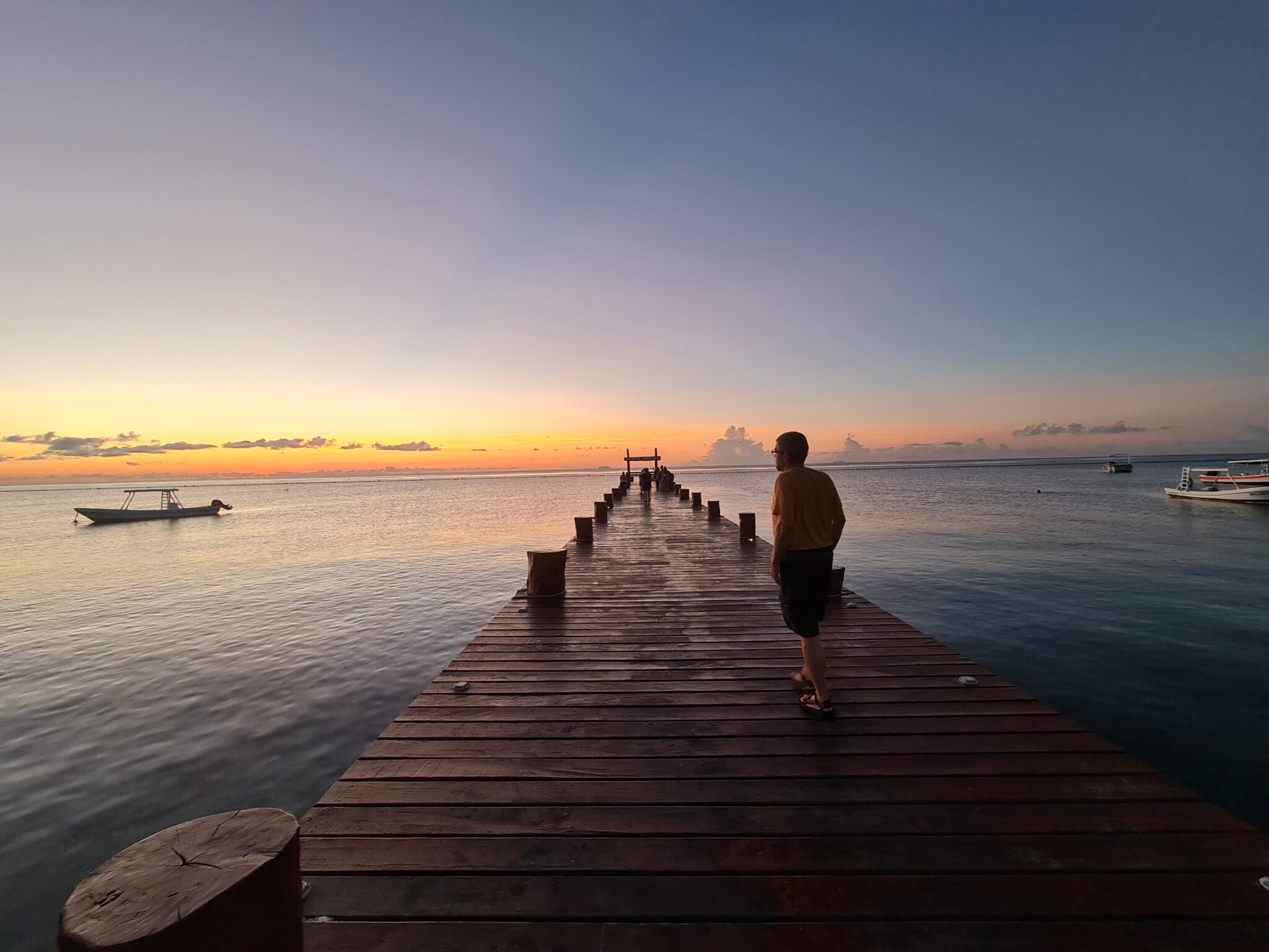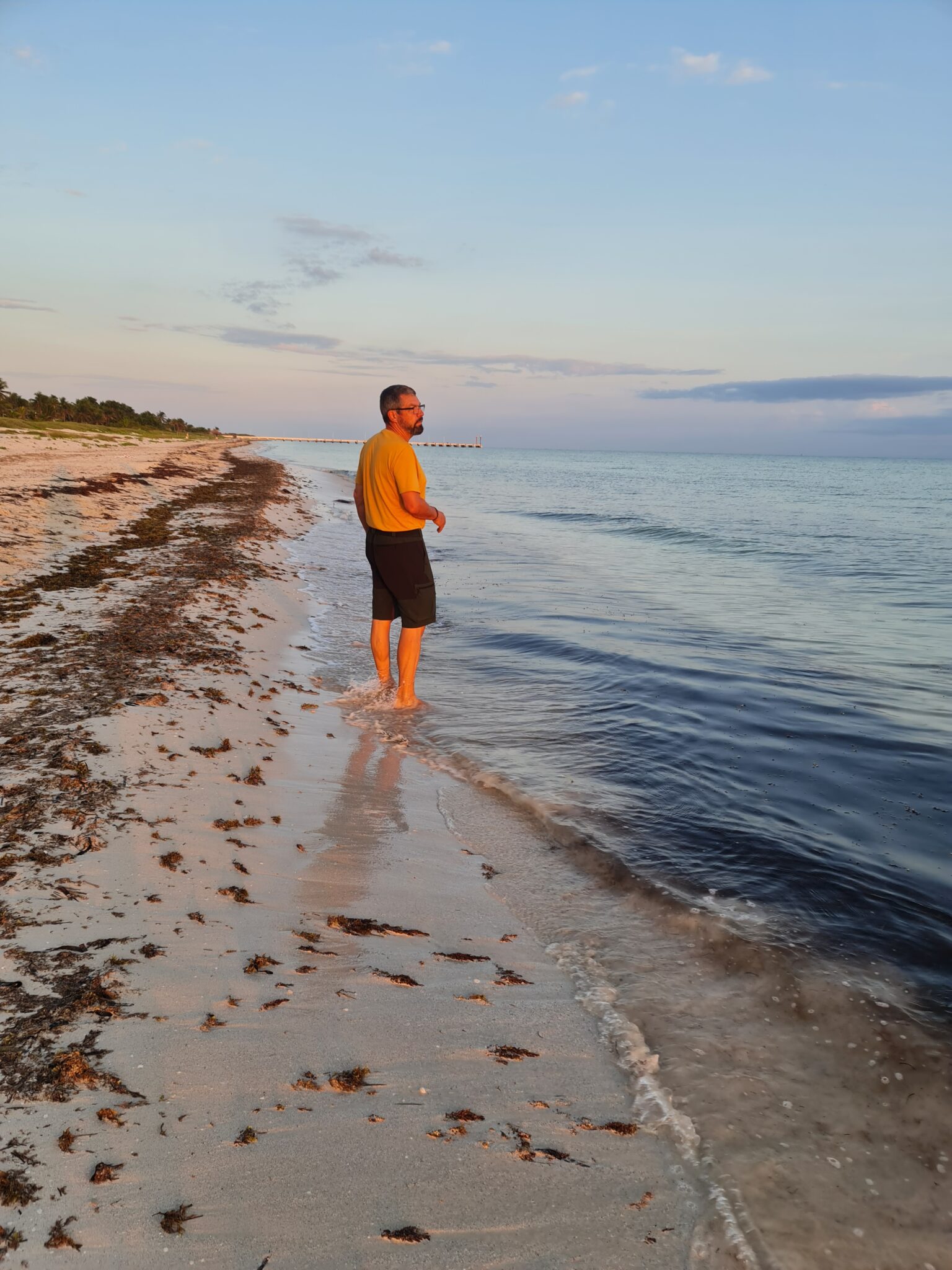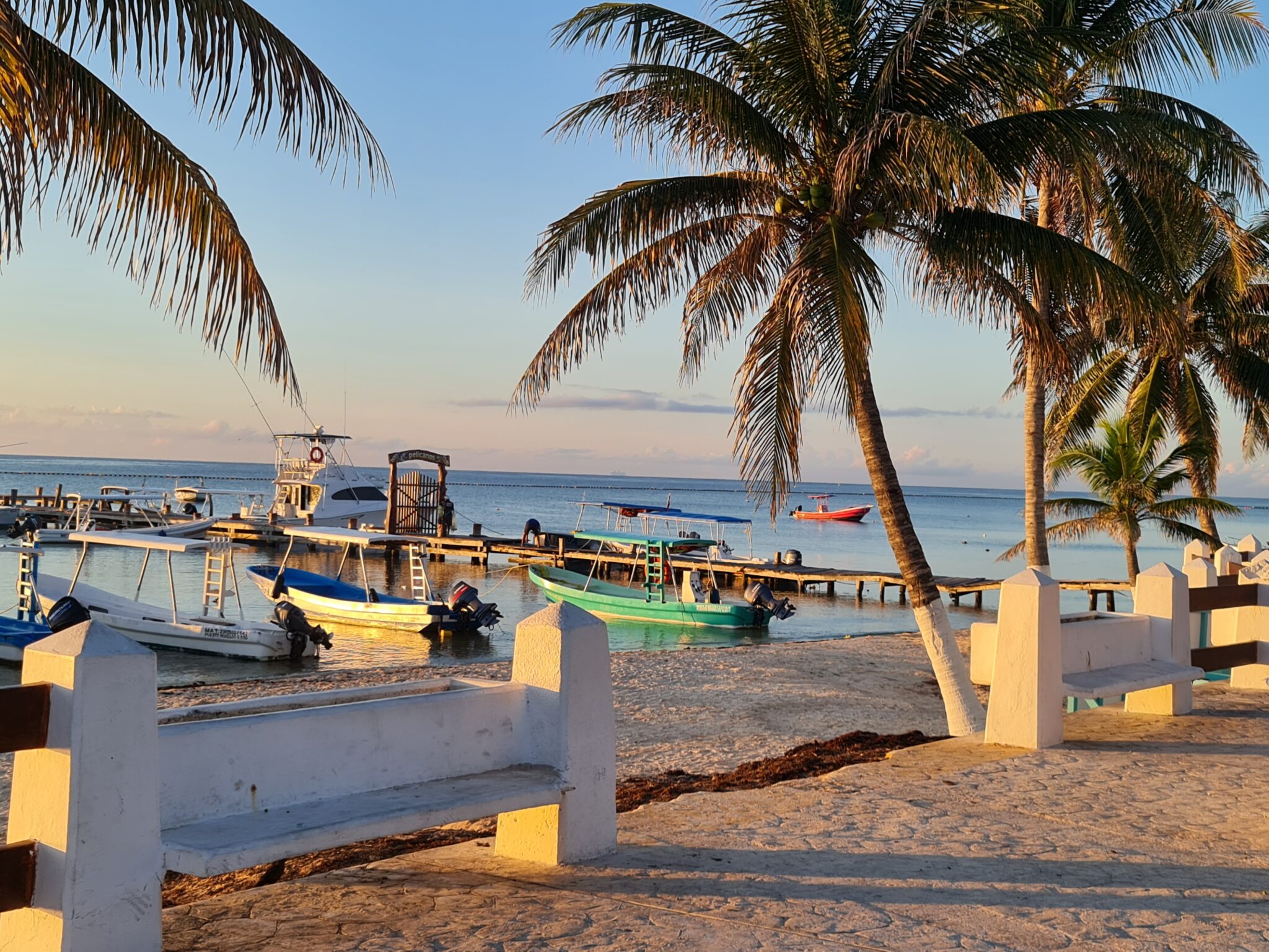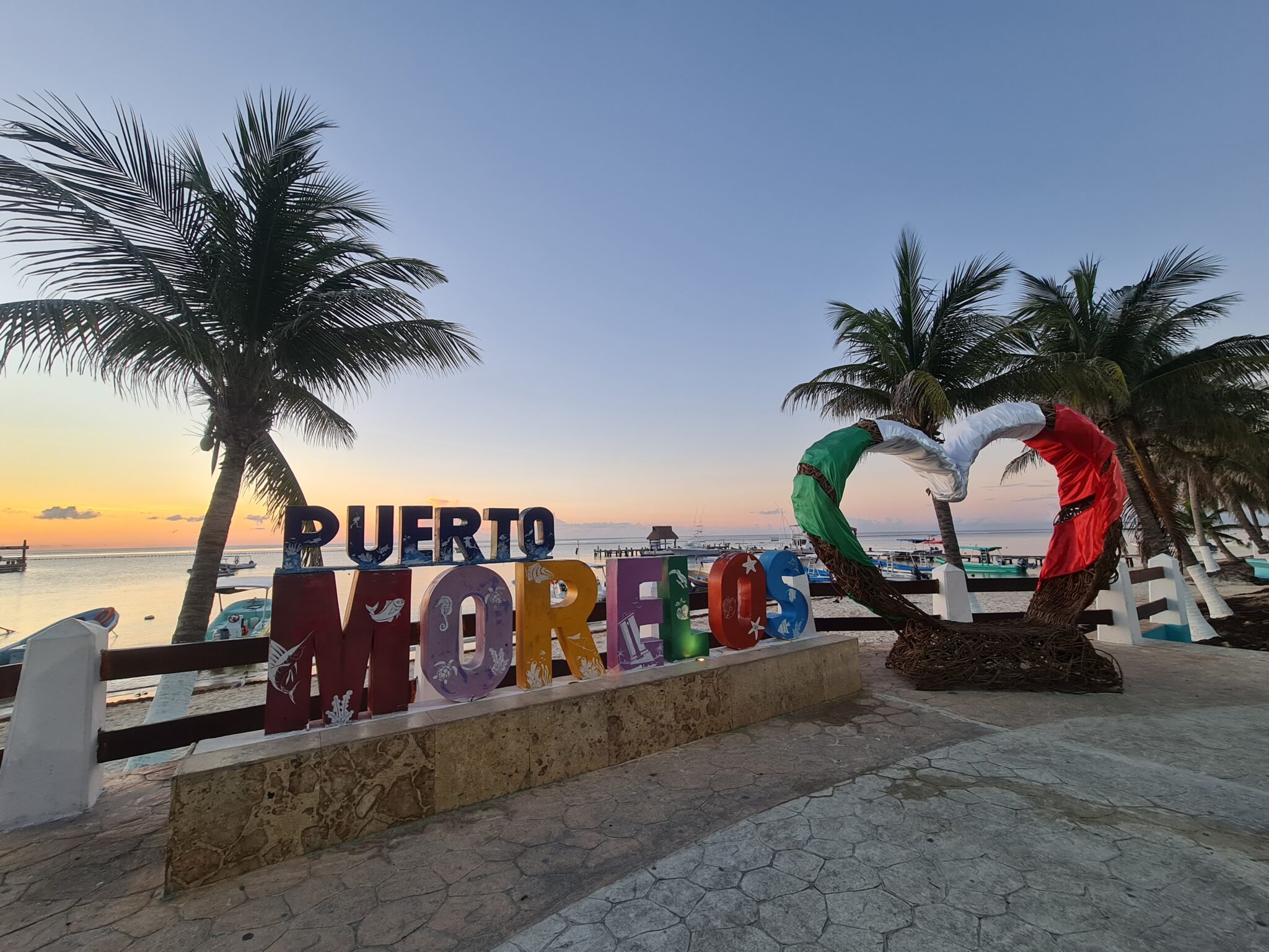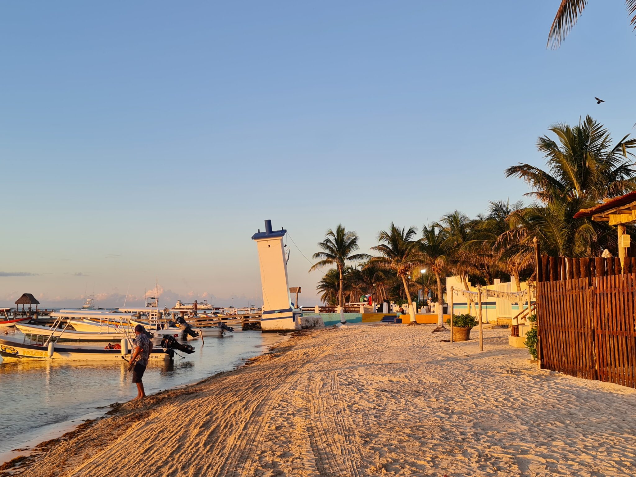 Im Mietwagen angekommen, drehen wir die Klimaanlage auf die höchste Stufe. Noch genießen wir diesen Luxus – das wird sich bald ändern. Unsere erste Nacht in Puerto Morelos ist entsprechend tropisch: heiß, klebrig, unruhig. Wer denkt im kalten Deutschland daran, ein Zimmer mit Klimaanlage zu buchen? Genau – ich nicht. Nach einer kurzen, verschwitzten Nacht und einem Jetlag, der uns um 5 Uhr aus den Betten wirft, zieht es uns ans Meer. Das Meer! Sonnenaufgang über dem Karibikstrand, T-Shirt, Shorts, nackte Füße im Sand – so kann der Tag beginnen.