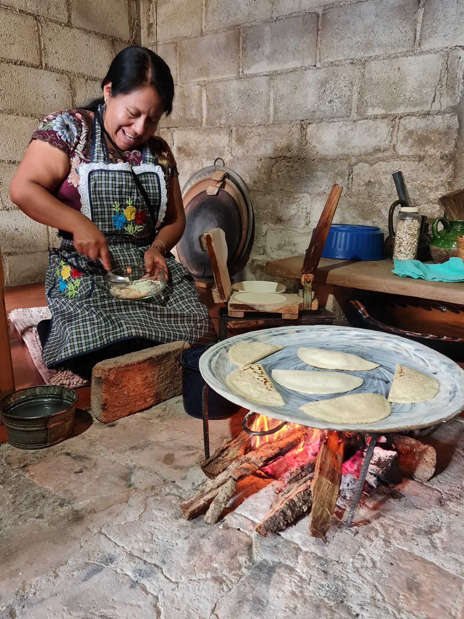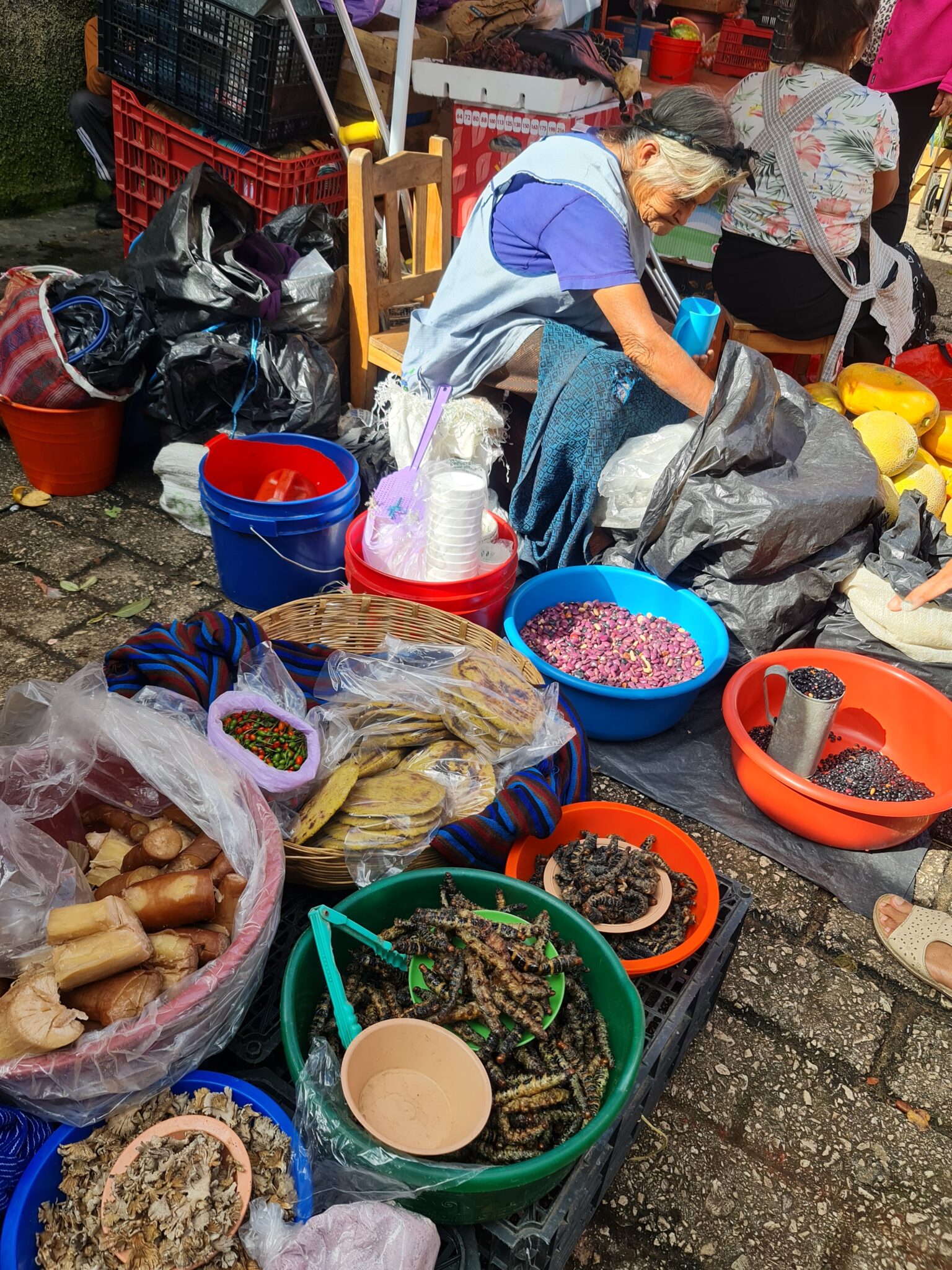 Jeden Tag nehmen uns Reyna und Daniel mit in ihr San Christóbal – Einkaufen auf dem Markt, gemeinsames Kochen typischer Gerichte: Tacos, Tortillas, Quesadillas, Pollo Asado, Kürbisblüten – und ja, wir haben auch leckere Raupen gegessen. Dazu hausgemachte Limonada – herrlich!