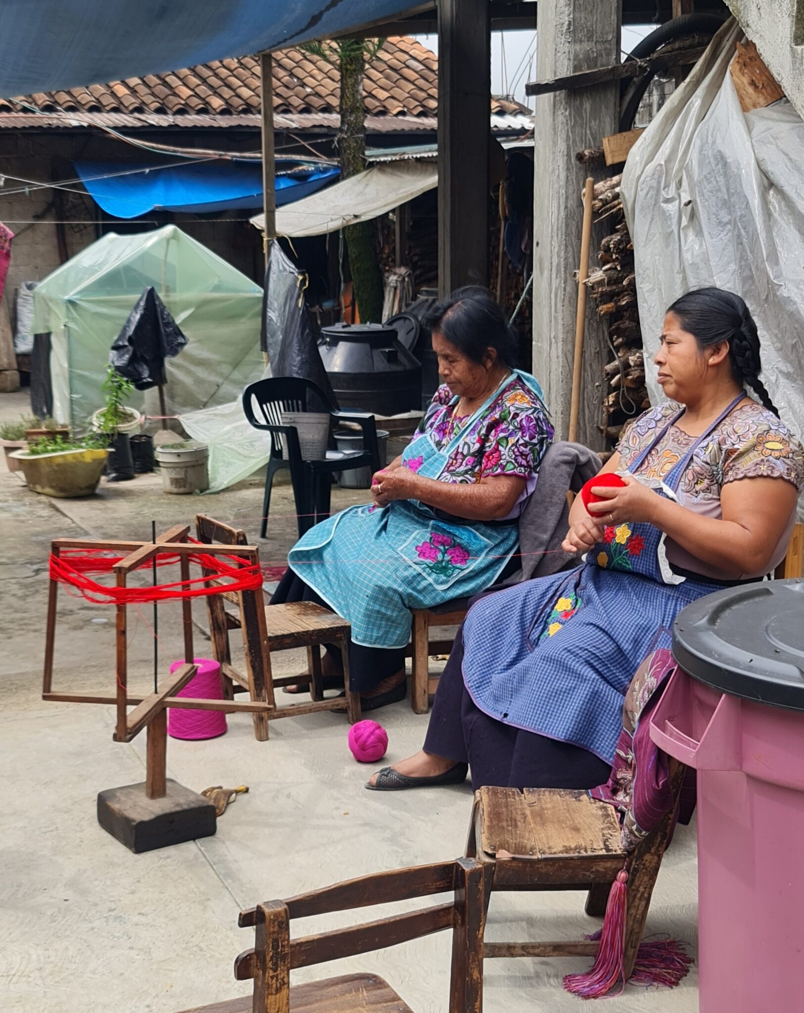 In der Nachbargemeinde Zinacantán besuchen wir Freunde von Reyna und Daniel. Im Hof sitzen die Frauen der Familie, weben, sticken, wickeln Wolle – konzentriert, friedlich. 12 Tzotzilfrauen fertigen hier täglich bunte Schals, Taschen, Tischläufer und Blusen. Ein wunderschöner Schal in knalligen Mexikofarben landet in meinem Rucksack (er ist quasi selbst hineingehüpft). Drei Tage hat die junge Frau am Webstuhl dafür gebraucht erzählt sie mir auf meine Nachfrage– ein echtes Herzenssouvenir.
