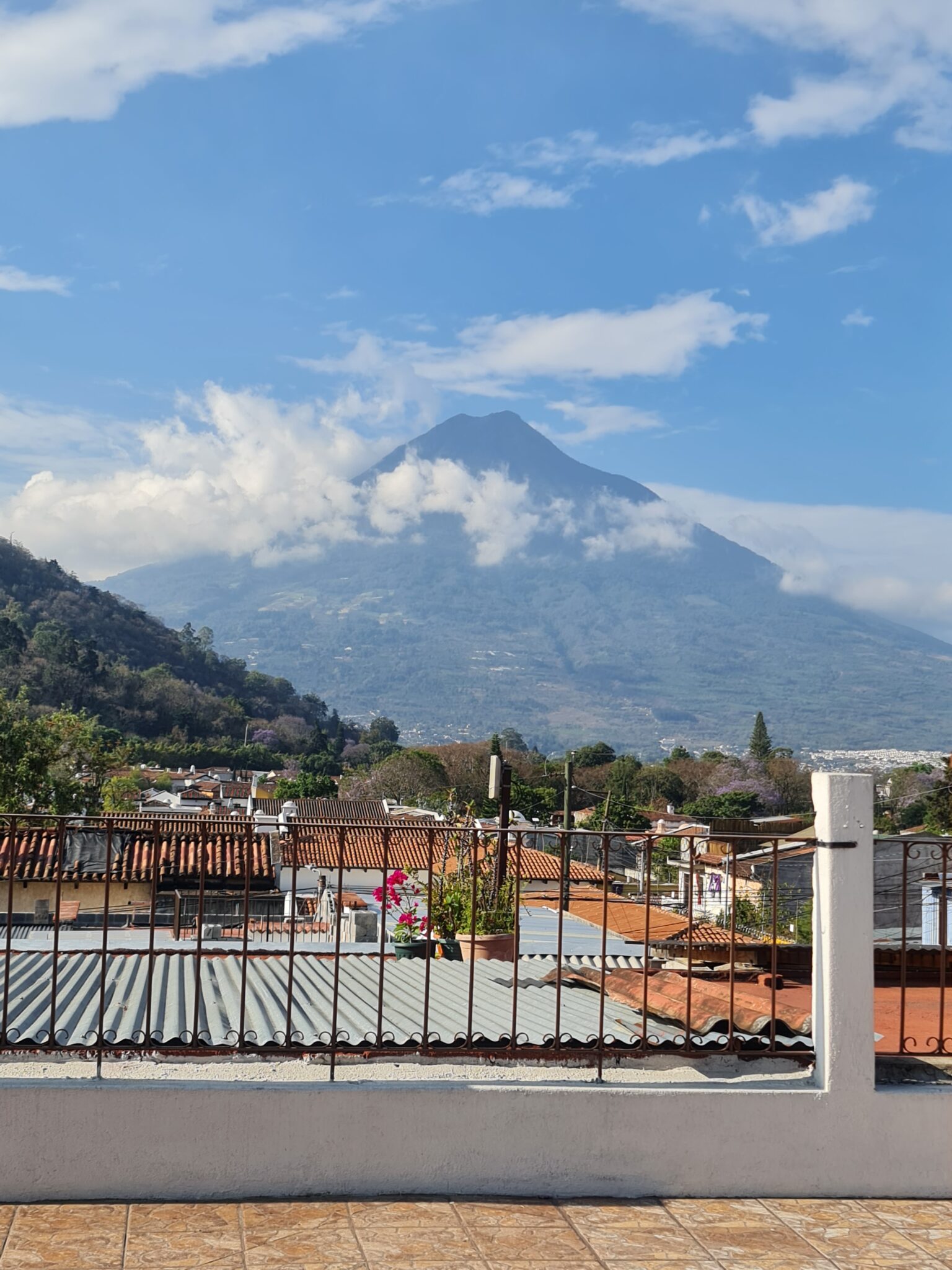 Ein echtes Highlight unserer Unterkunft: die Dachterrasse. Von hier aus haben wir freien Blick auf die umliegenden Vulkane – und nachts sogar auf den Vulkan Fuego, der alle 10 bis 15 Minuten kleine Ausbrüche zeigt. Glühende Lava in der Dunkelheit – eine beeindruckende Naturgewalt, die uns jedes Mal aufs Neue staunen lässt.