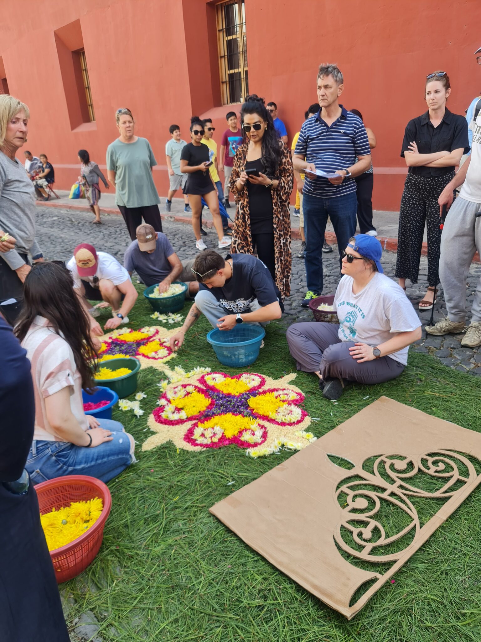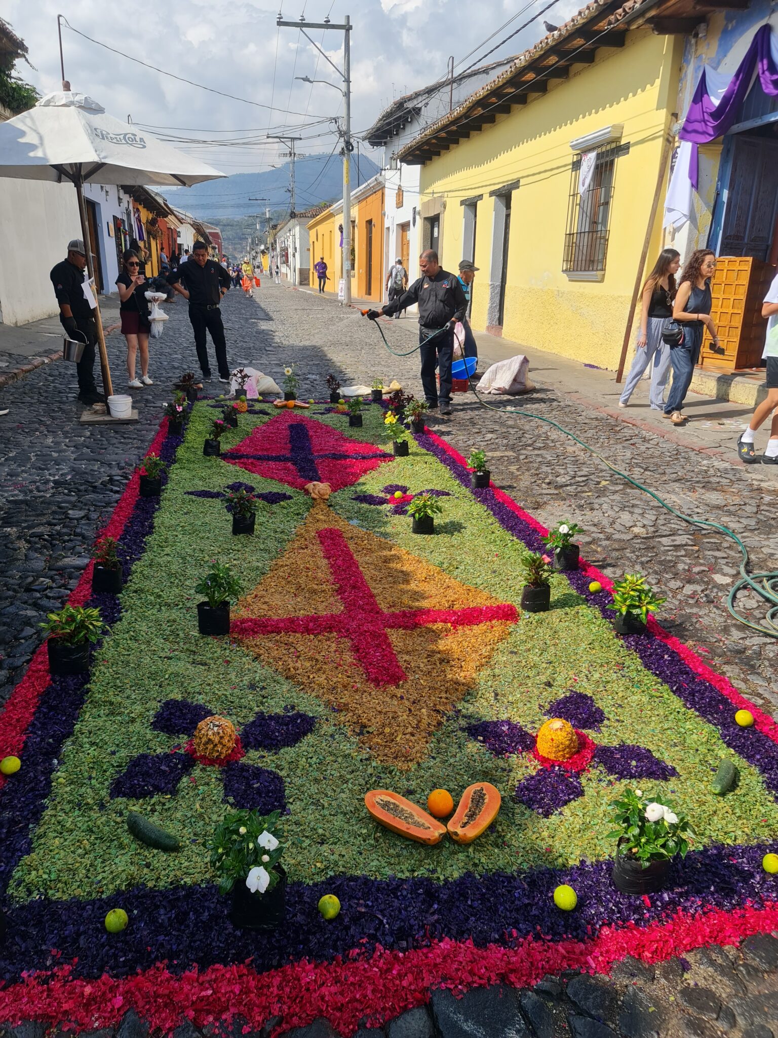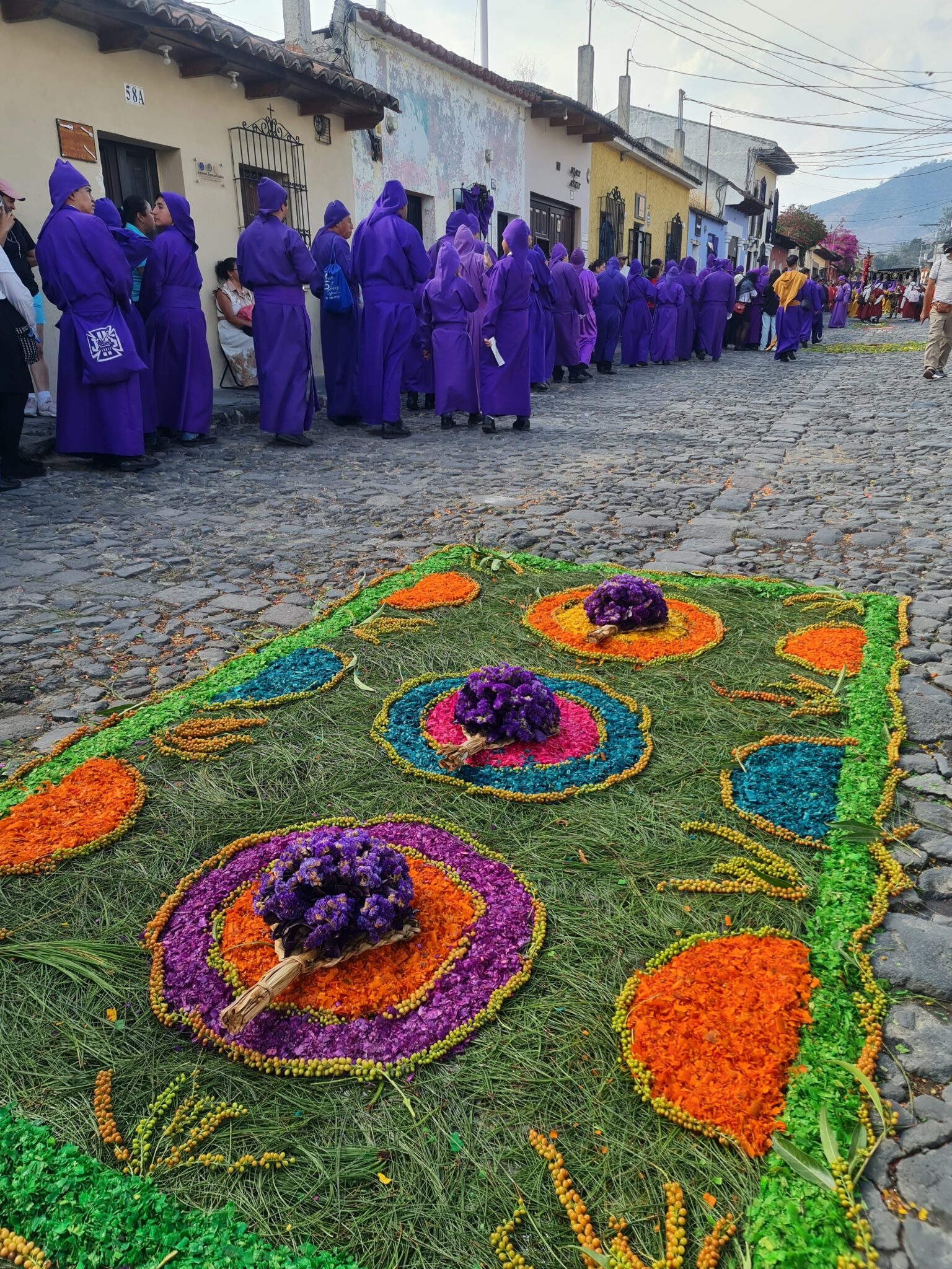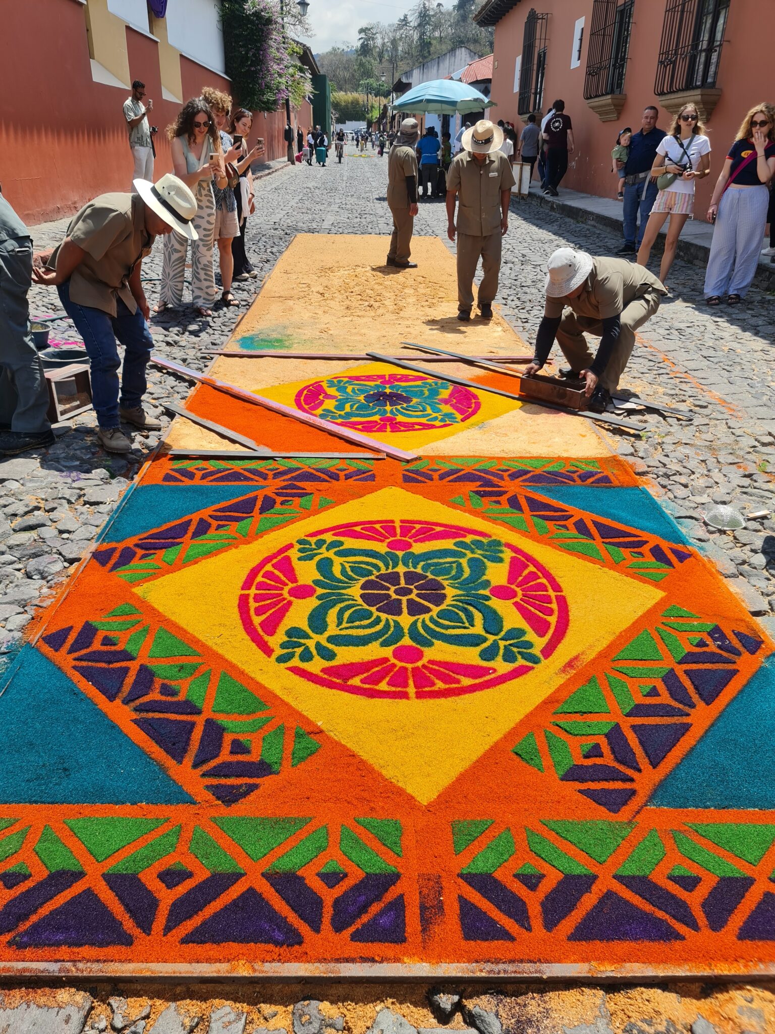Auch wir lassen uns treiben. Wir beobachten, wie die kunstvollen Alfombras – farbenprächtige Teppiche aus Sägemehl, Blumen und anderen Materialien – entstehen. Wir schauen den Menschen zu, die aus allen Teilen des Landes und der Welt hierherkommen. Und natürlich verfolgen wir die Prozessionen selbst: begleitet von lauter, oft düsterer Musik, getragen von Trommelschlägen, bewegen sie sich langsam durch die engen Gassen.