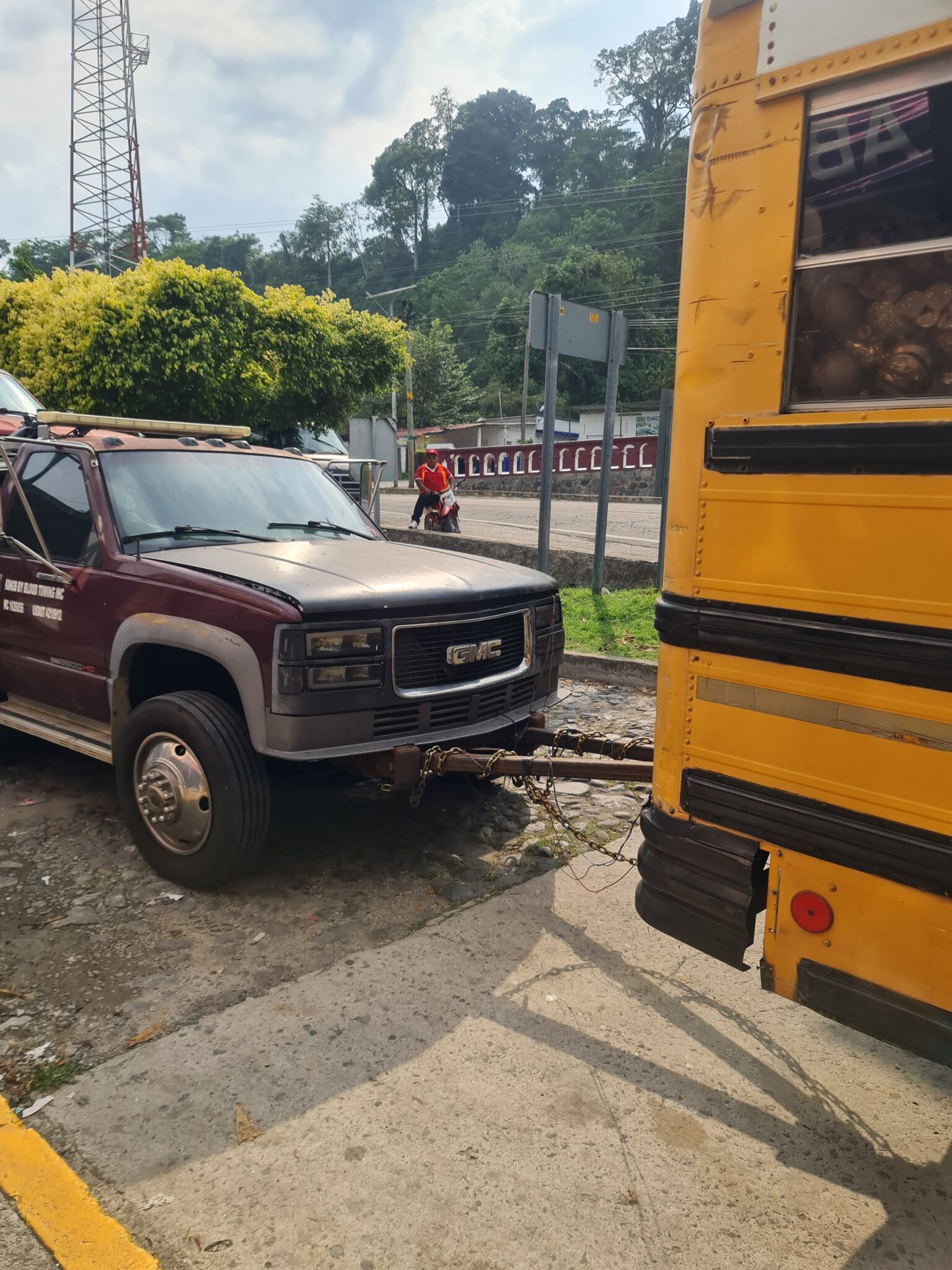 Nur auf der Gegenfahrbahn sehen wir sie wieder: endlose Schlangen von gebrauchten Fahrzeugen aus Mexiko. Und was dort alles unterwegs ist, ist kaum zu glauben – _Unfallwagen, die mit abenteuerliche Konstruktionen nach Guatemala geschleppt werden.