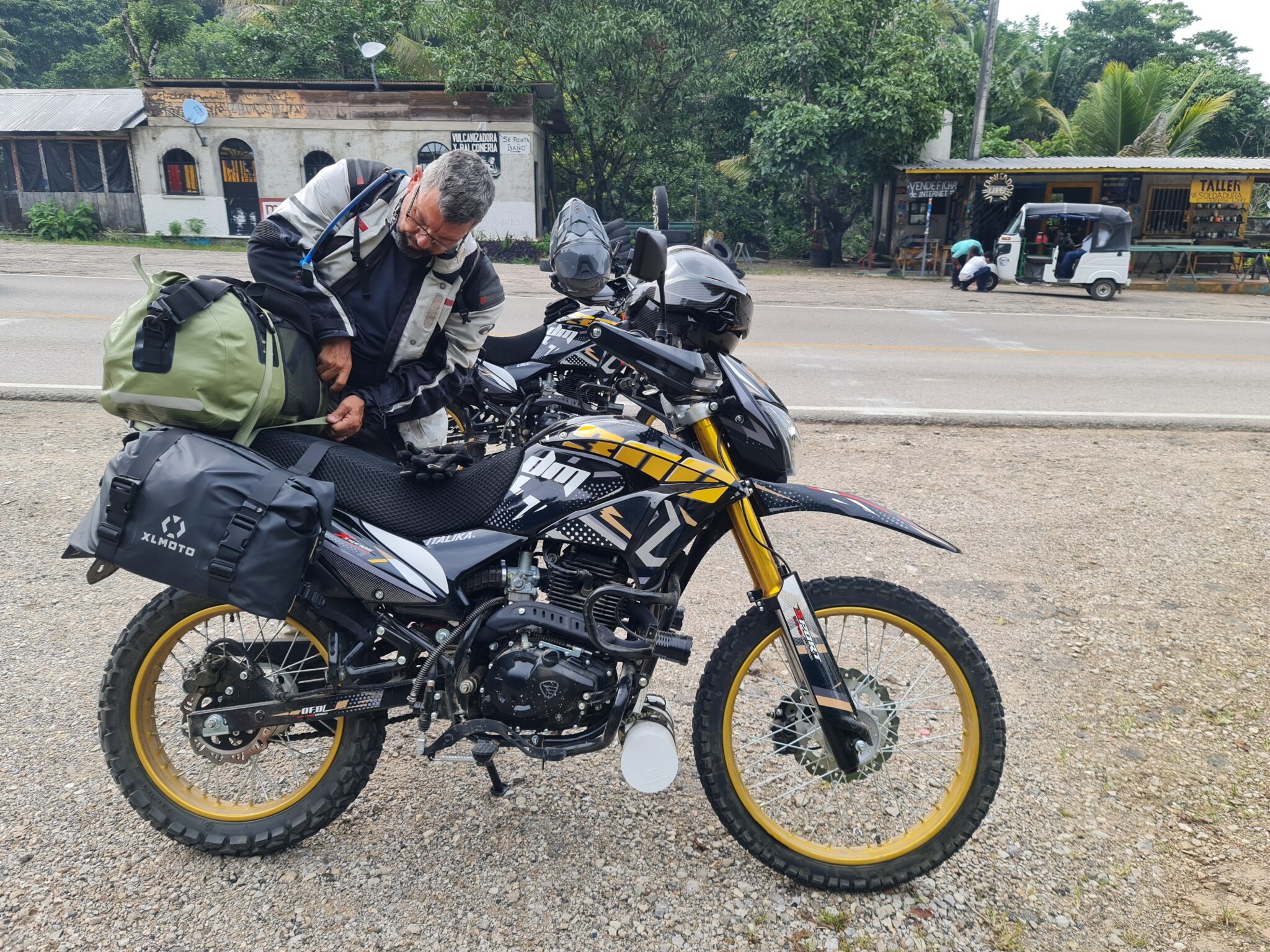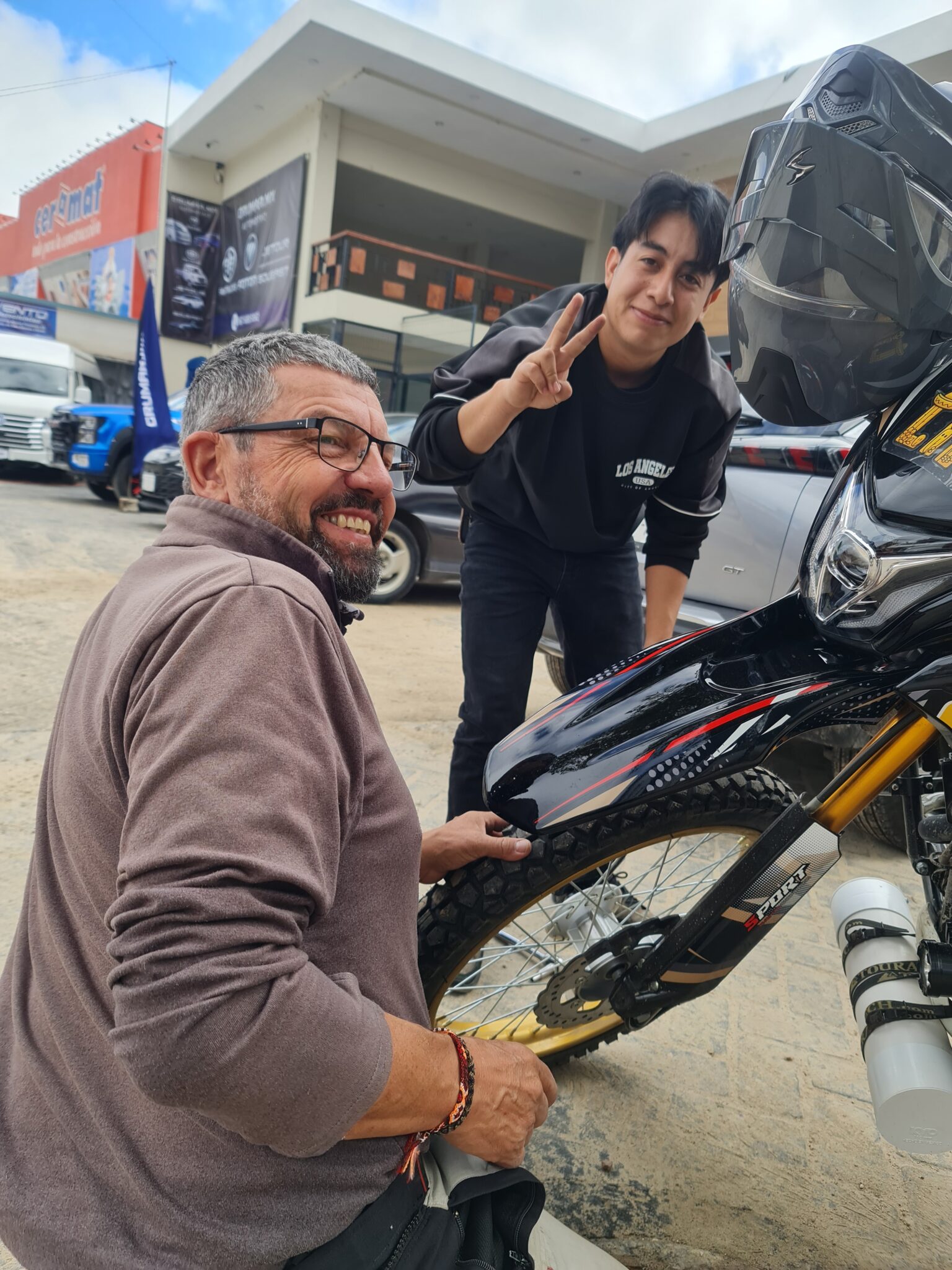 Bevor es losgeht, statten wir „unserem“ Motorradhändler noch einen letzten Besuch ab. Eine Halterung für das vordere Schutzblech fehlt uns nämlich noch. Orlando, unser Verkäufer, begrüßt uns strahlend – und zeigt uns stolz den Aufkleber von uns auf seinem Motorrad. Leider hat er das fehlende Teil nicht auf Lager.
