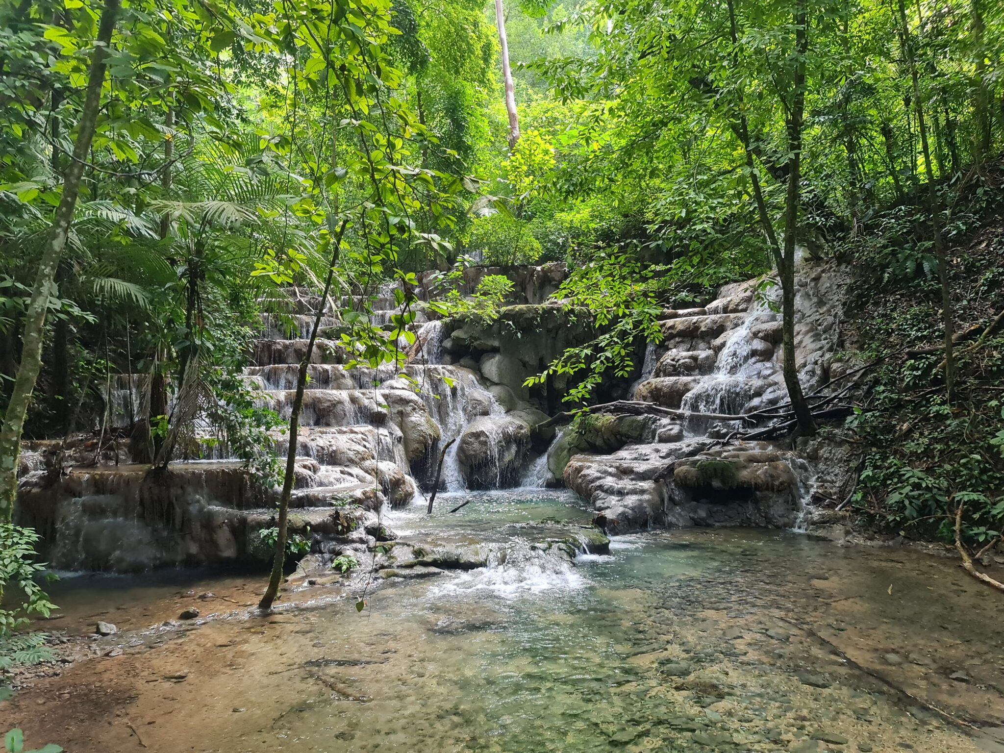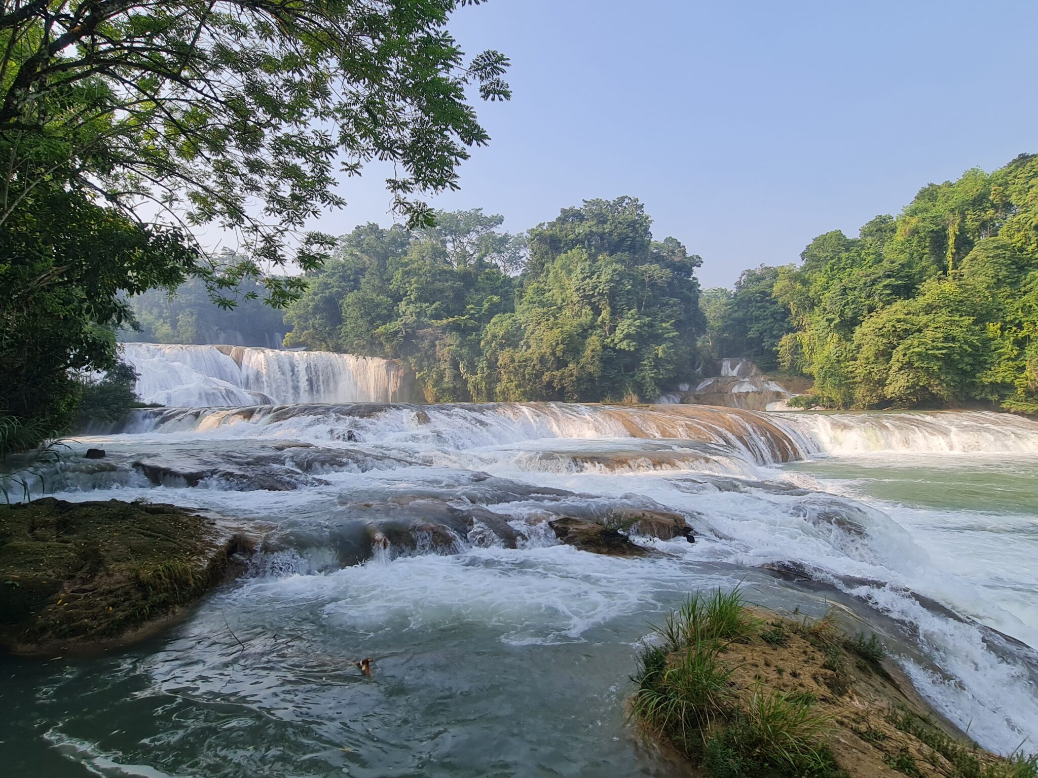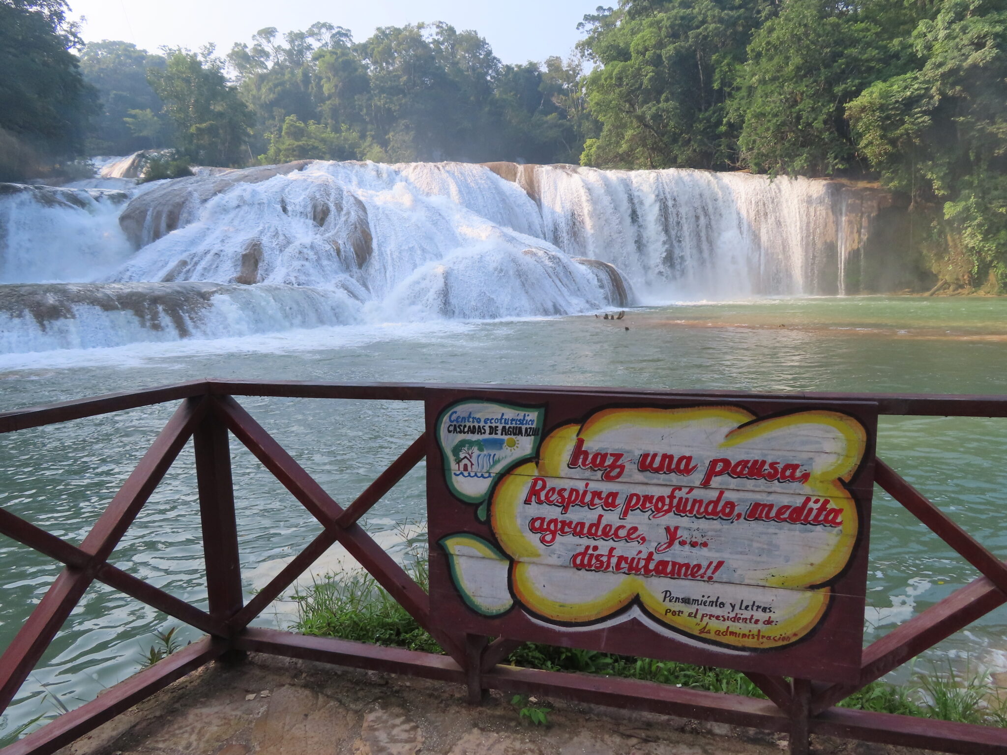 Nach einigen Wochen in der Stadt zieht es uns wieder in die Natur. Ich hatte von den Cascadas de Agua Azul gelesen – über 500 Wasserfälle in einer einzigartigen Dschungel -Landschaft! Allerdings erklärt uns jeder: „In der Regenzeit sind sie gar nicht blau.“ Wir hören das Bedauern aus der Aussage, aber wir sind nicht enttäuscht. Im Gegenteil. Denn die „falsche“ Jahreszeit bedeutet: wenig Touristen.