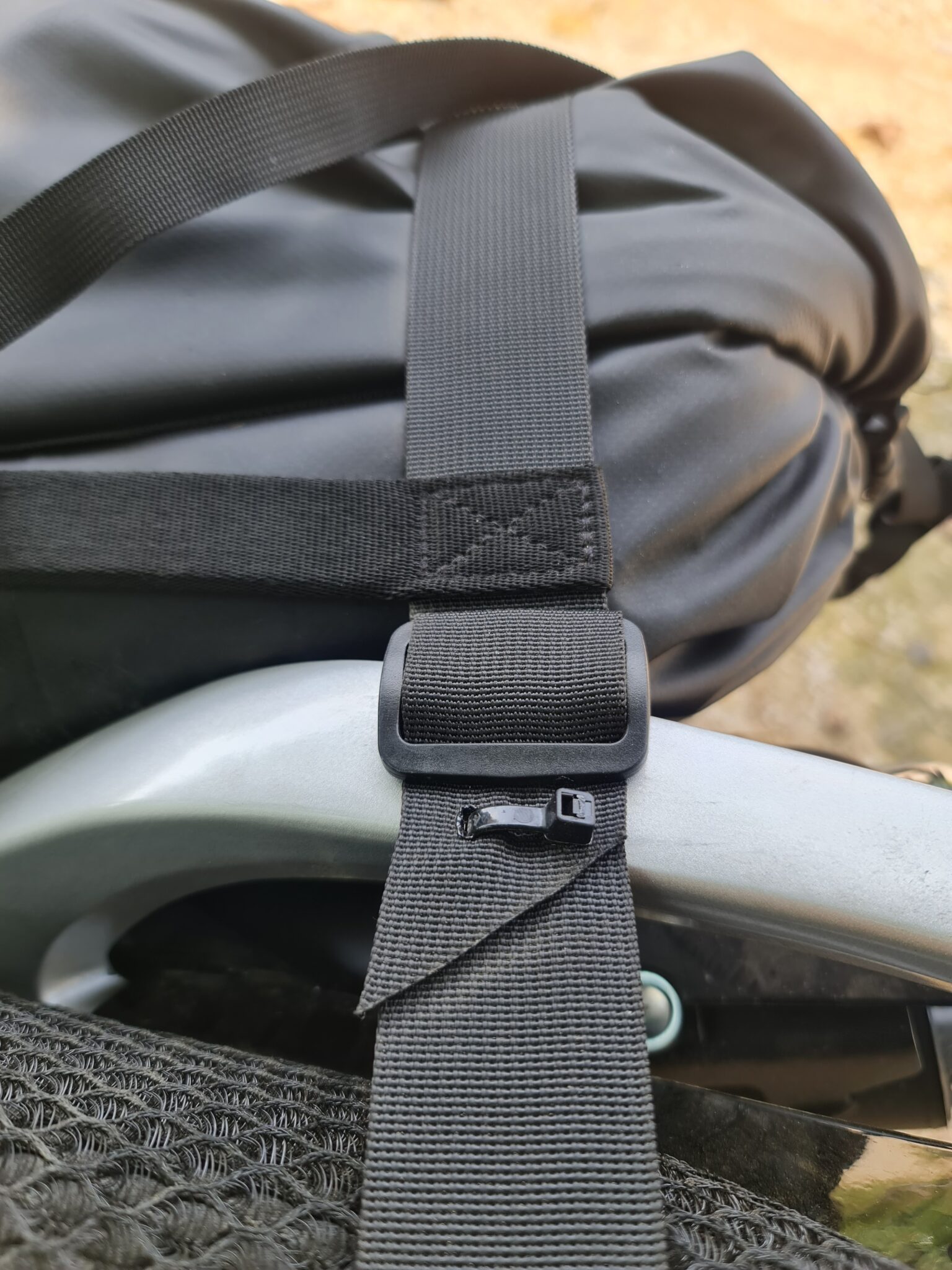 Bis Robert plötzlich ruft: „Stopp! Deine Tasche hängt schief!“ Natürlich auf der Auspuffseite. Shit, die Gepäcktasche ist angeschmort. Zum Glück habe ich ja meinen persönlichen Robert-MacGyver dabei. Er bohrt, schweißt, baut zusätzliche Sicherungen mit Kabelbindern ein – und die Taschen sitzen bombenfest. Das passiert uns nicht nochmal.