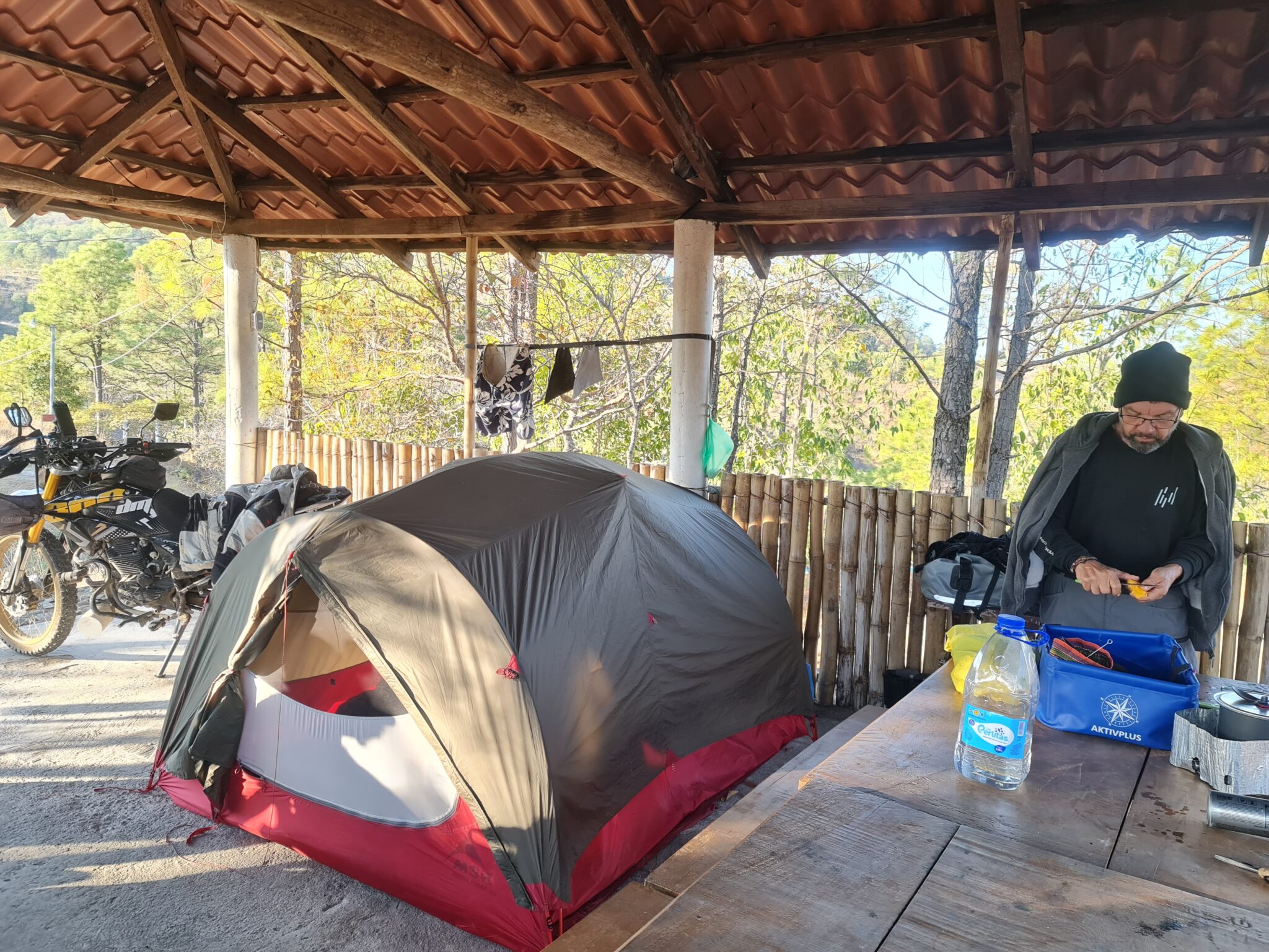 Nach einem kurzen Zwischenstopp in Ilobasco zieht es uns schon bald wieder in die Berge. Zu verlockend sind diese unglaublich steilen, kurvigen Strecken. Schließlich finden wir einen Campingplatz in der Nähe von Perquín auf etwa 1200 Metern Höhe – hoch genug, um abends den Hoodie hervorzuholen. Und Robert greift natürlich auch gleich wieder zu seiner „Schlafimütze“, die bei Nachttemperaturen unter 15 Grad für seine empfindliche Seele unverzichtbar ist.