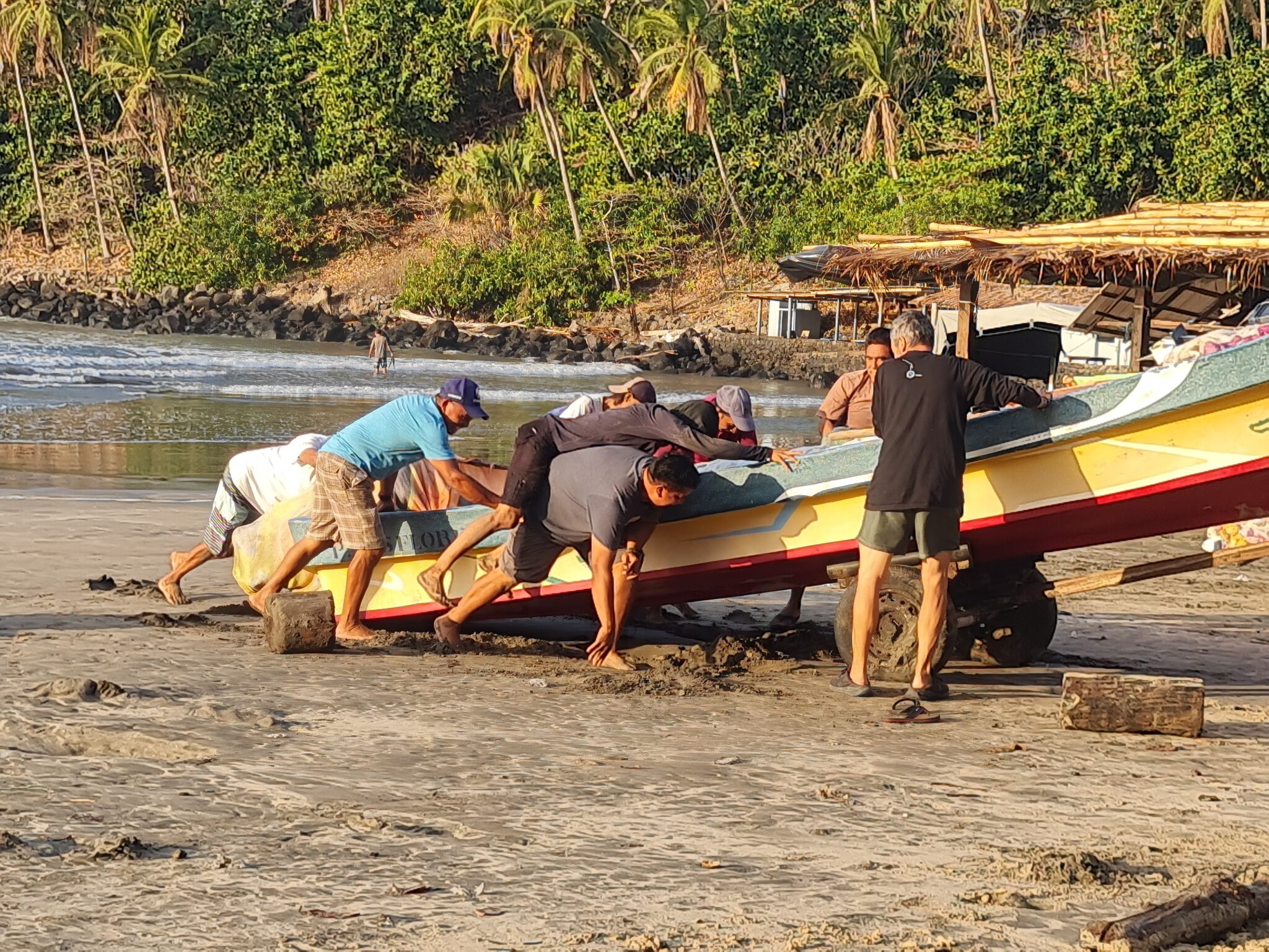 Wir schlagen unser Zelt direkt neben den Fischerbooten auf. Wir sind so entspannt, das wir sogar zu faul sind mit dem Motorrad ins Dorf zu fahren. Trampen geht hier wunderbar. Jeweils der erste Pickup hält an…..